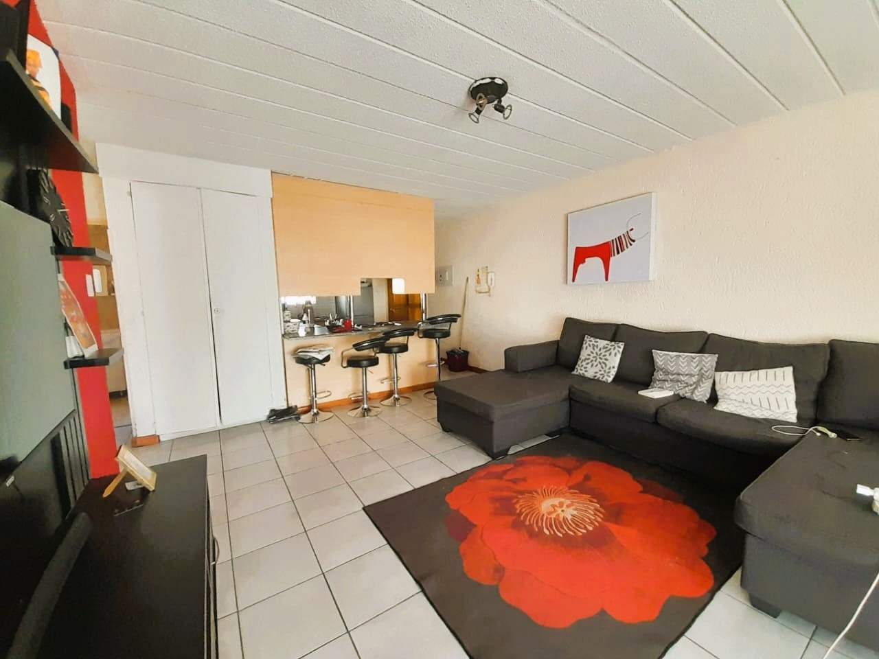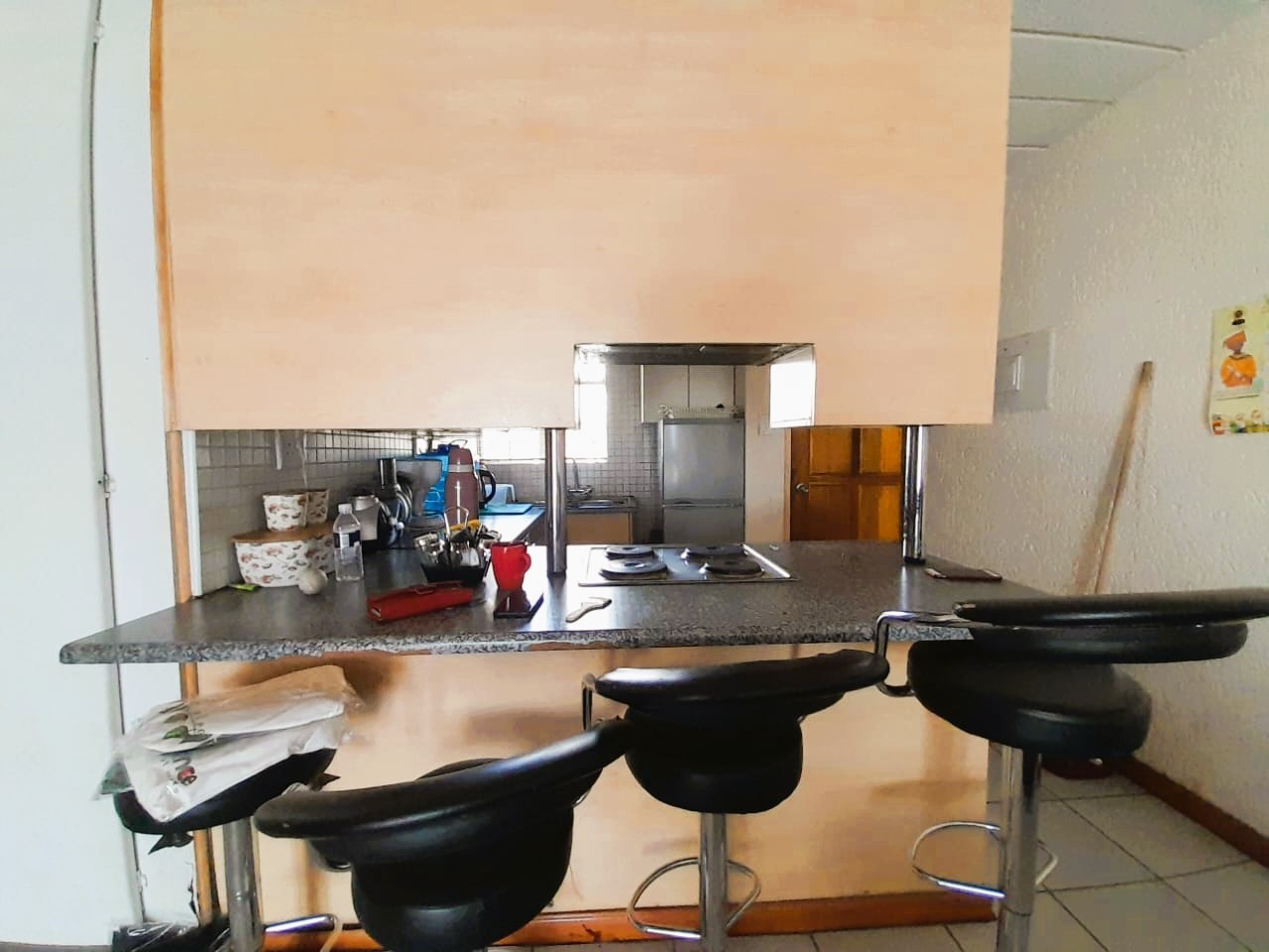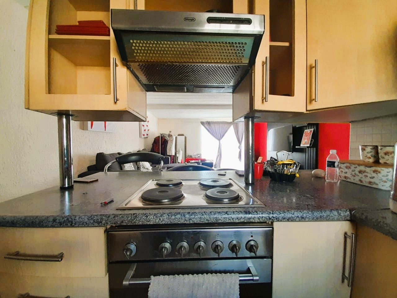 The interior features an open-plan layout, seamlessly connecting the lounge, dining area, and kitchen. The functional kitchen is equipped with ample light wood cabinetry, granite-look countertops, an integrated electric hob, and an oven, providing a practical space for daily living. Natural light enhances the living areas, creating a welcoming atmosphere.