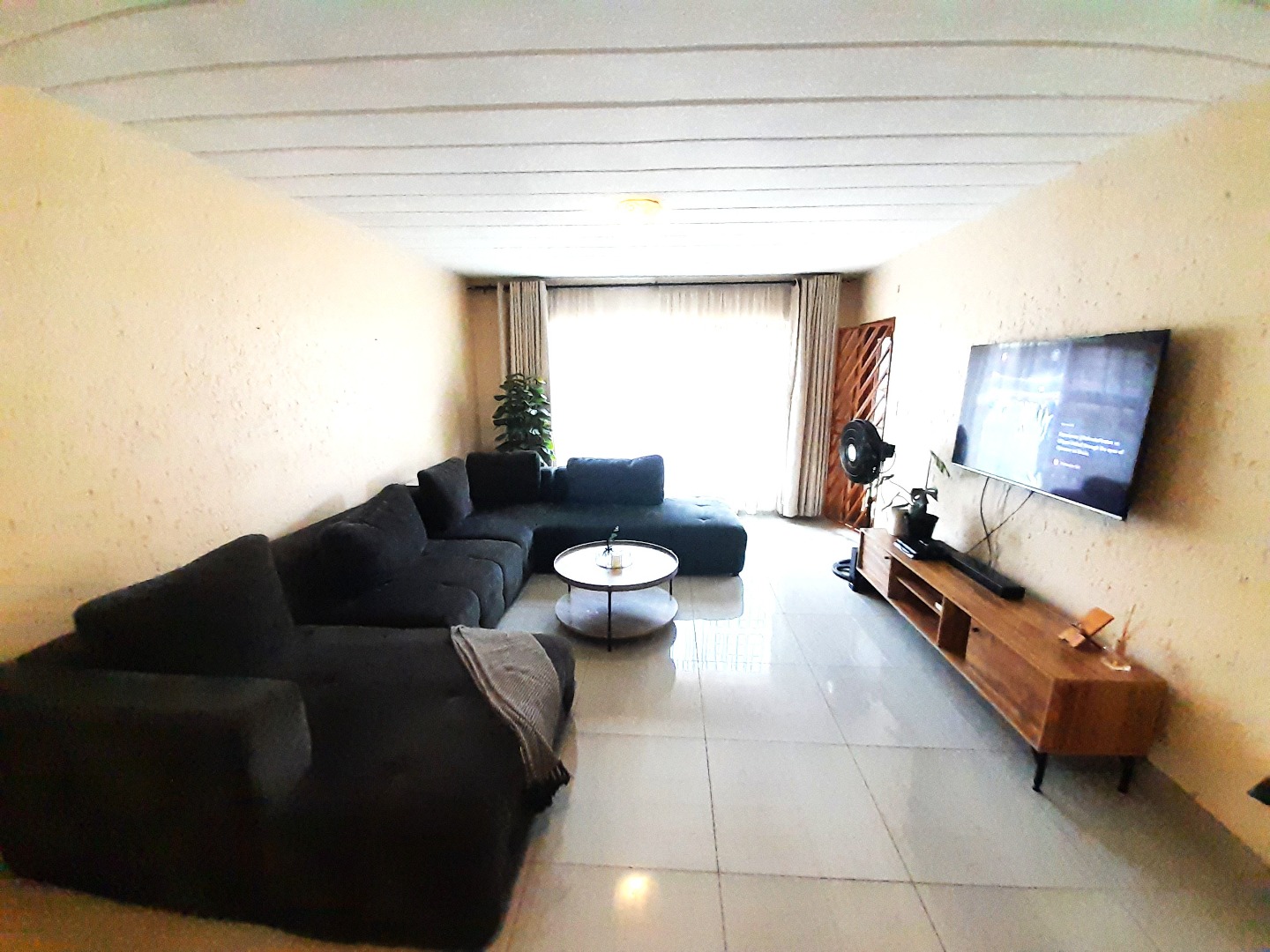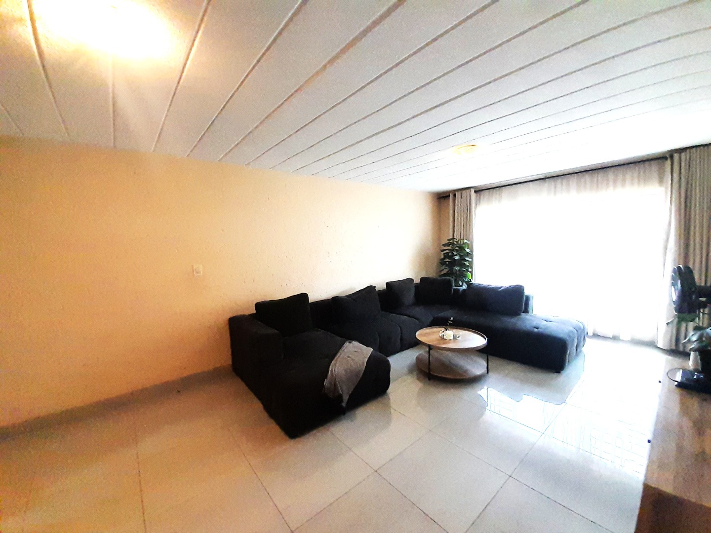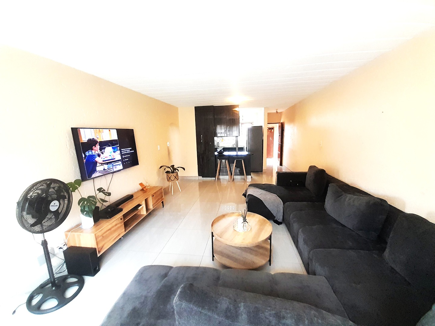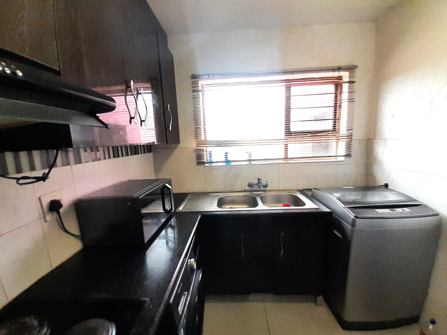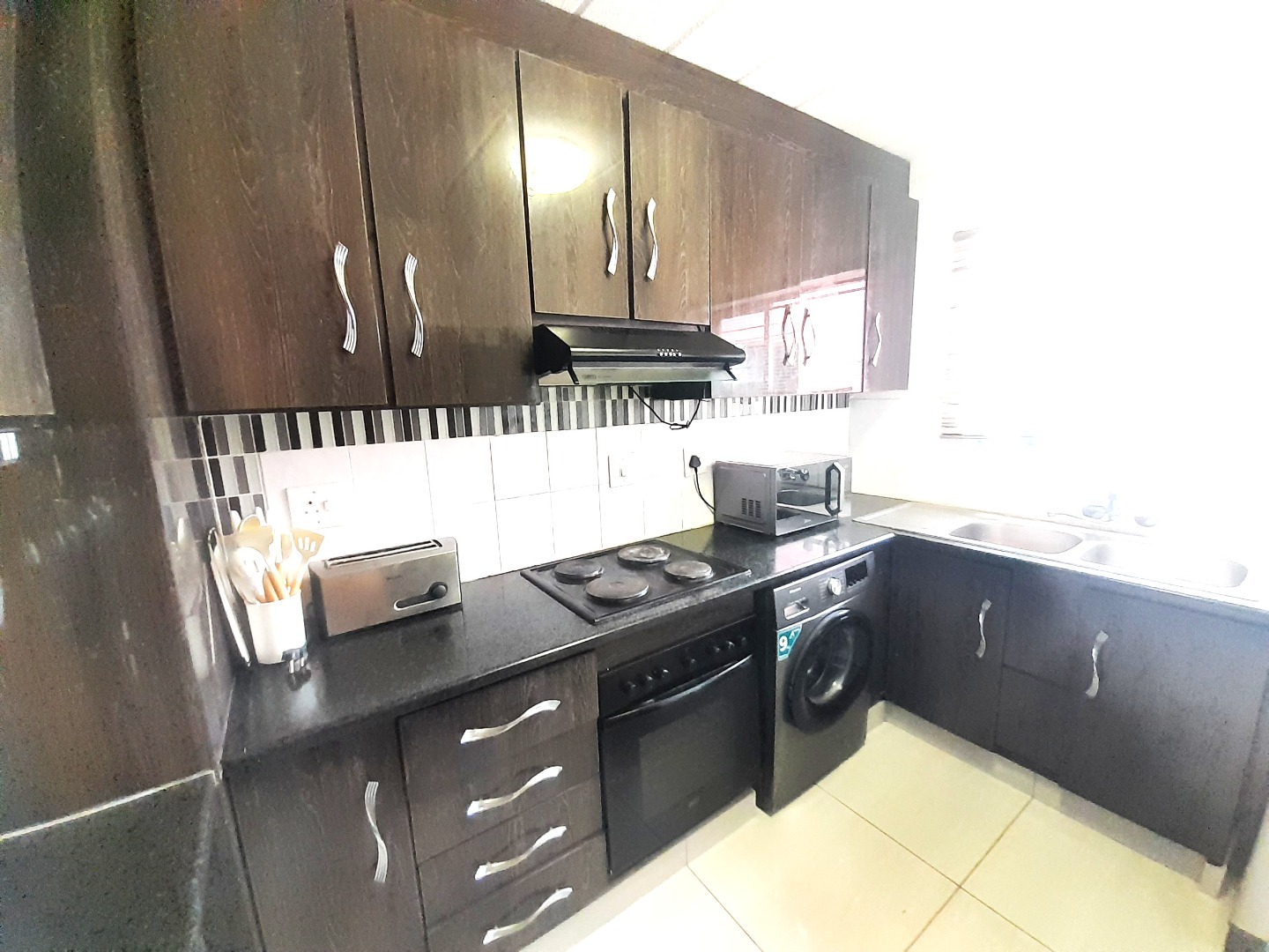 The interior boasts an open-plan layout, creating a seamless flow between the living areas. The lounge is spacious, featuring contemporary tiled flooring and ample natural light, ideal for relaxation or entertaining. The compact, L-shaped kitchen is efficiently designed with modern dark wood-look cabinetry, sleek black countertops, and a stylish mosaic tile backsplash.
