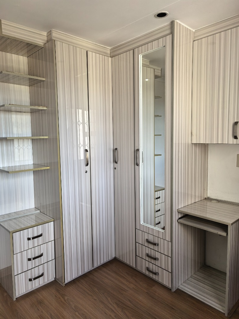 Accommodation includes three well-proportioned bedrooms and two and a half bathrooms, ensuring convenience for all residents. The property extends its appeal outdoors with a private, lush garden area, perfect for relaxation. Enjoy panoramic views of distant hills from the balcony, providing a serene backdrop to your daily life.