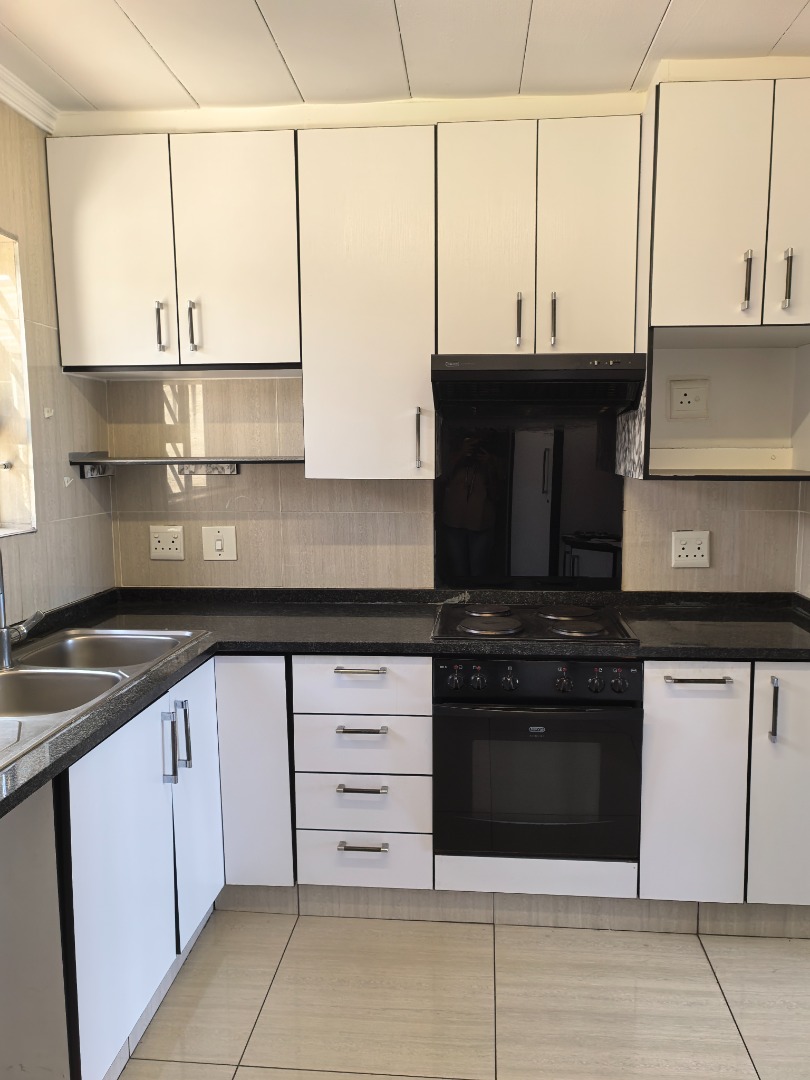 The modern kitchen is a highlight, boasting sleek white cabinetry with dark trim, ample storage, and dark granite-look countertops. It comes equipped with a double stainless steel sink, a built-in electric oven and hob, and a tiled backsplash for easy maintenance. Natural light floods the space through large windows, which are fitted with security bars for peace of mind. Adjacent living areas are spacious offer direct access to an outdoor space via a sliding glass door.