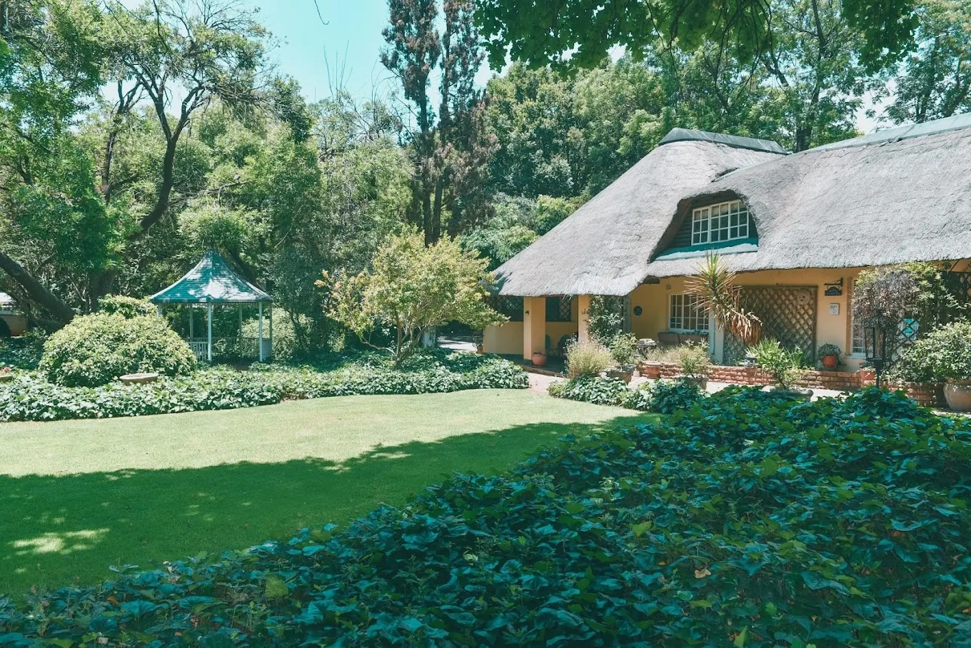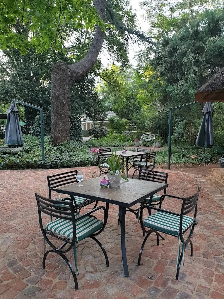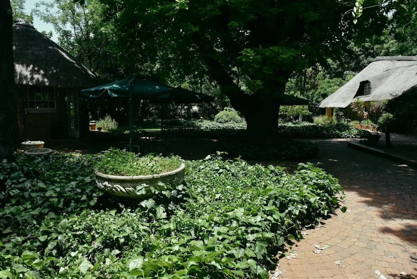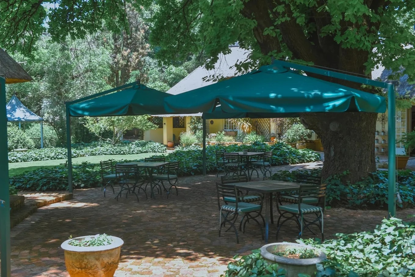 A charming garden kitchen and restaurant from the heart of the property, featuring a welcoming indoor lounge area as well as outdoor seating set within lush, tranquil gardens that offer guests a serene retreat and beautiful natural surroundings.