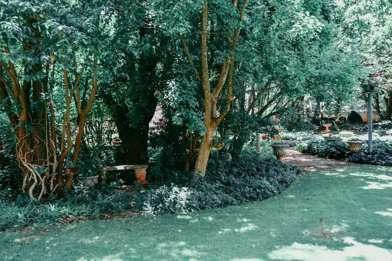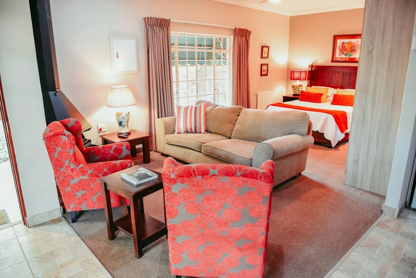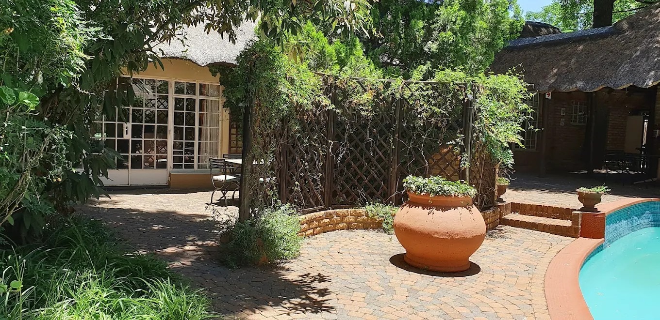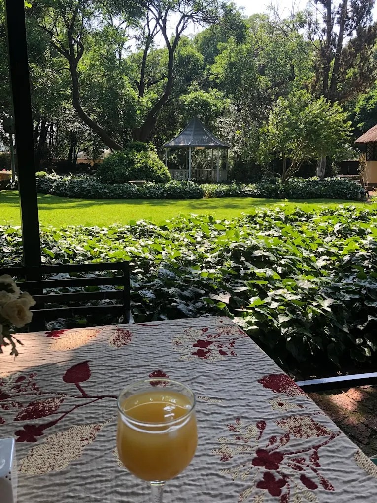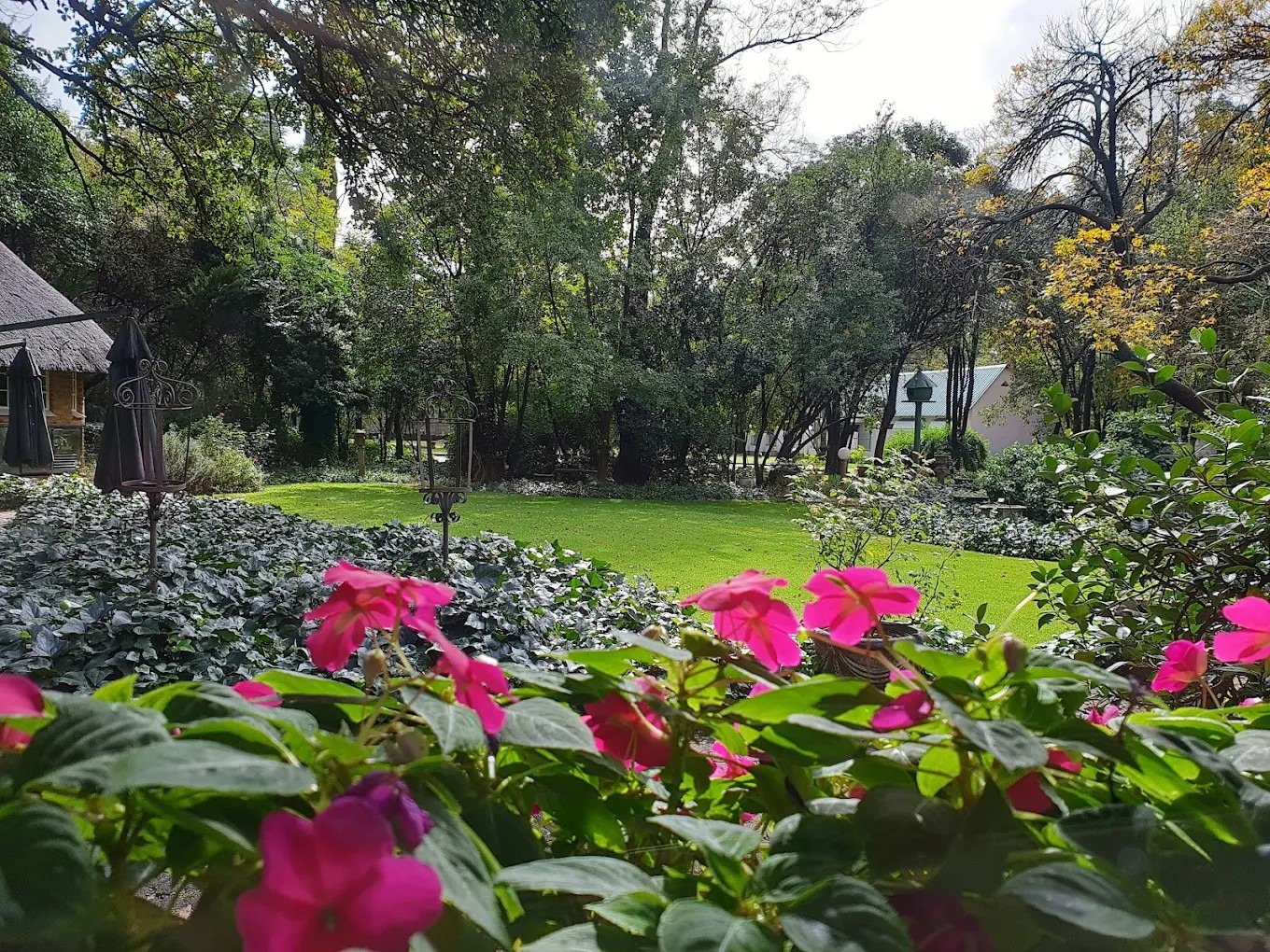 A charming garden kitchen and restaurant from the heart of the property, featuring a welcoming indoor lounge area as well as outdoor seating set within lush, tranquil gardens that offer guests a serene retreat and beautiful natural surroundings.