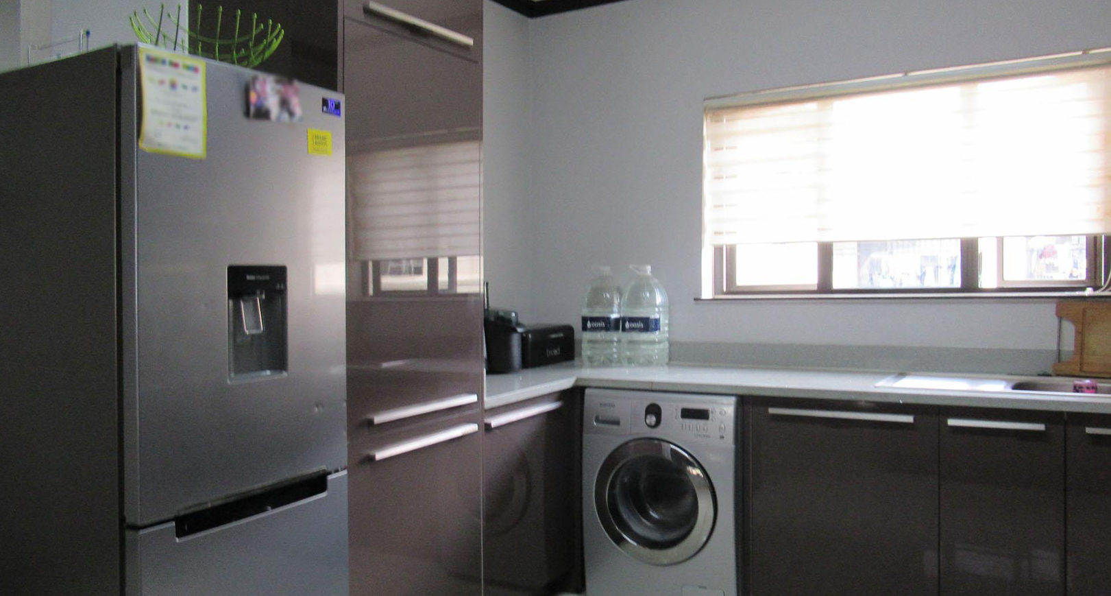 The interior boasts a comfortable lounge area, bathed in natural light from large sliding doors that open to an outdoor space, perfect for relaxation or entertaining. The modern kitchen is a highlight, equipped with sleek dark cabinetry, built-in hob and oven, and ample countertop space, seamlessly integrating with the living areas. An integrated washing machine adds to the convenience of this well-appointed space.