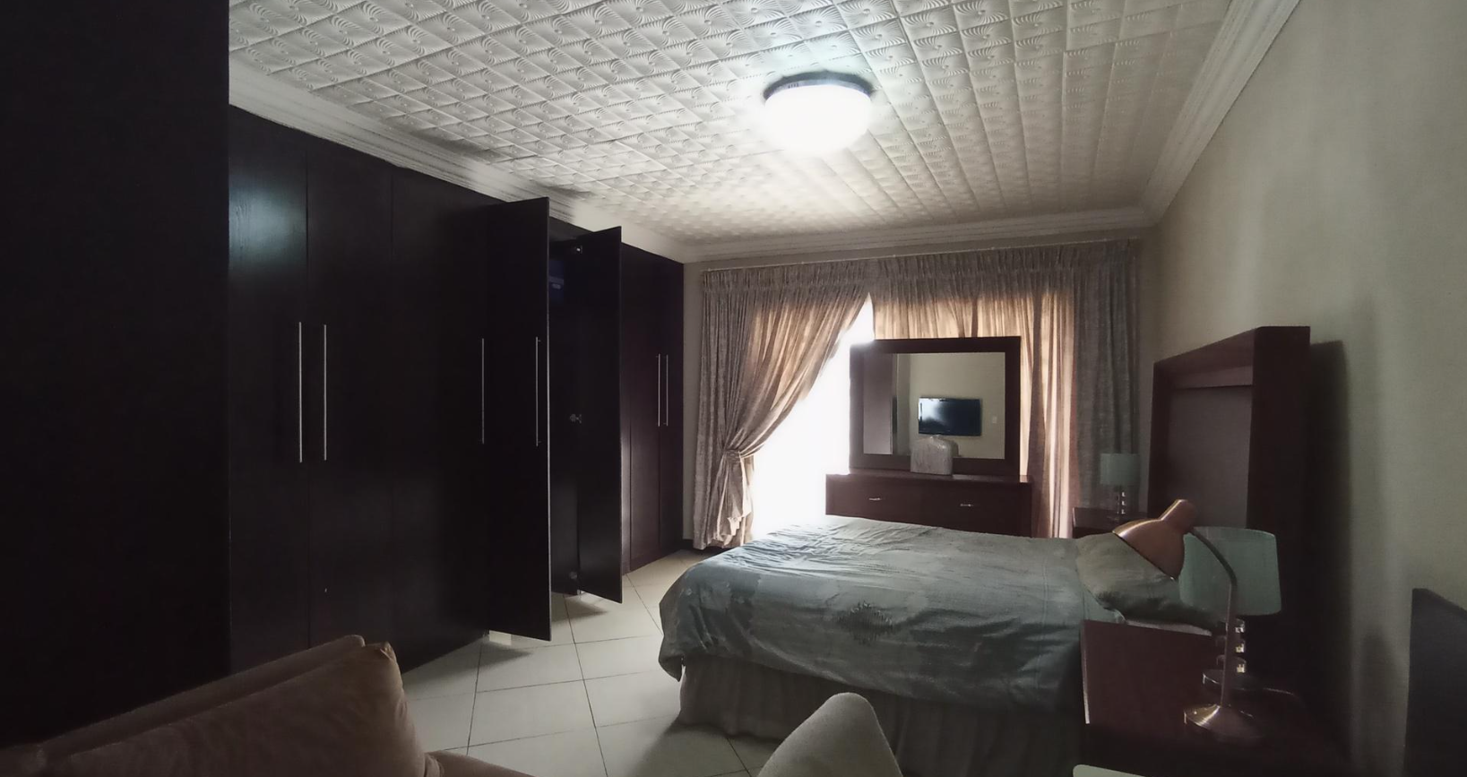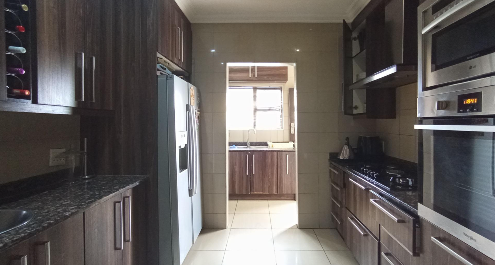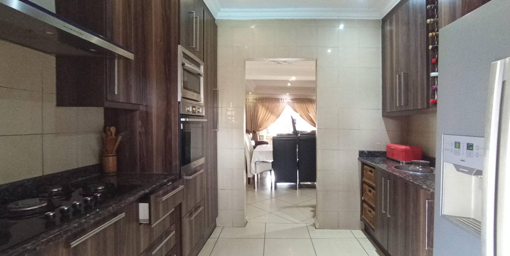 Step inside to an intelligently designed open-plan living and dining area, featuring neutral-toned walls, elegant tiled flooring, and modern recessed lighting complemented by decorative crown molding. A striking stone-clad accent wall adds character to the lounge, which also includes a dedicated family TV room. The heart of the home, the kitchen, boasts modern dark wood-look cabinetry, sleek granite countertops, and integrated appliances such as a built-in oven, microwave, and gas hob. A large stainless steel refrigerator, integrated wine rack, double sink, and a convenient pantry complete this functional and stylish space.