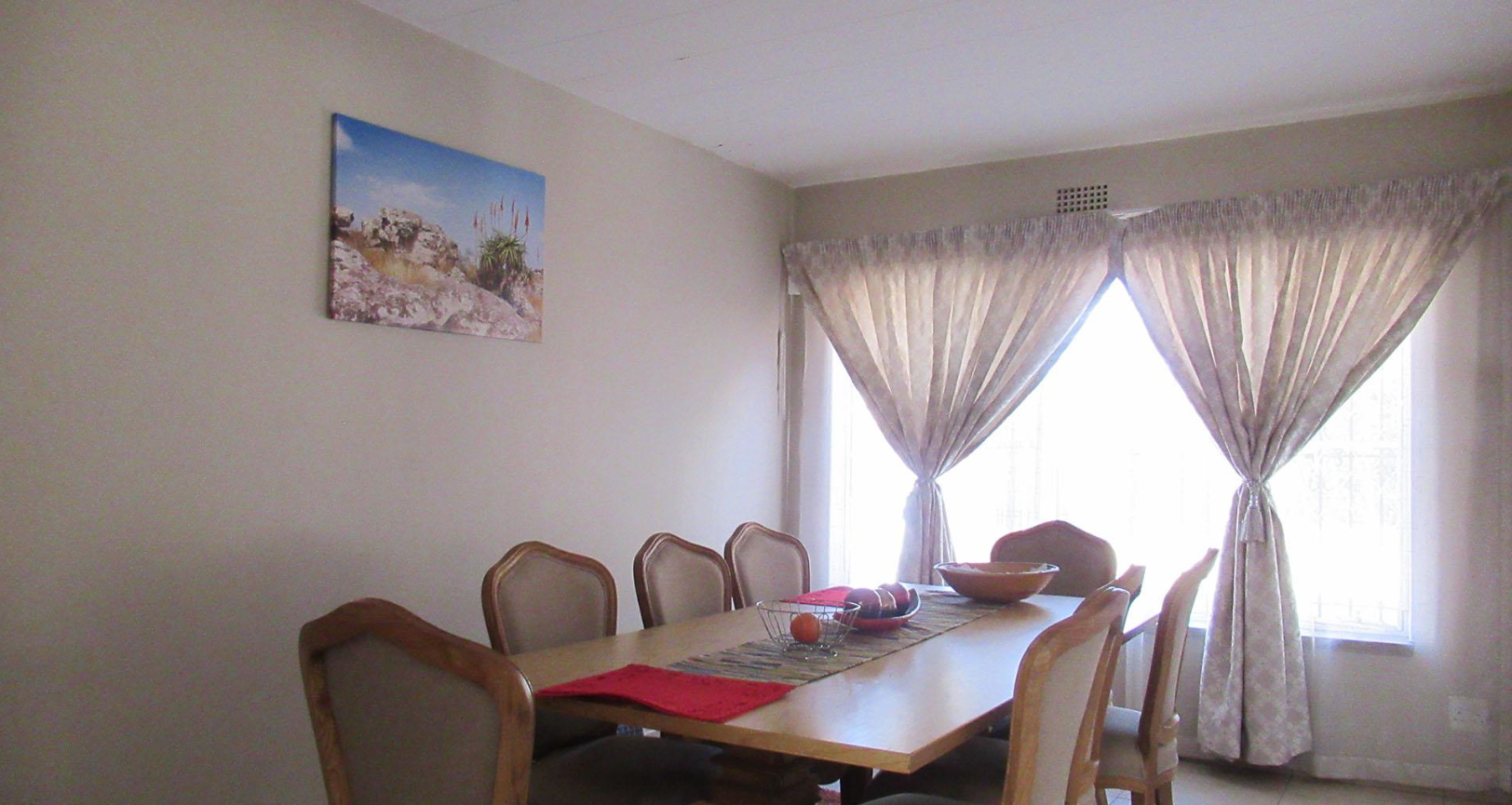 Step outside to discover a private, pet-friendly garden and a refreshing swimming pool, perfect for relaxation and entertaining during warmer months. The property is secured with perimeter fencing, an access gate, and robust burglar bars on windows, offering enhanced peace of mind for residents. The extensive paving around the exterior adds to the neatness and low-maintenance appeal.