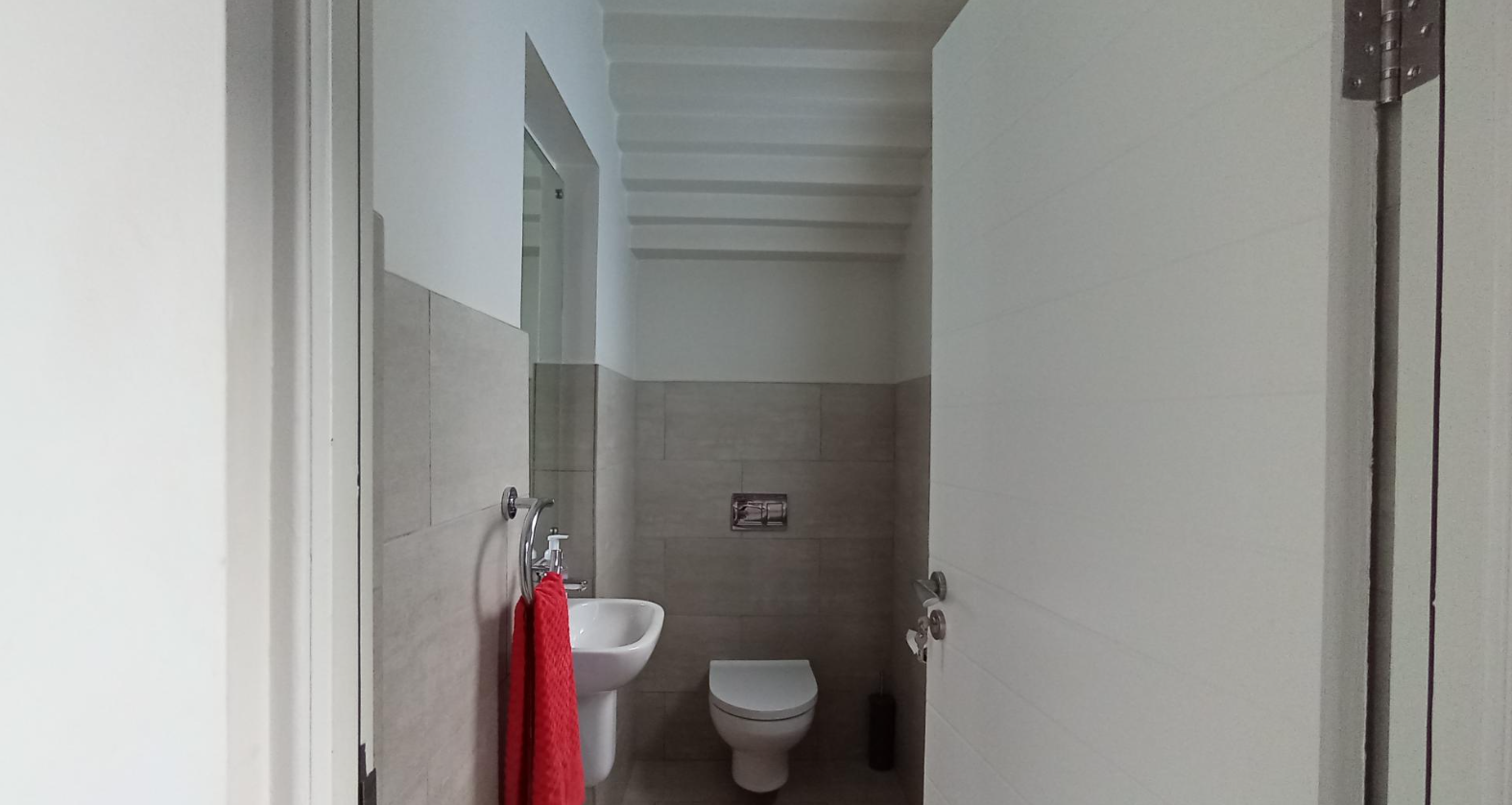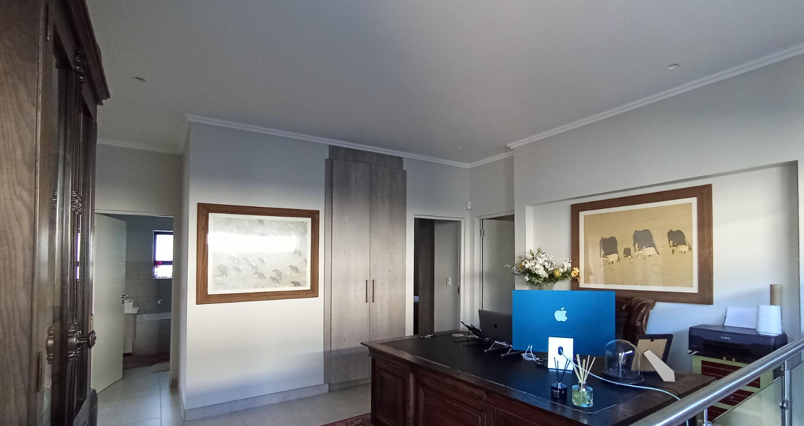 This distinguished home offers four generously proportioned bedrooms and three luxurious bathrooms, providing ample comfort and privacy. Bathrooms feature modern fixtures and clean, neutral tiling, with a chic powder room showcasing a decorative slatted ceiling.