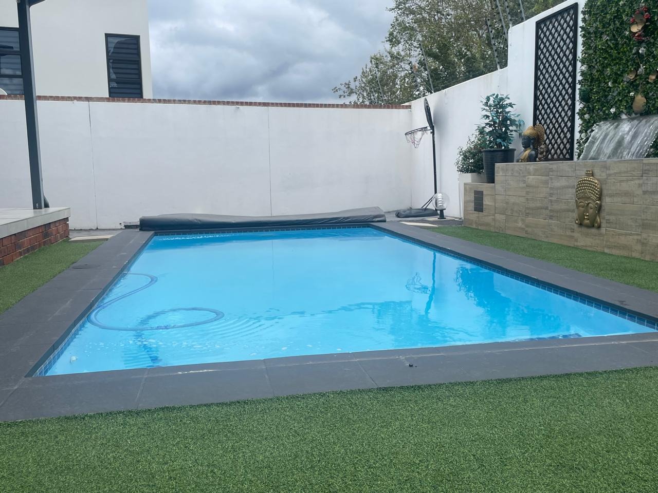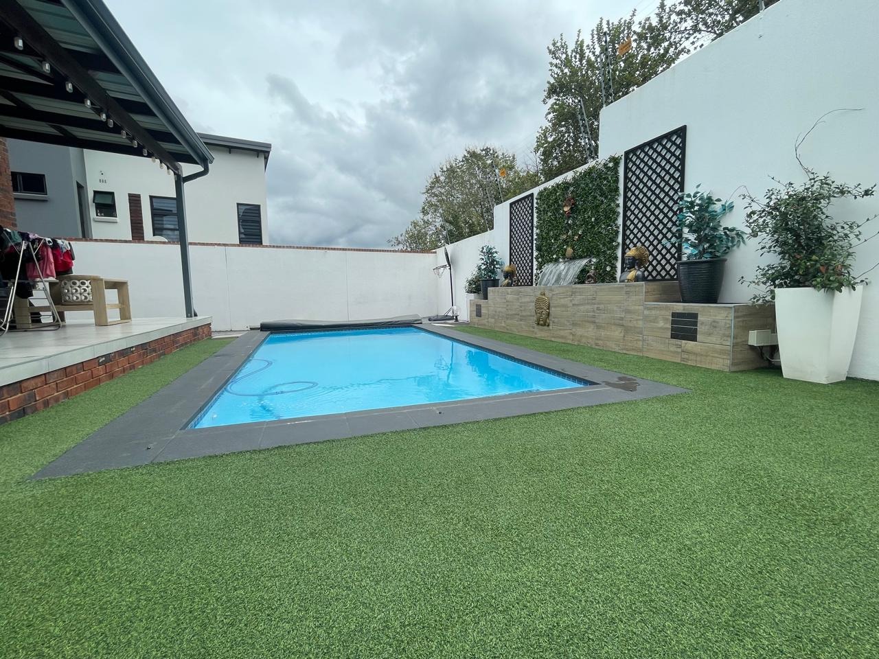Beautiful swimming pool with solar heating and water feature