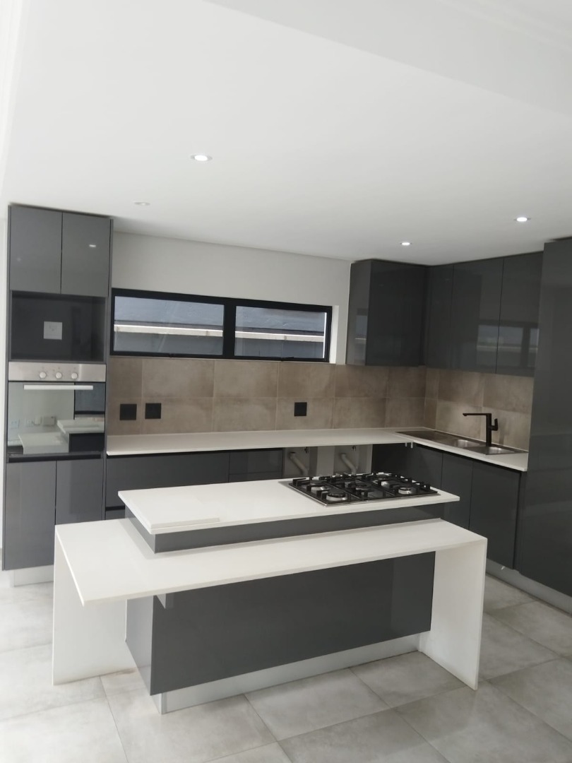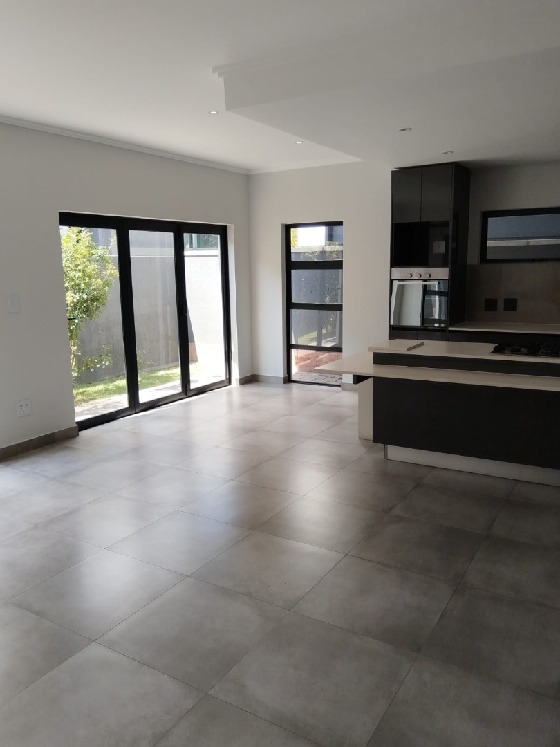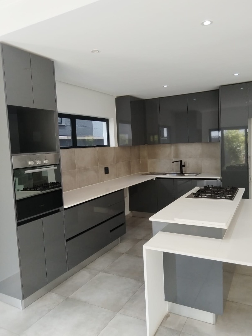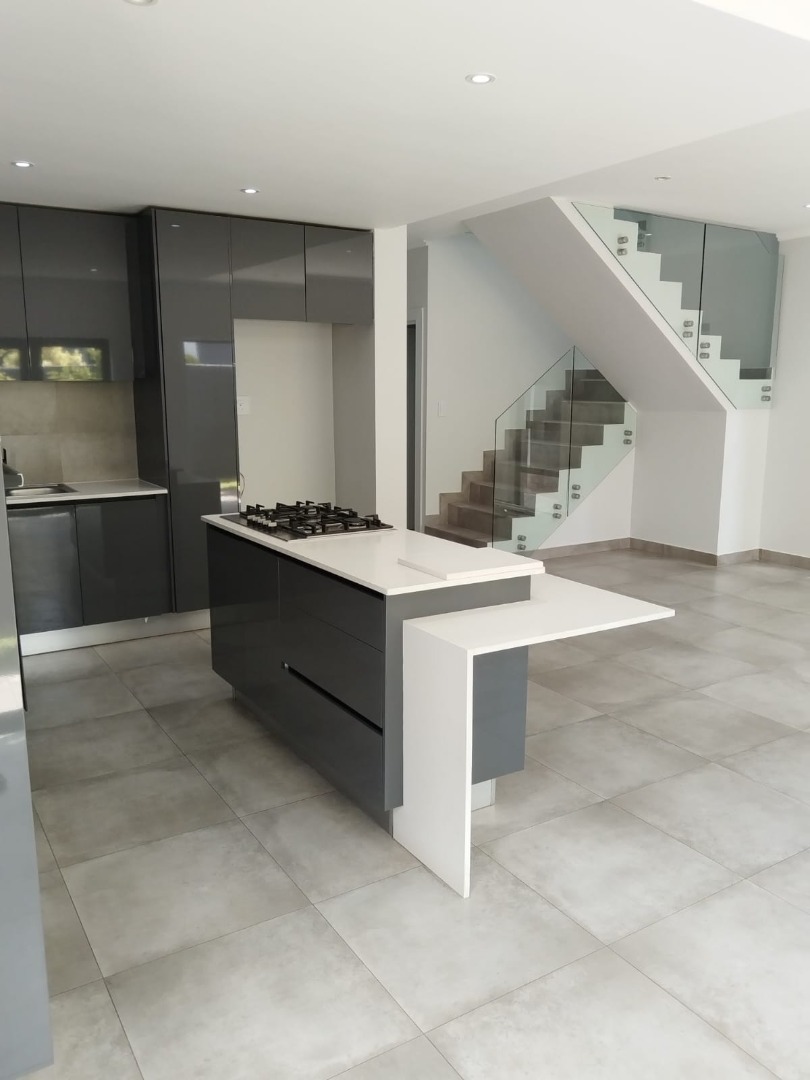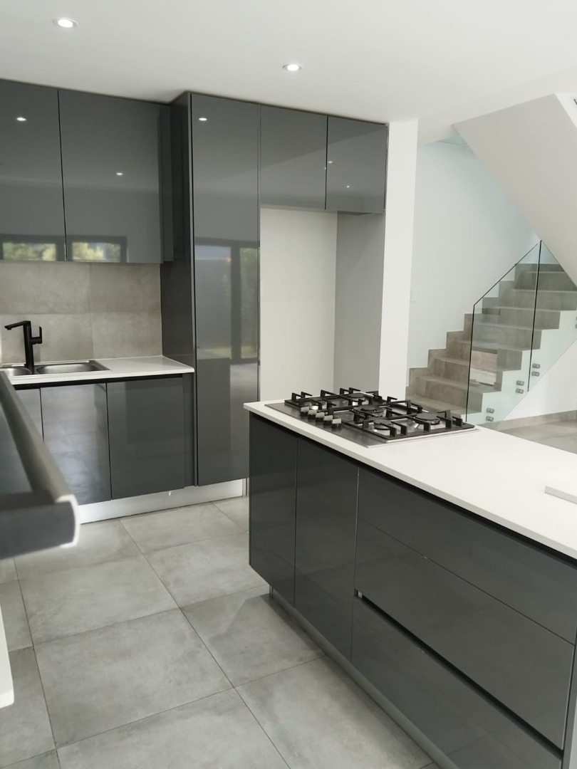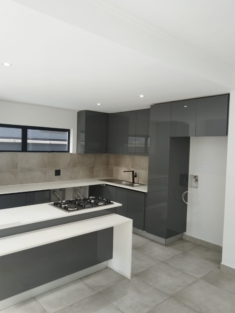 This modern residential sale property in Edenburg, Sandton, offers contemporary living within a secure estate. The sleek, dark-toned architecture provides excellent kerb appeal. Inside, you will discover an open-plan layout featuring a modern kitchen with glossy dark grey cabinets and an island with an integrated stovetop, flowing into the dining and lounge areas. This home boasts three spacious bedrooms, each with an en-suite bathroom, plus a convenient guest toilet. Enjoy outdoor living with a private patio and balconies, complemented by a garden. Security is paramount with 24-hour security, CCTV, an alarm, electric fencing, and access gates. Fibre connectivity is available. Two garages provide ample parking.
