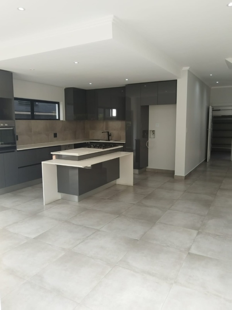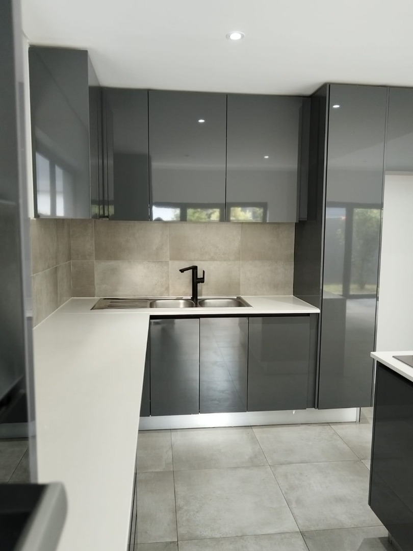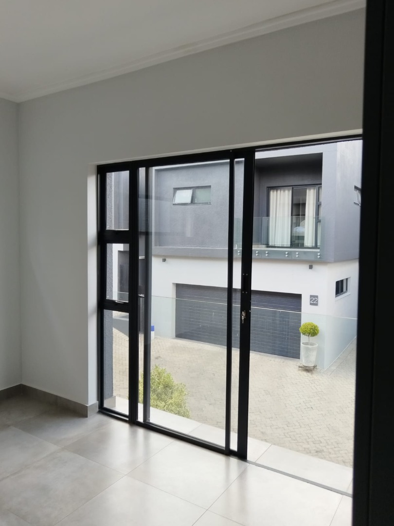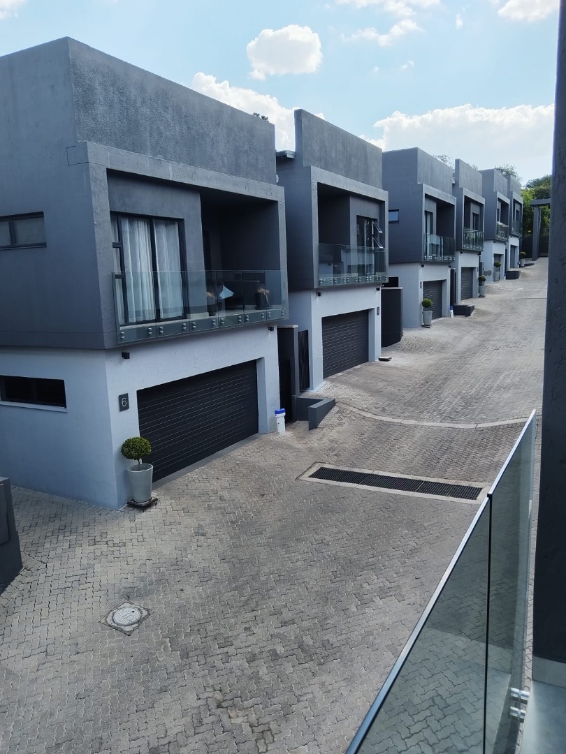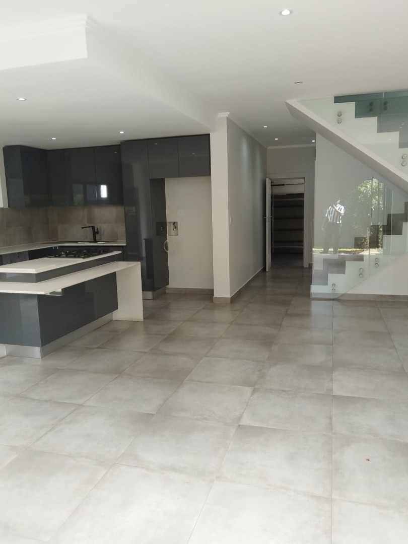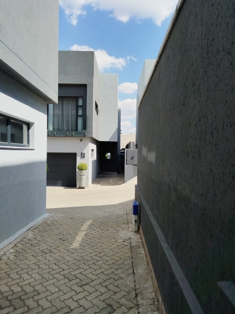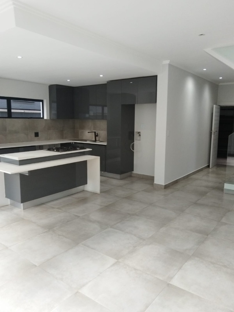 This modern residential sale property in Edenburg, Sandton, offers contemporary living within a secure estate. The sleek, dark-toned architecture provides excellent kerb appeal. Inside, you will discover an open-plan layout featuring a modern kitchen with glossy dark grey cabinets and an island with an integrated stovetop, flowing into the dining and lounge areas. This home boasts three spacious bedrooms, each with an en-suite bathroom, plus a convenient guest toilet. Enjoy outdoor living with a private patio and balconies, complemented by a garden. Security is paramount with 24-hour security, CCTV, an alarm, electric fencing, and access gates. Fibre connectivity is available. Two garages provide ample parking.