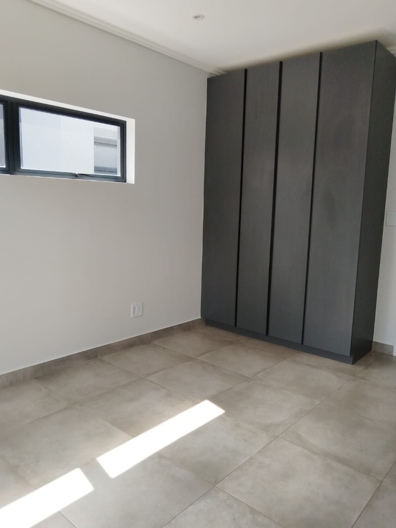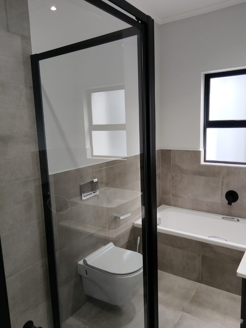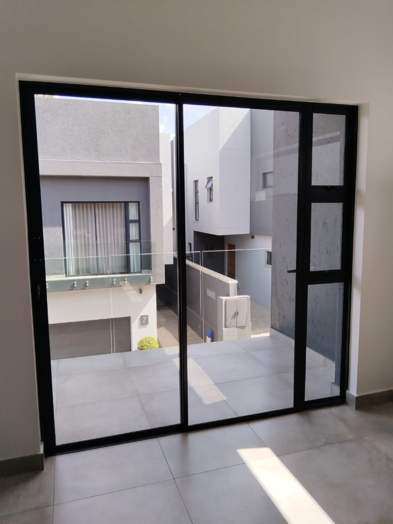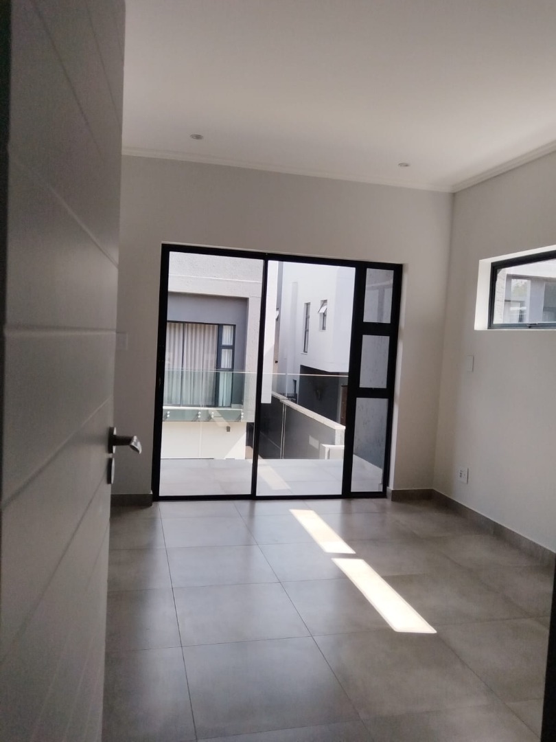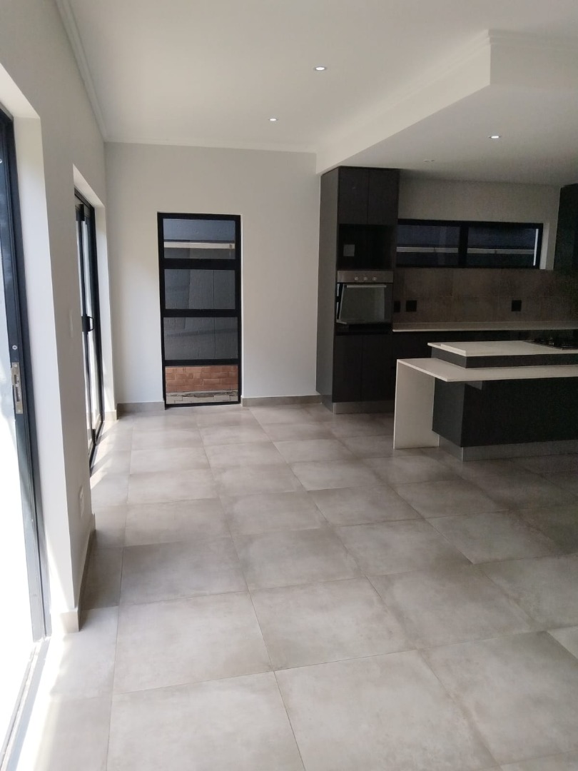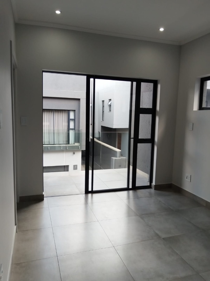 This modern residential sale property in Edenburg, Sandton, offers contemporary living within a secure estate. The sleek, dark-toned architecture provides excellent kerb appeal. Inside, you will discover an open-plan layout featuring a modern kitchen with glossy dark grey cabinets and an island with an integrated stovetop, flowing into the dining and lounge areas. This home boasts three spacious bedrooms, each with an en-suite bathroom, plus a convenient guest toilet. Enjoy outdoor living with a private patio and balconies, complemented by a garden. Security is paramount with 24-hour security, CCTV, an alarm, electric fencing, and access gates. Fibre connectivity is available. Two garages provide ample parking.