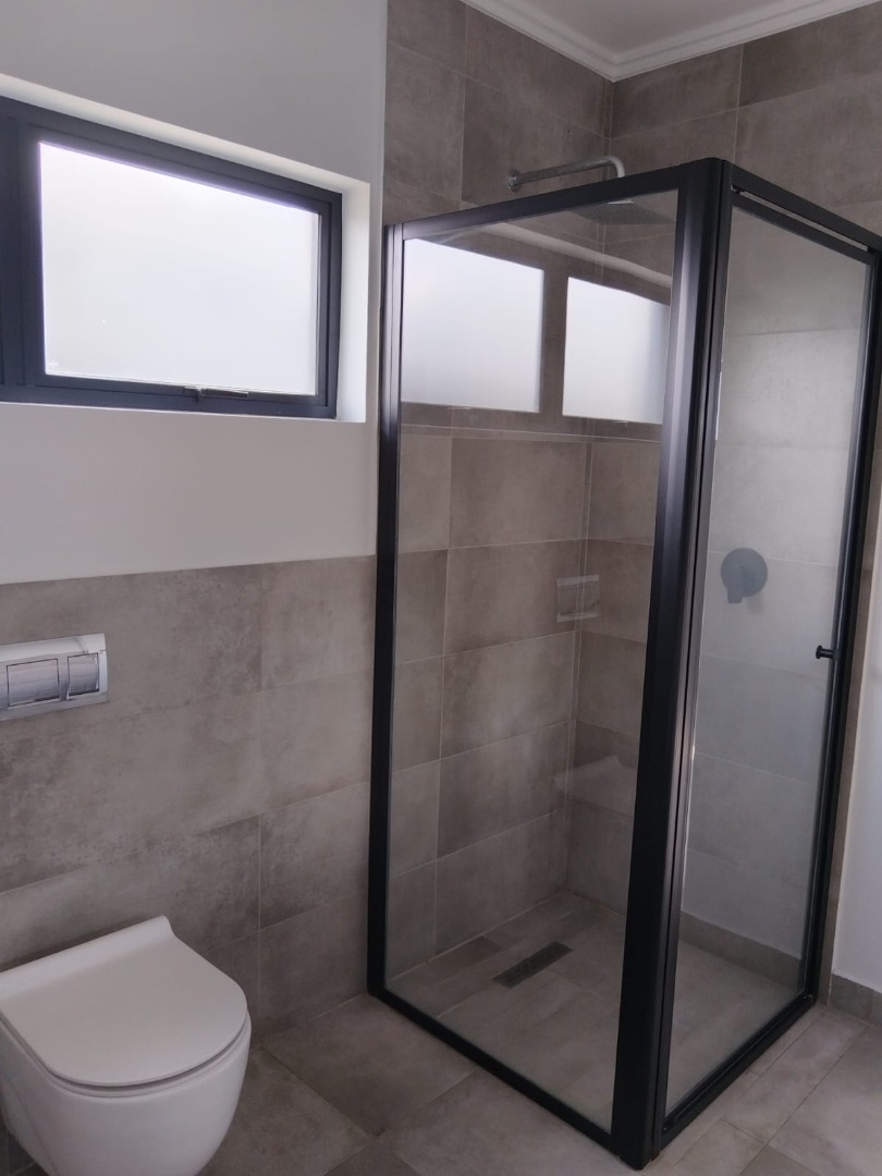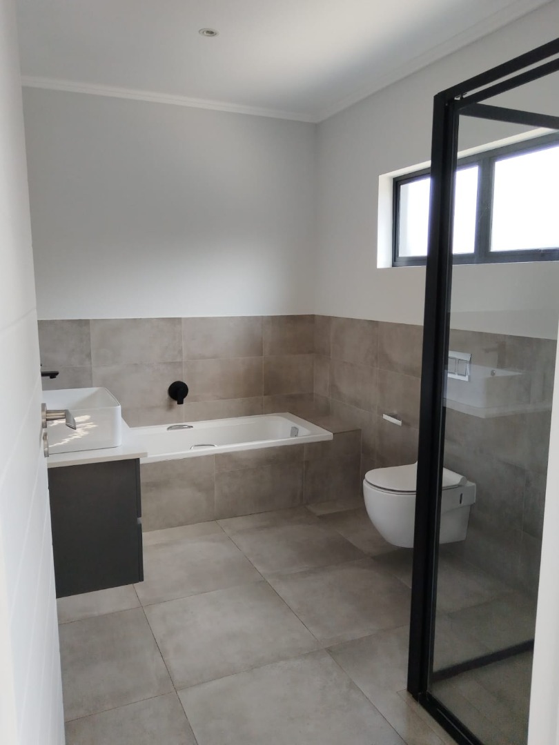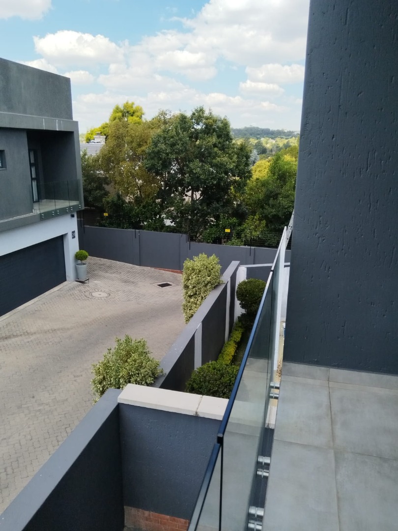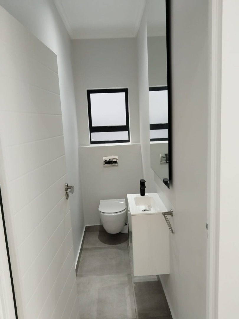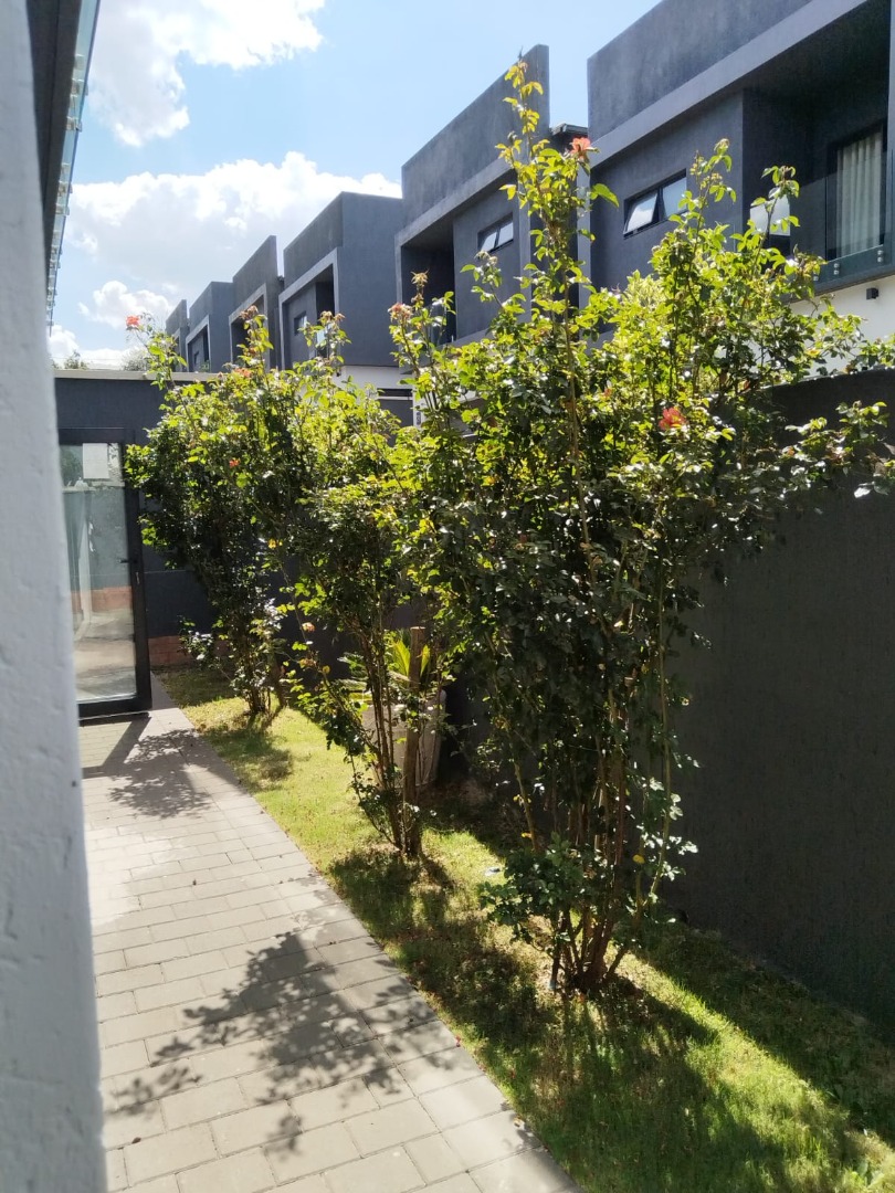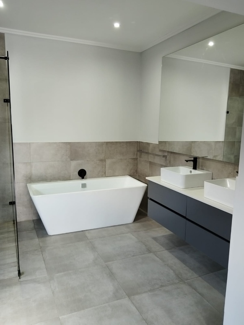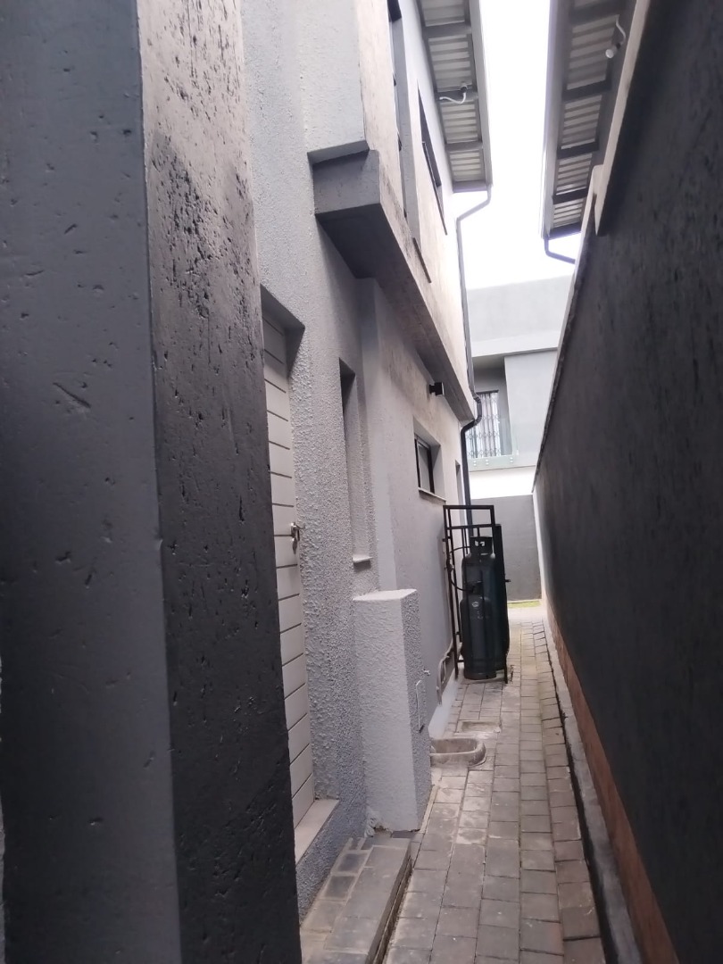 This modern residential sale property in Edenburg, Sandton, offers contemporary living within a secure estate. The sleek, dark-toned architecture provides excellent kerb appeal. Inside, you will discover an open-plan layout featuring a modern kitchen with glossy dark grey cabinets and an island with an integrated stovetop, flowing into the dining and lounge areas. This home boasts three spacious bedrooms, each with an en-suite bathroom, plus a convenient guest toilet. Enjoy outdoor living with a private patio and balconies, complemented by a garden. Security is paramount with 24-hour security, CCTV, an alarm, electric fencing, and access gates. Fibre connectivity is available. Two garages provide ample parking.
