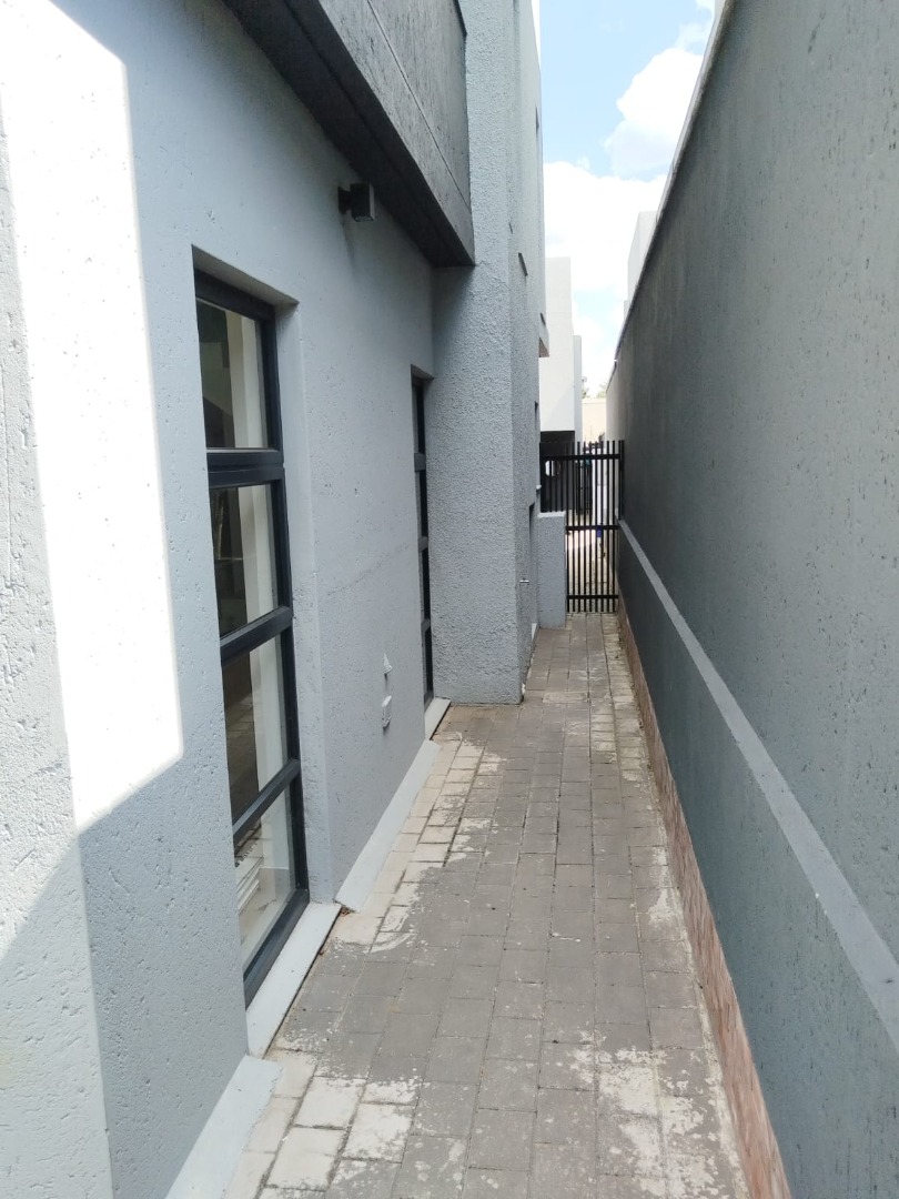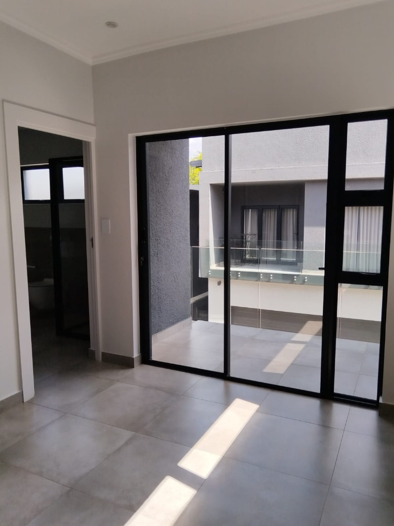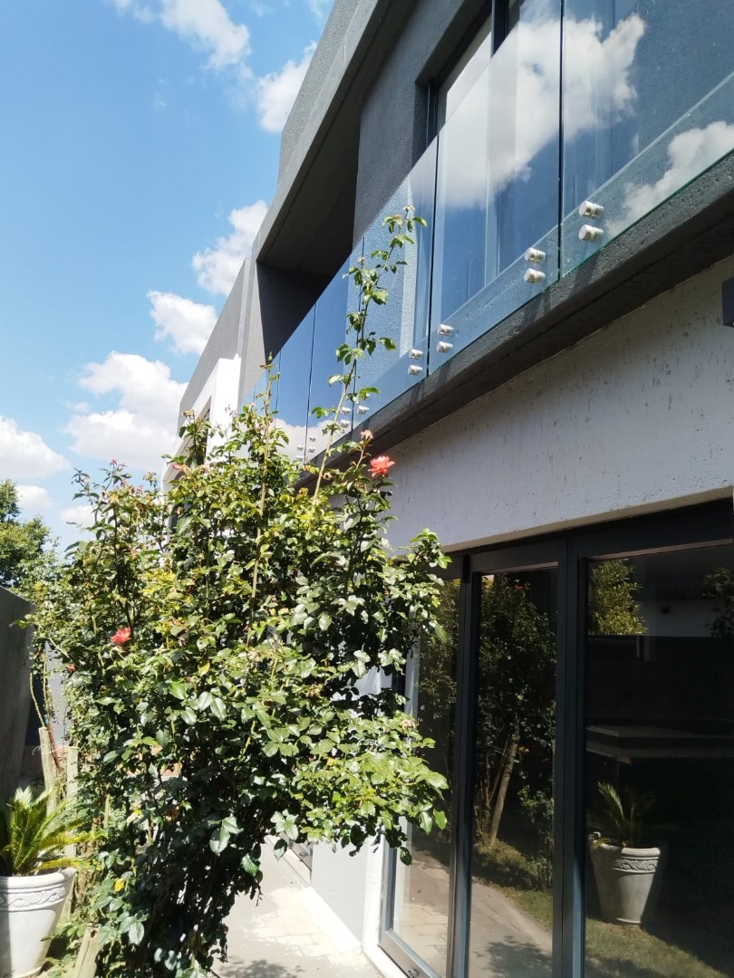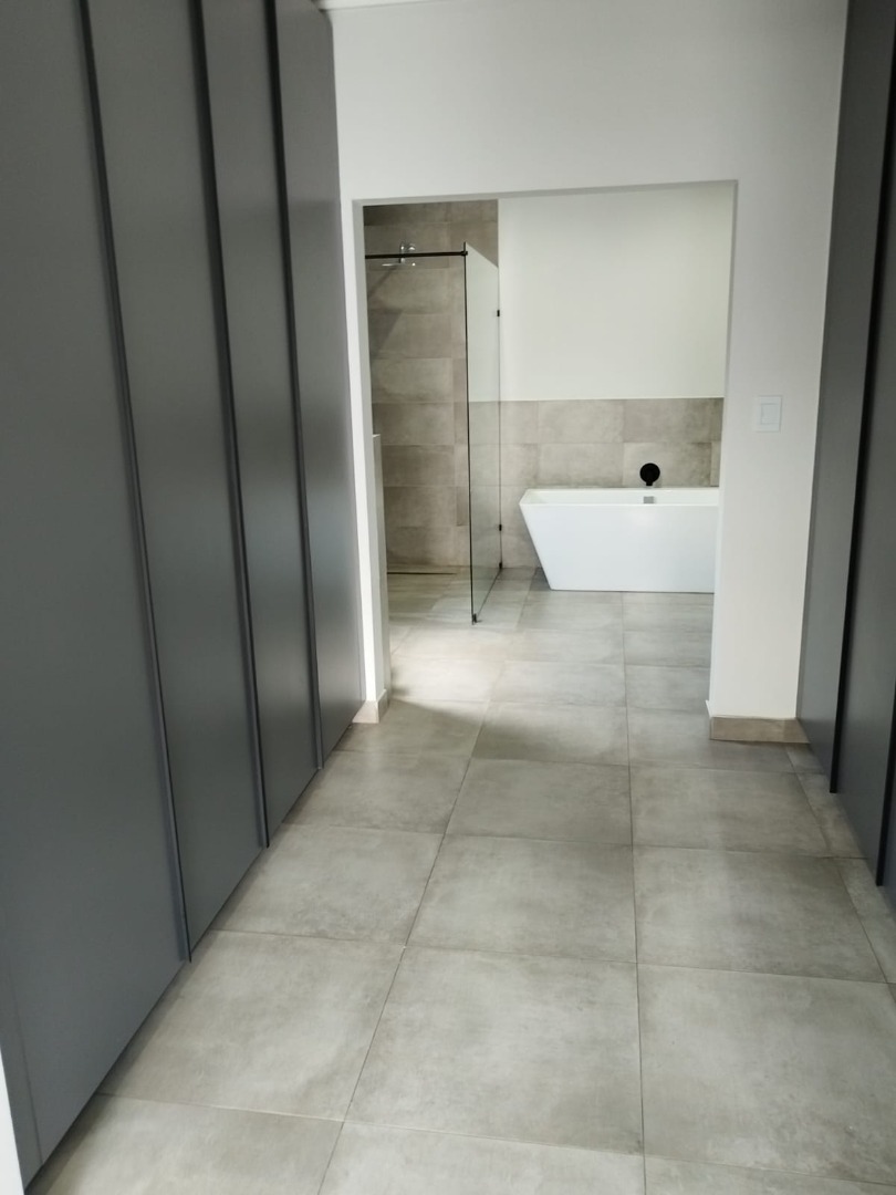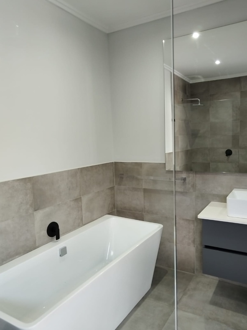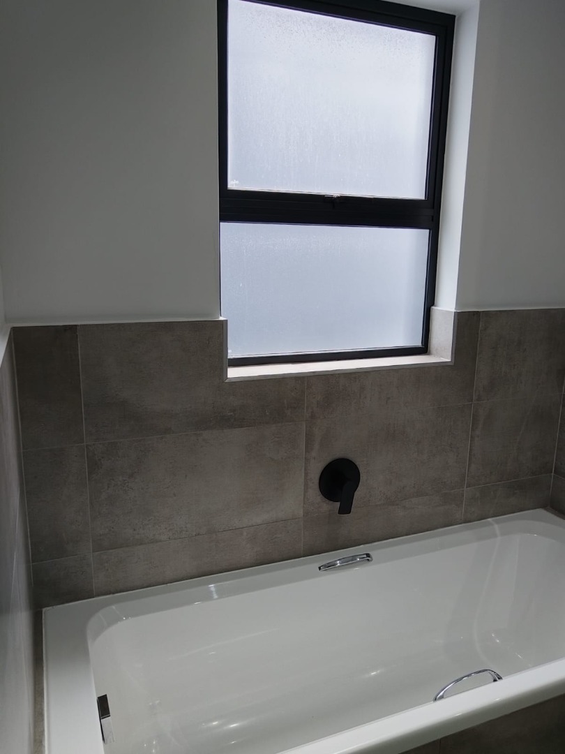 This modern residential sale property in Edenburg, Sandton, offers contemporary living within a secure estate. The sleek, dark-toned architecture provides excellent kerb appeal. Inside, you will discover an open-plan layout featuring a modern kitchen with glossy dark grey cabinets and an island with an integrated stovetop, flowing into the dining and lounge areas. This home boasts three spacious bedrooms, each with an en-suite bathroom, plus a convenient guest toilet. Enjoy outdoor living with a private patio and balconies, complemented by a garden. Security is paramount with 24-hour security, CCTV, an alarm, electric fencing, and access gates. Fibre connectivity is available. Two garages provide ample parking.