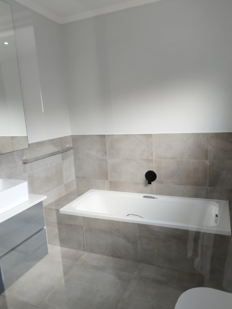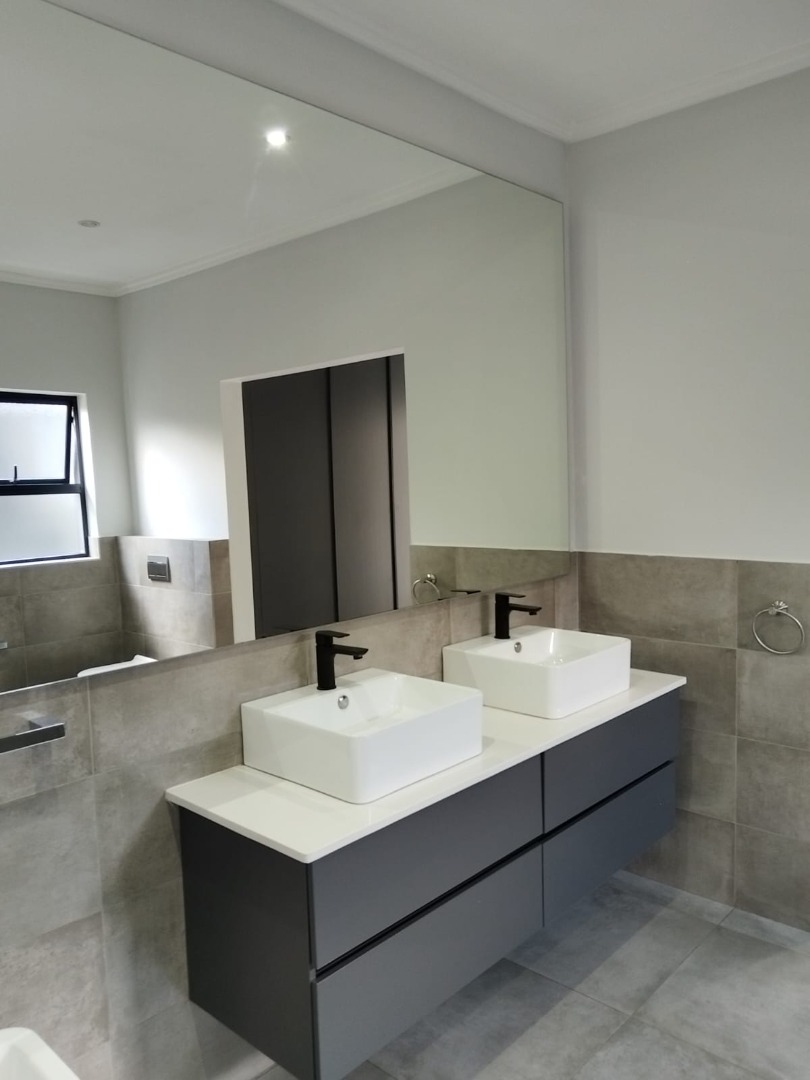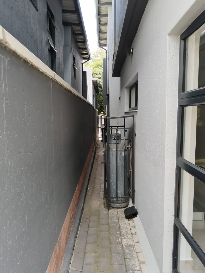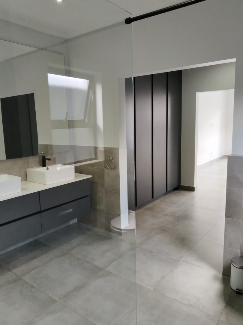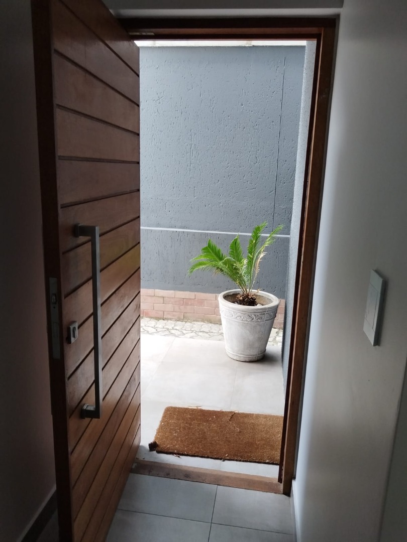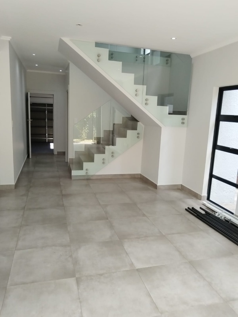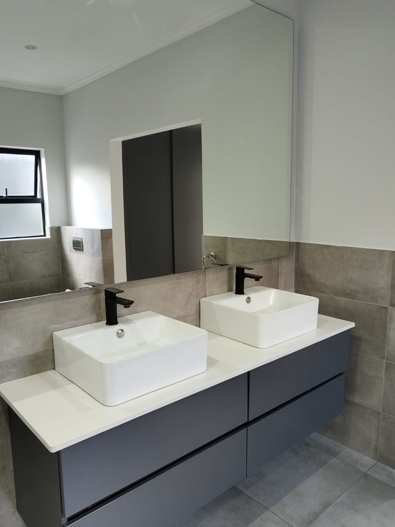 This modern residential sale property in Edenburg, Sandton, offers contemporary living within a secure estate. The sleek, dark-toned architecture provides excellent kerb appeal. Inside, you will discover an open-plan layout featuring a modern kitchen with glossy dark grey cabinets and an island with an integrated stovetop, flowing into the dining and lounge areas. This home boasts three spacious bedrooms, each with an en-suite bathroom, plus a convenient guest toilet. Enjoy outdoor living with a private patio and balconies, complemented by a garden. Security is paramount with 24-hour security, CCTV, an alarm, electric fencing, and access gates. Fibre connectivity is available. Two garages provide ample parking.