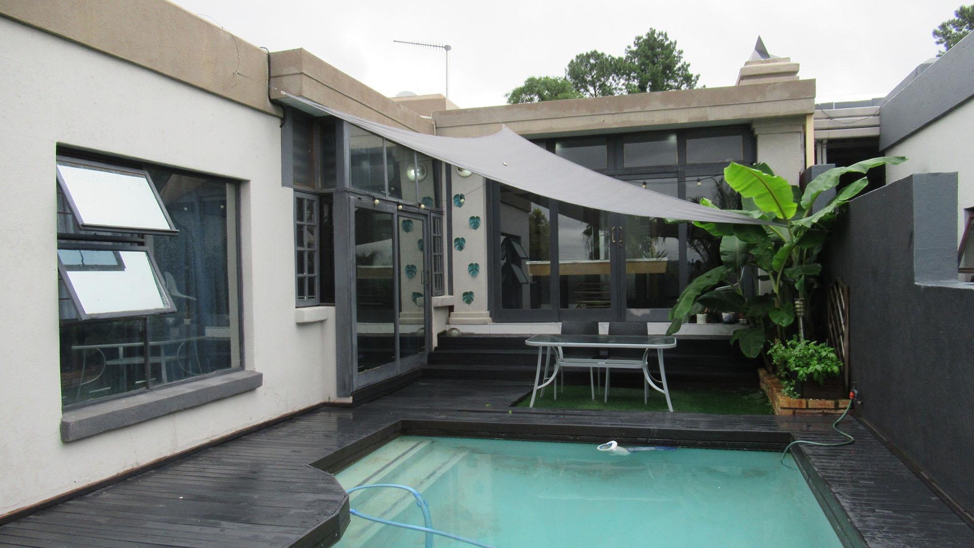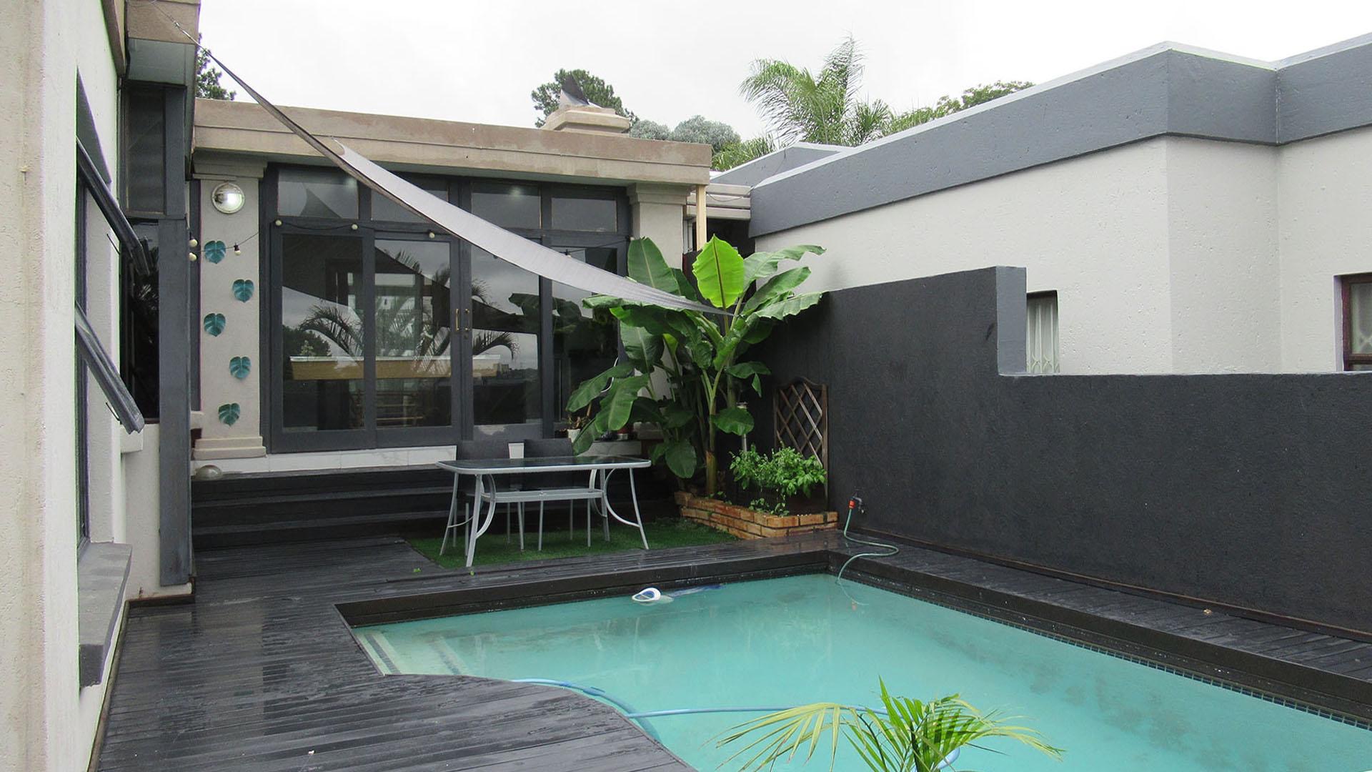 Beyond the interior, the property extends its allure to a captivating outdoor realm. A sprawling patio invites alfresco dining and leisurely moments, overlooking a sparkling private swimming pool – a refreshing oasis for warm South African days. Adjacent to this, a meticulously designed deck provides an ideal setting for sun-drenched relaxation or evening cocktails, all set within a beautifully landscaped garden. The property's elevated position affords a scenic view, transforming everyday moments into picturesque experiences. With an Erf size of 321 square metres, there is ample space for both recreation and quiet contemplation.