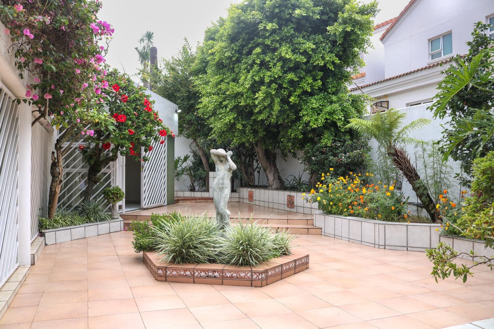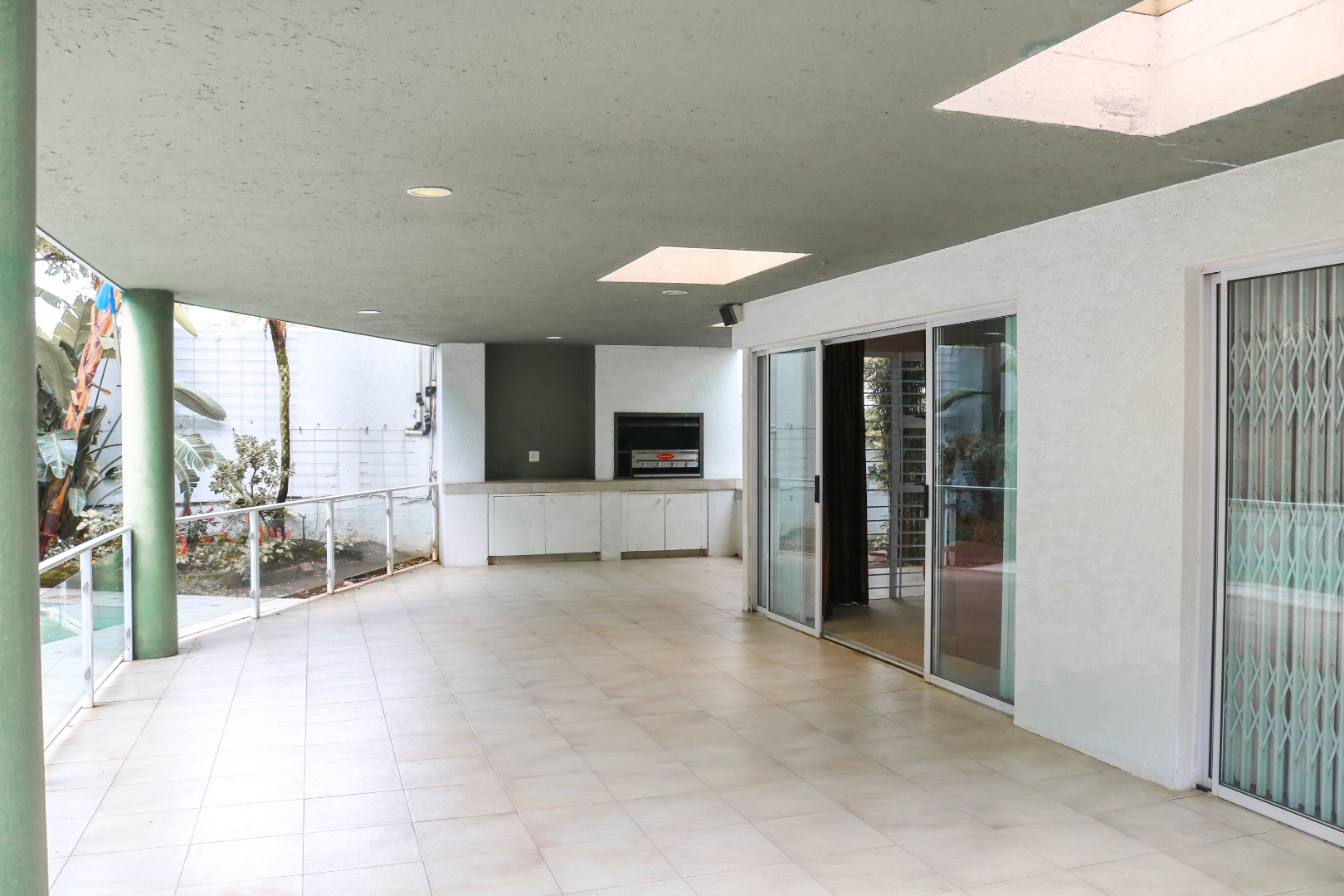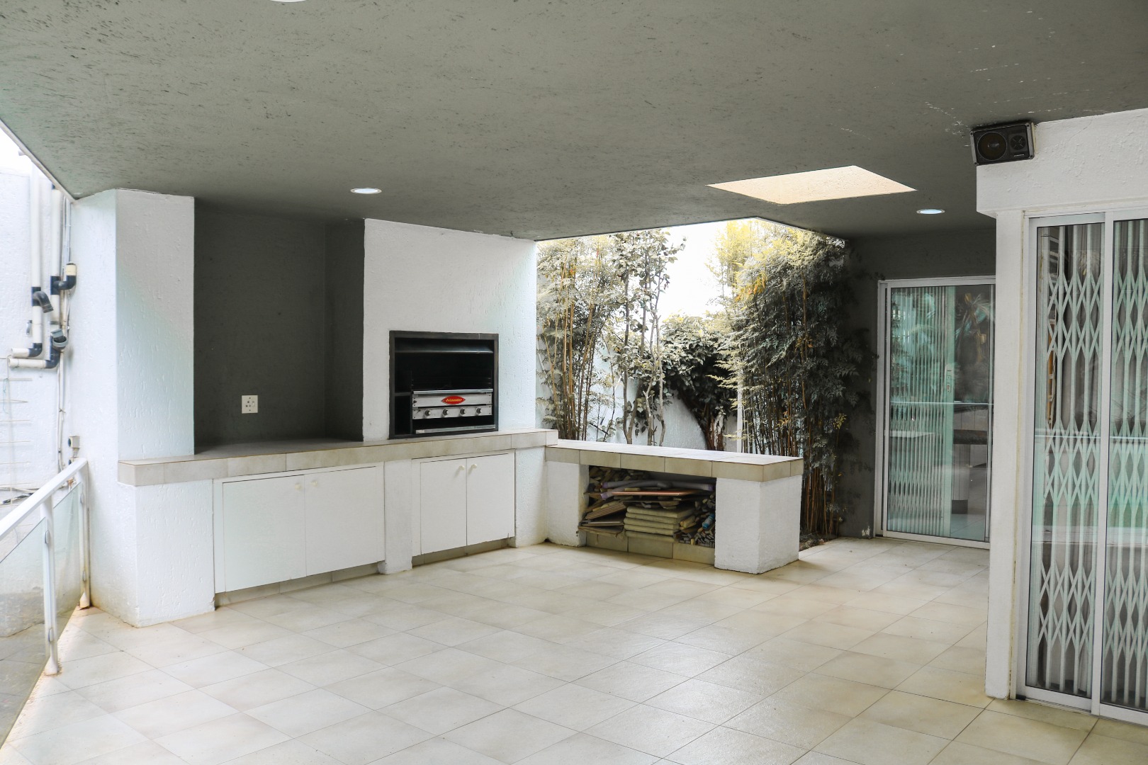A covered patio with a built-in braai, a meticulously maintained garden with an