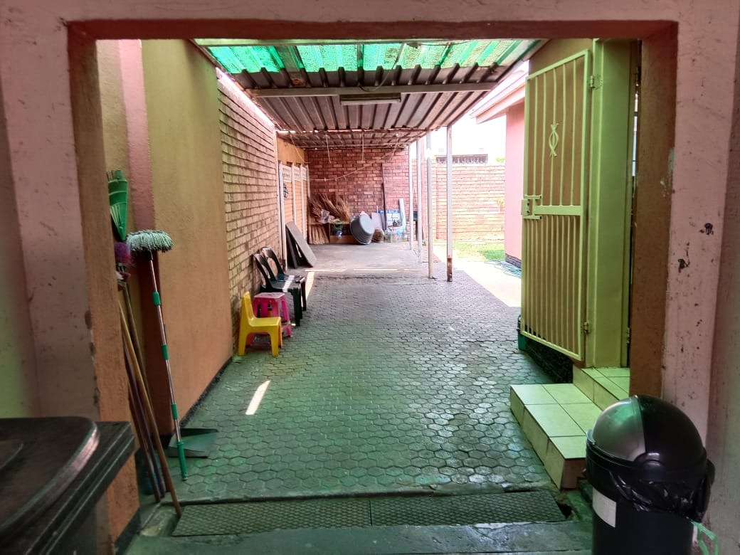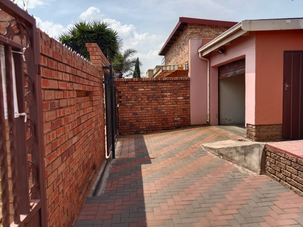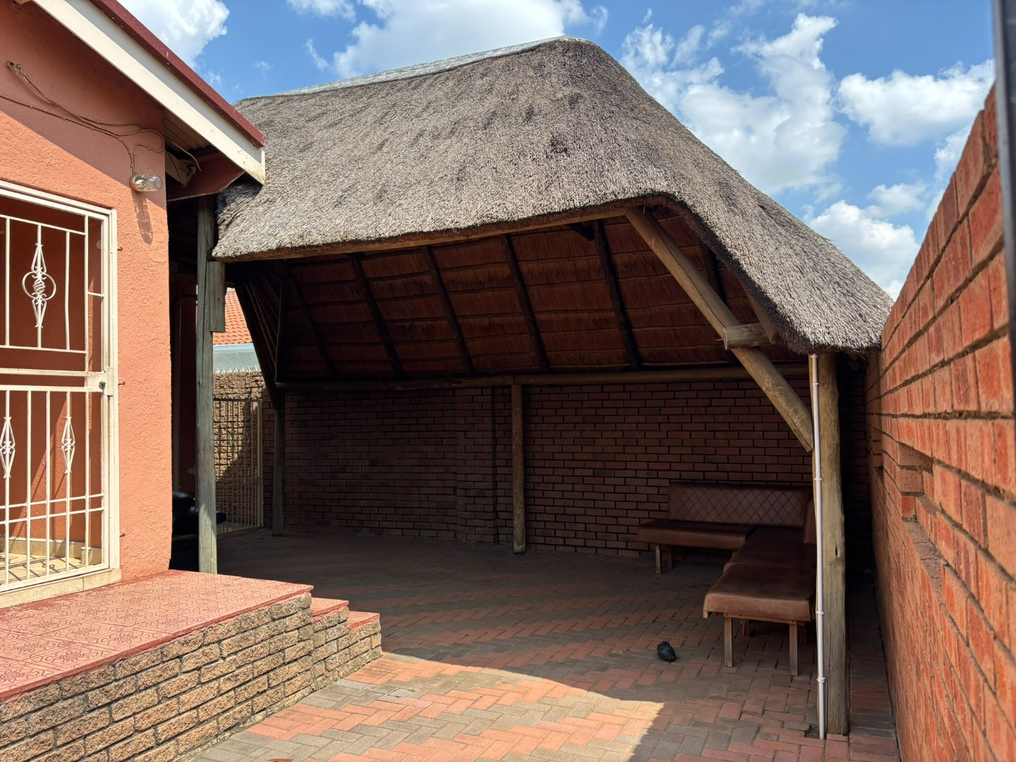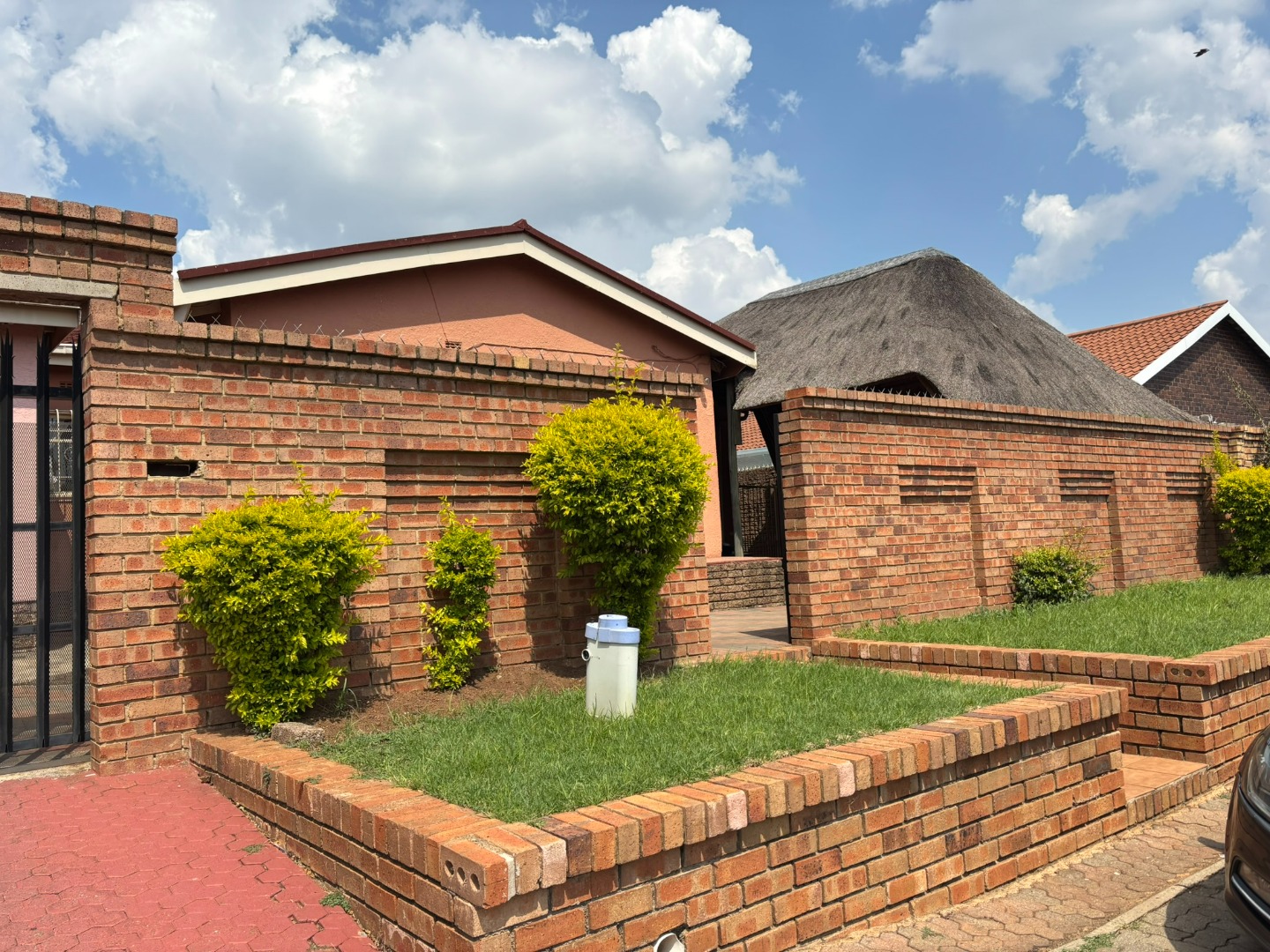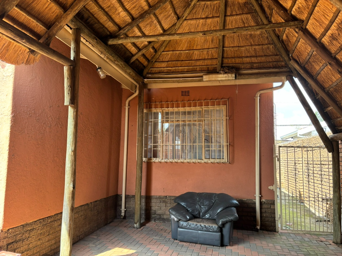 Discover this charming residential property located in Eldorado Park, Soweto, offering a blend of comfort and practical living. The home presents a robust brick exterior complemented by well-maintained perimeter walls featuring security spikes, ensuring peace of mind. A neatly landscaped front garden with raised brick planters enhances its kerb appeal, while a distinctive thatch-roofed section adds unique architectural character to the facade.