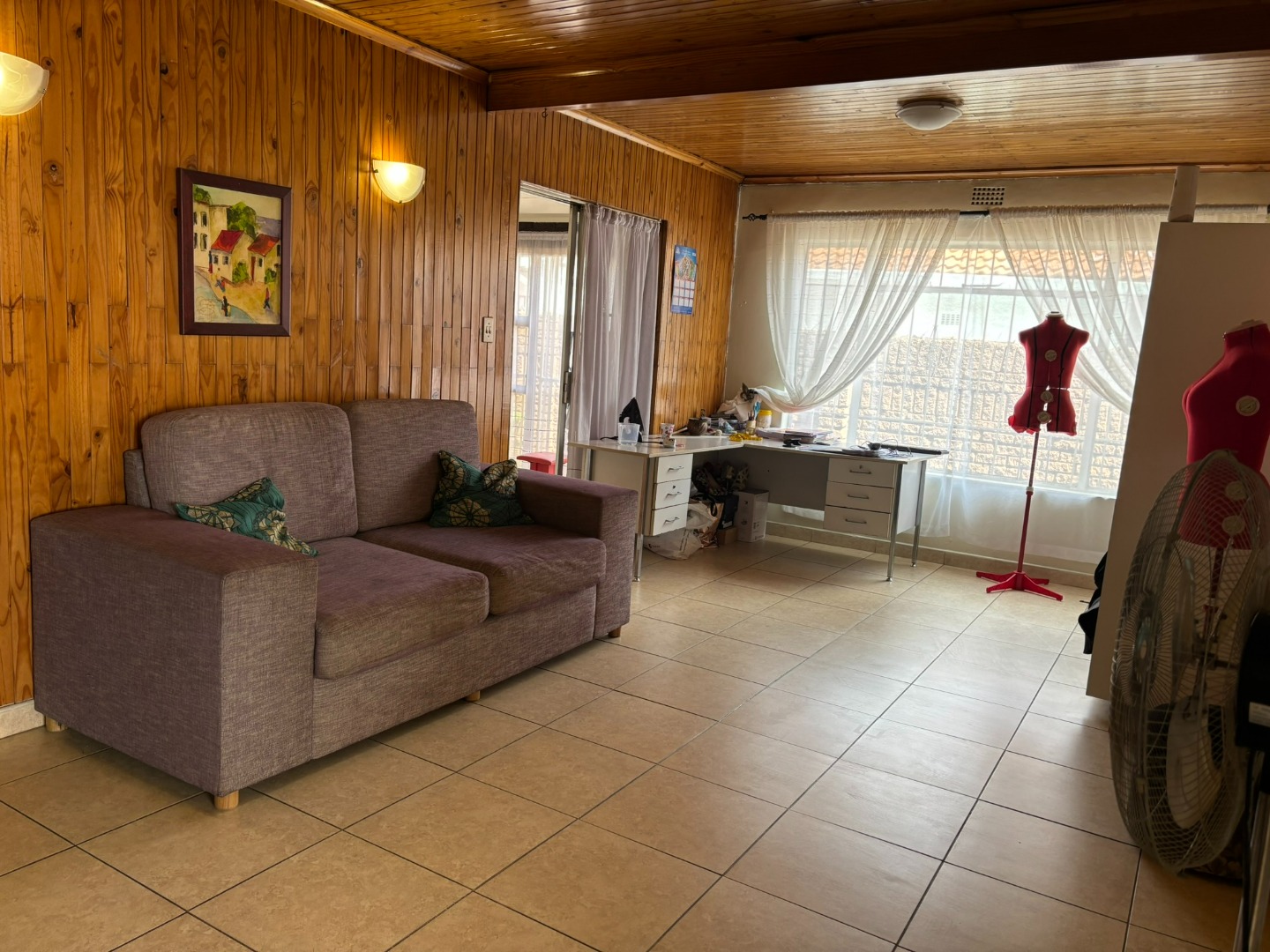 Outdoor living is well-catered for with a spacious thatched roof lapa, ideal for shaded outdoor gatherings, and durable brick paving throughout the exterior areas. The property boasts four open parking spaces, accommodating multiple vehicles. A well-established garden, complete with a clothesline and established greenery, offers a private outdoor retreat. Security gates and burglar bars are installed, further enhancing the property's safety.