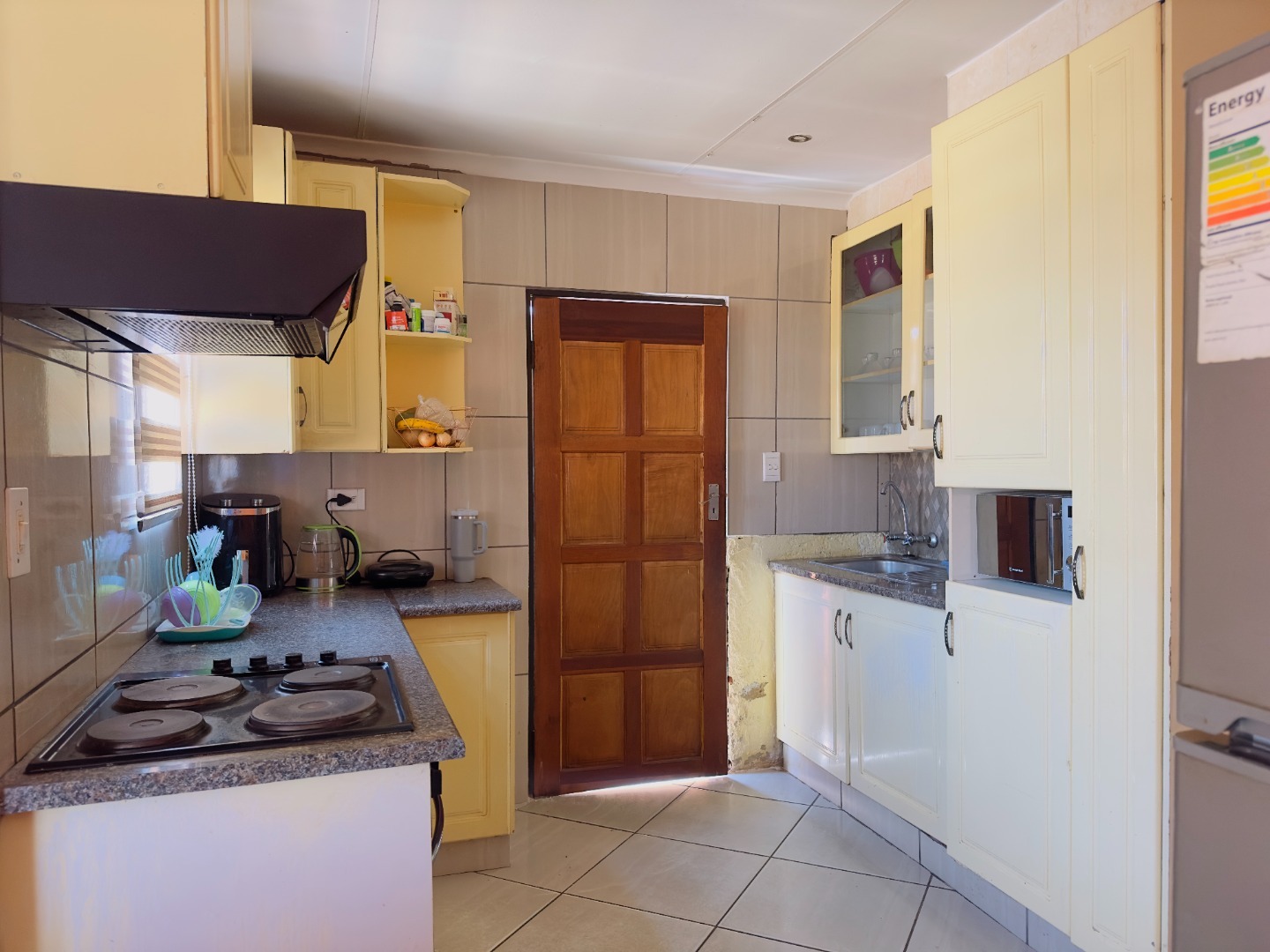 Inside, you'll find a lounge area and a functional kitchen equipped with light-colored cabinets, tiled floors, a modern electric hob, oven, and extractor fan, plus a handy built-in microwave space. The three bedrooms are all tiled and include built-in wardrobes for easy storage. There are also 1.5 bathrooms, both fully tiled, with one featuring a bathtub.