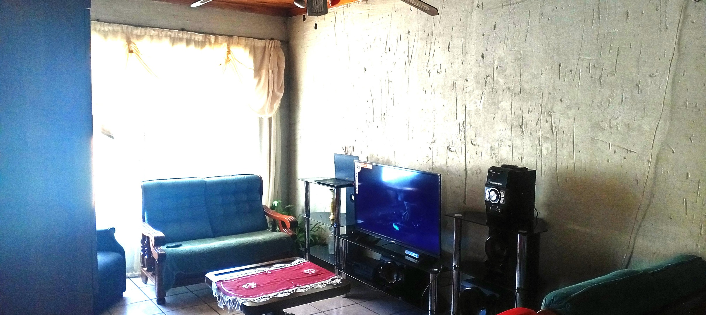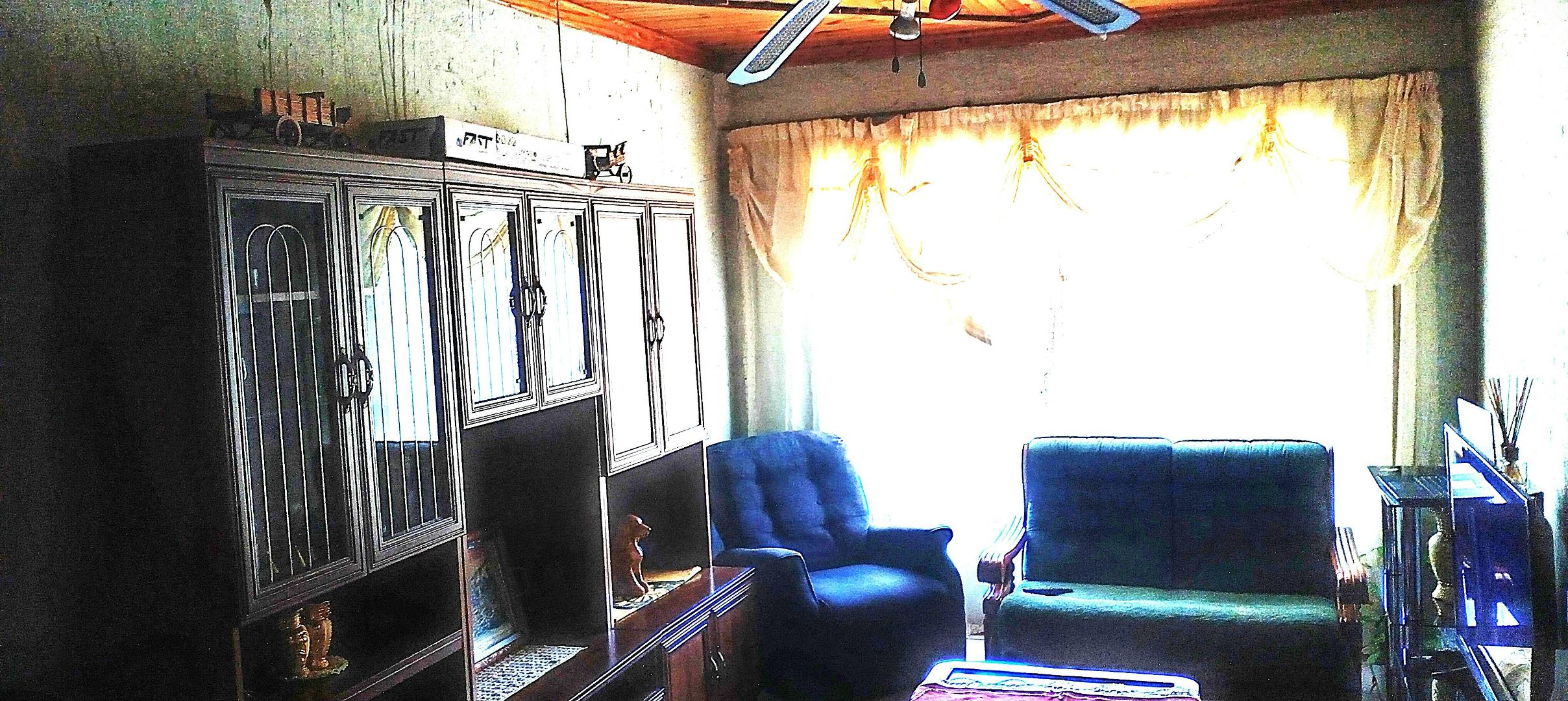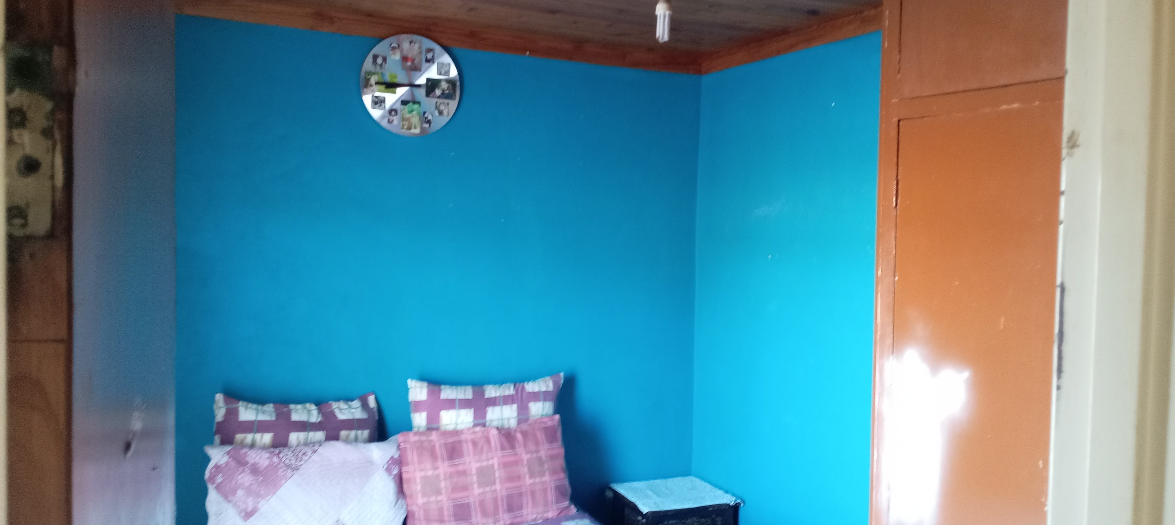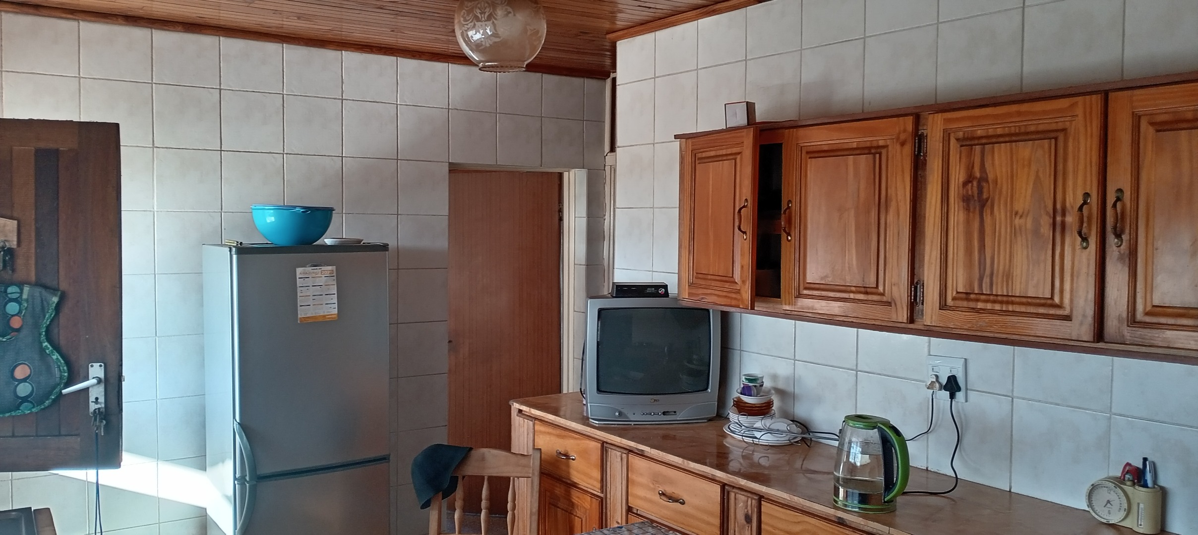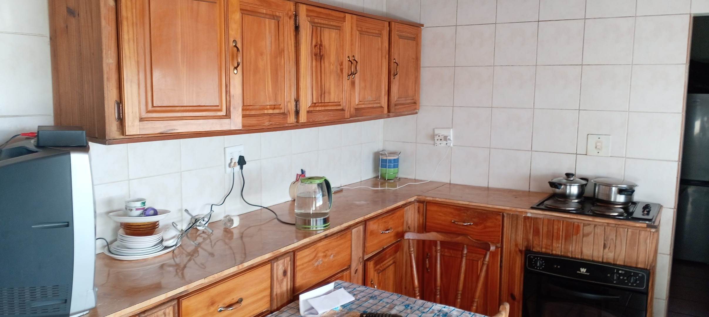 The interior features a functional layout comprising one lounge, a dining room, and a kitchen. The kitchen boasts solid wood cabinetry and a tiled backsplash, with ample counter space, though it offers an opportunity for modernisation to align with contemporary tastes. Living areas benefit from natural light and include a ceiling fan for comfort, with wood-paneled ceilings adding a traditional touch throughout.