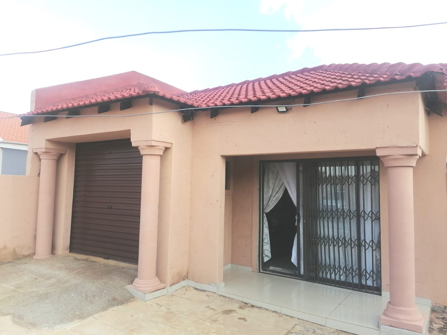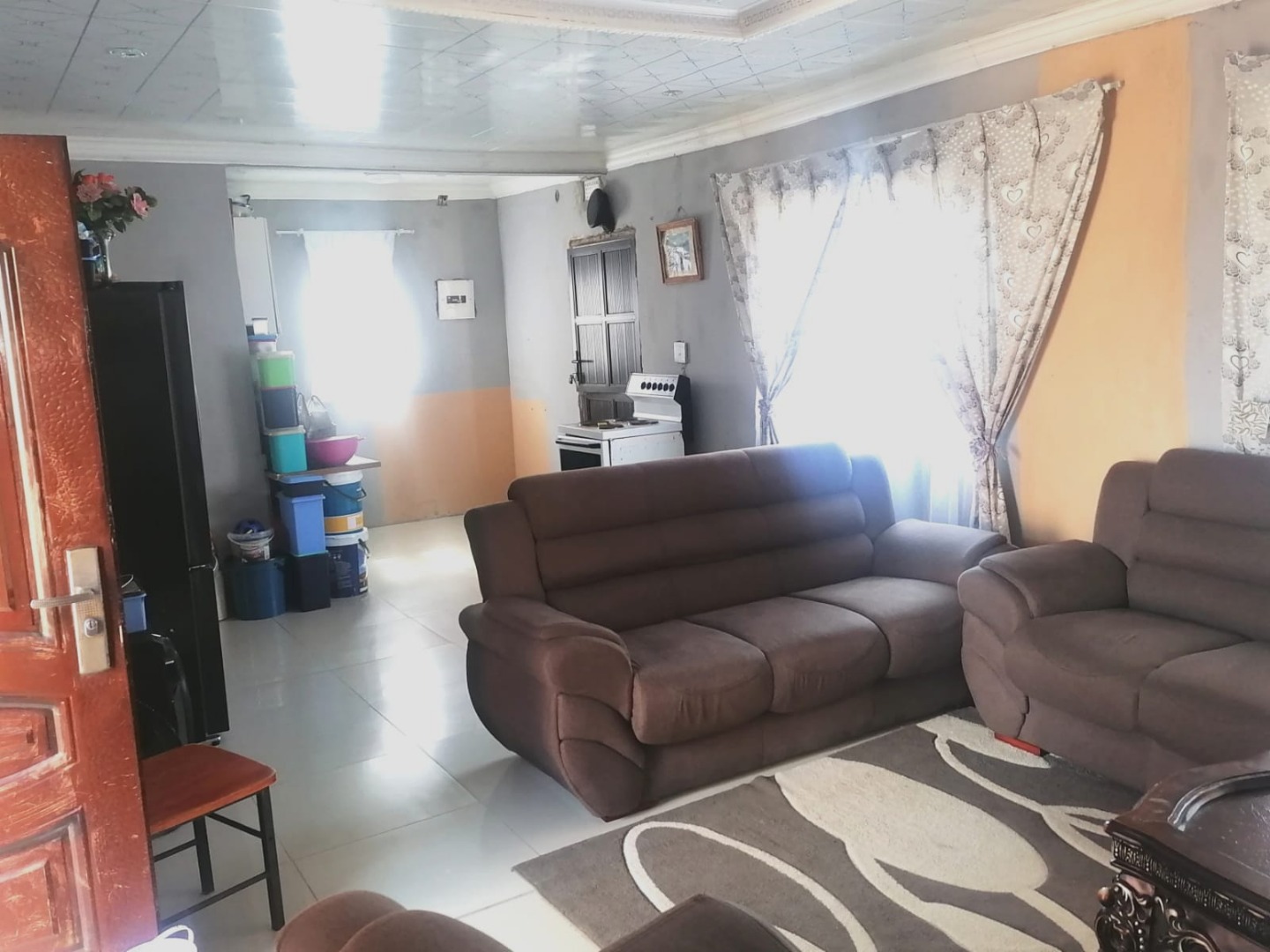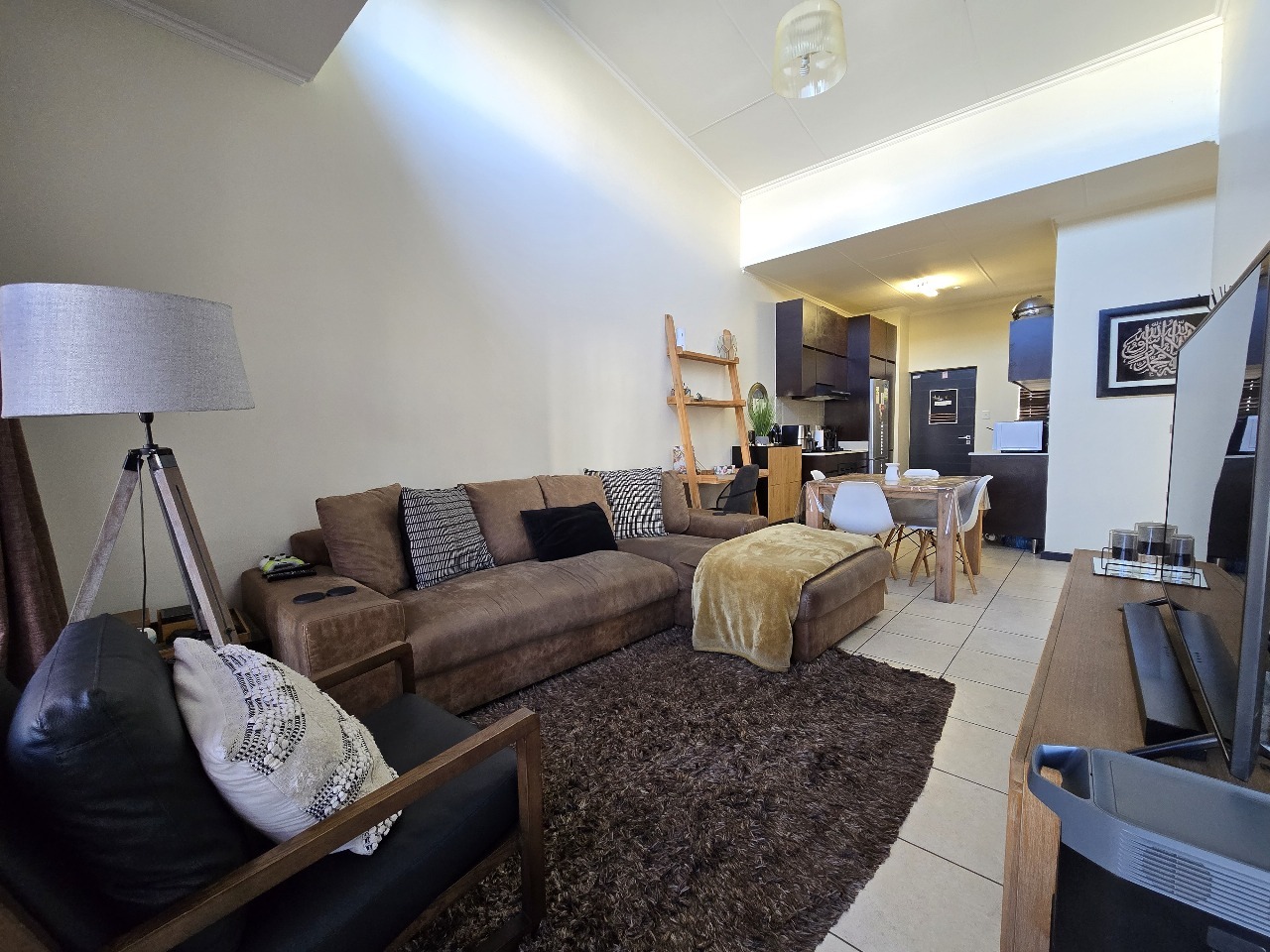 The open-plan kitchen flows seamlessly into the lounge, creating a spacious and inviting atmosphere. The property is equipped with aluminum windows throughout, enhancing both security and aesthetics. Additionally, all windows are fitted with rollable aluminum burglar bars for extra safety.