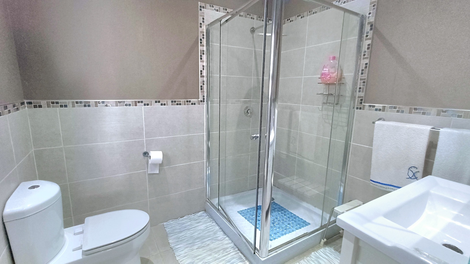 tiled bathroom equipped with an enclosed shower, toilet, bidet, and basin. The