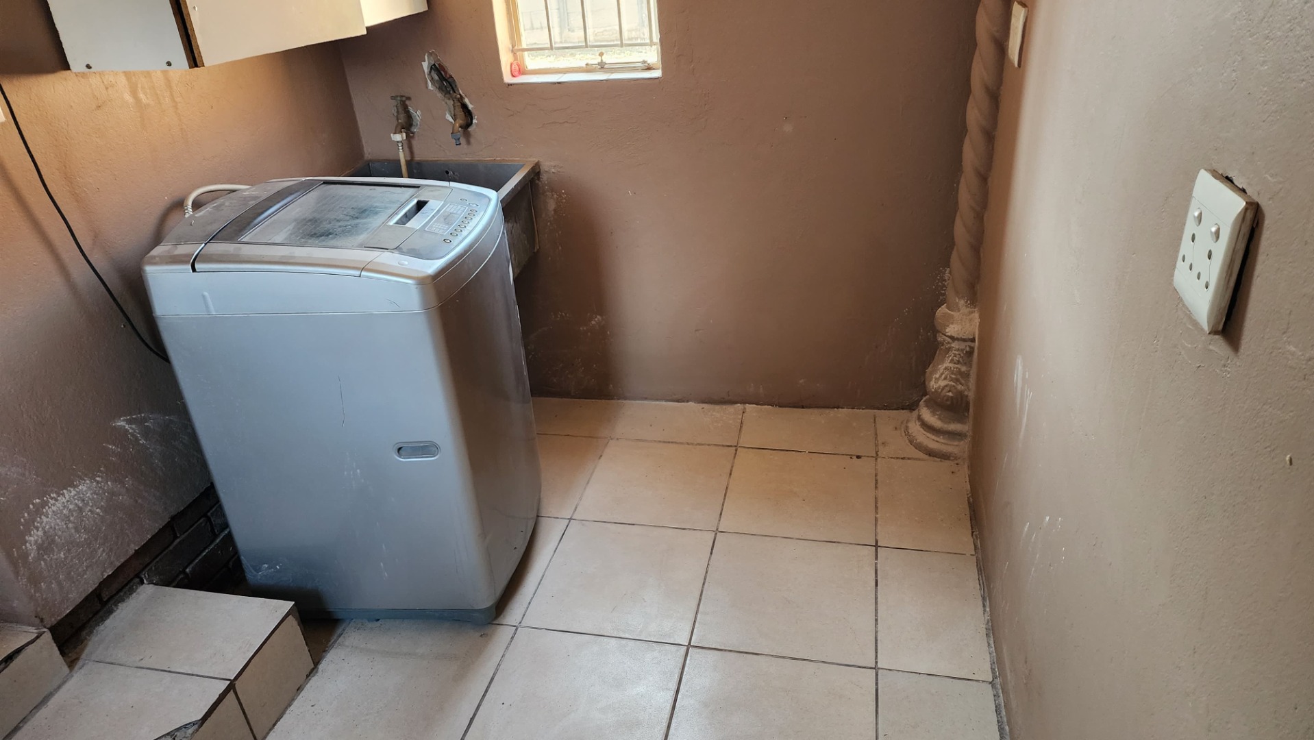 The property offers significant parking solutions with two garages and an additional eight parking spaces, catering to multiple vehicles or guests. Security is a priority, featuring a robust spiked fence, electric fencing, and burglar bars for peace of mind. A dedicated laundry area adds to the home's practicality.
