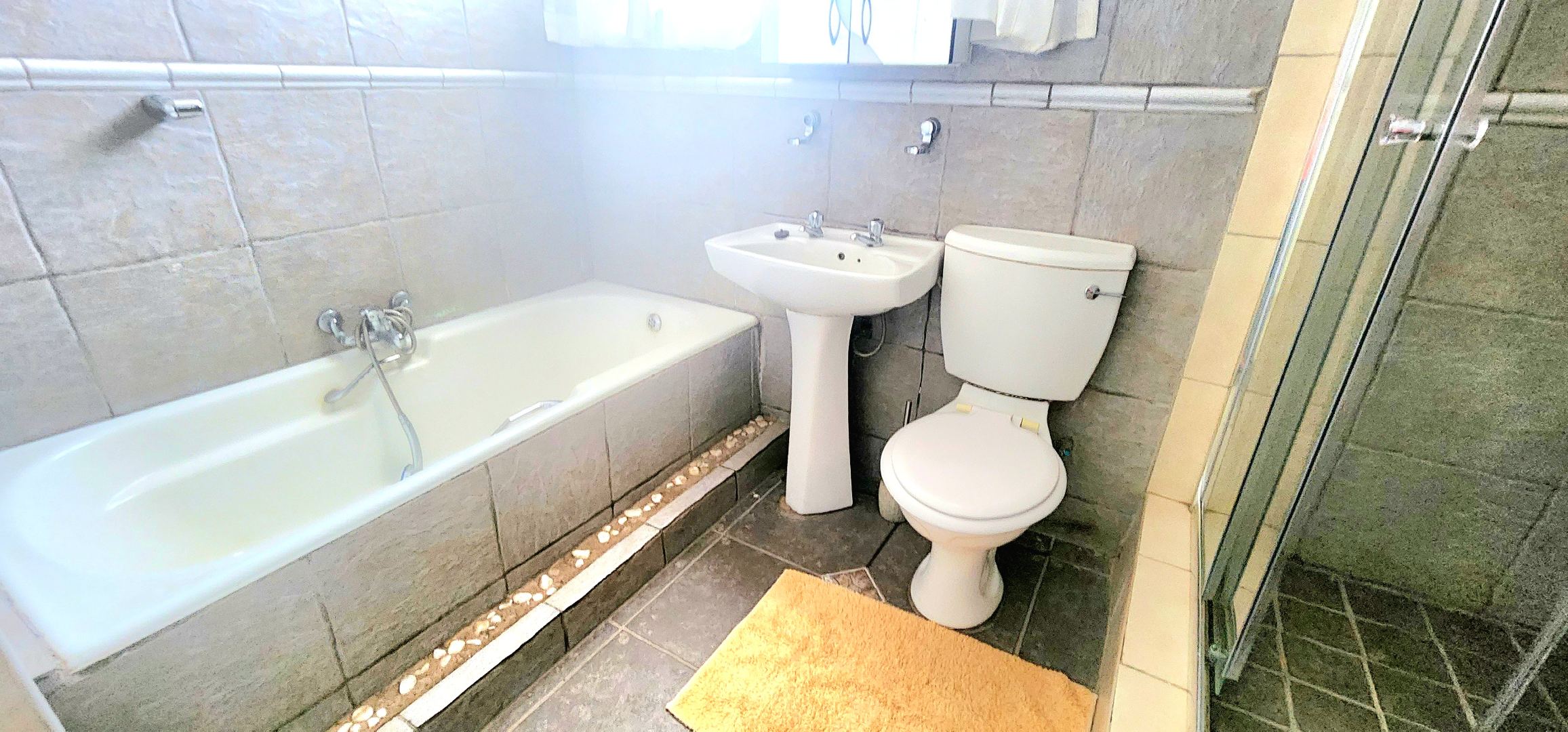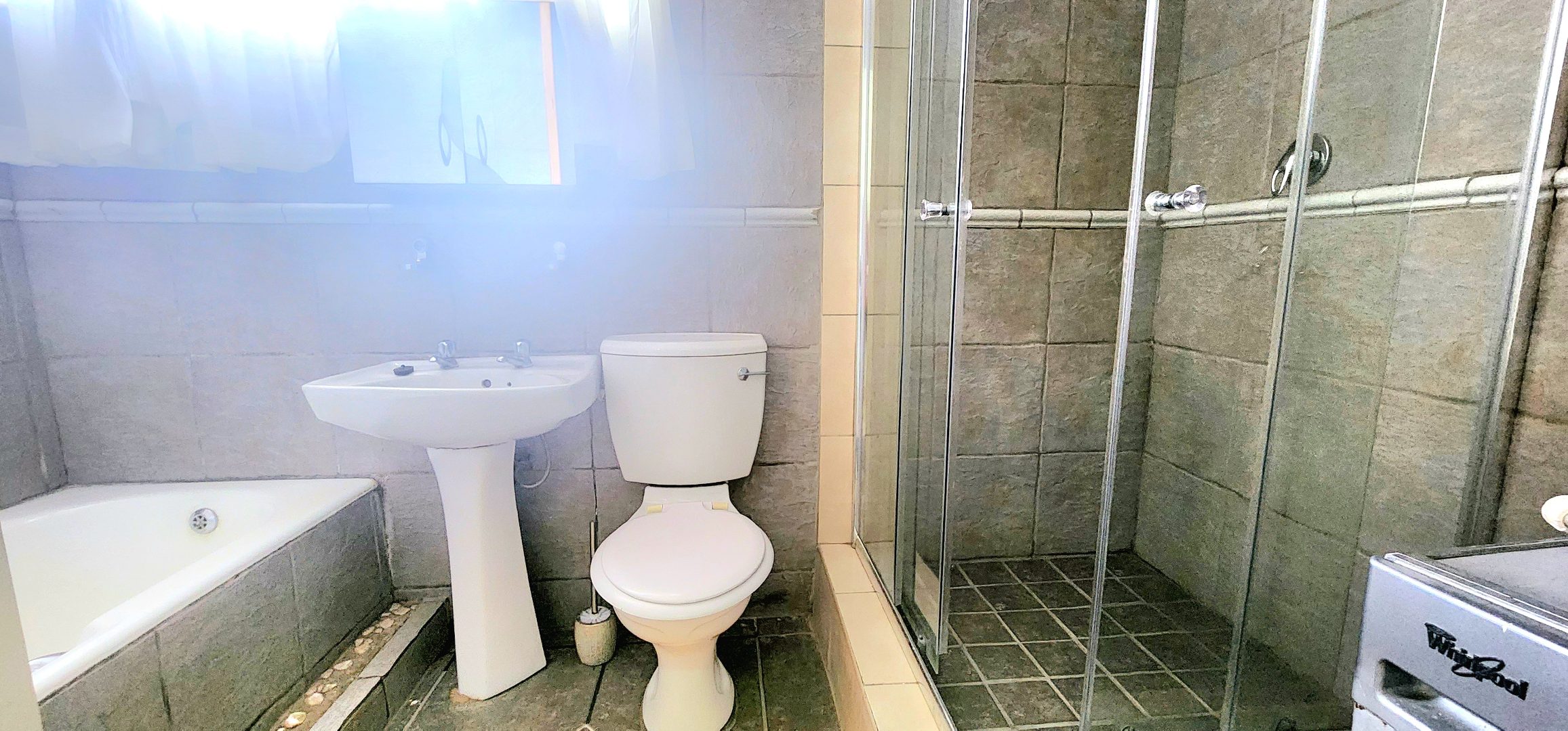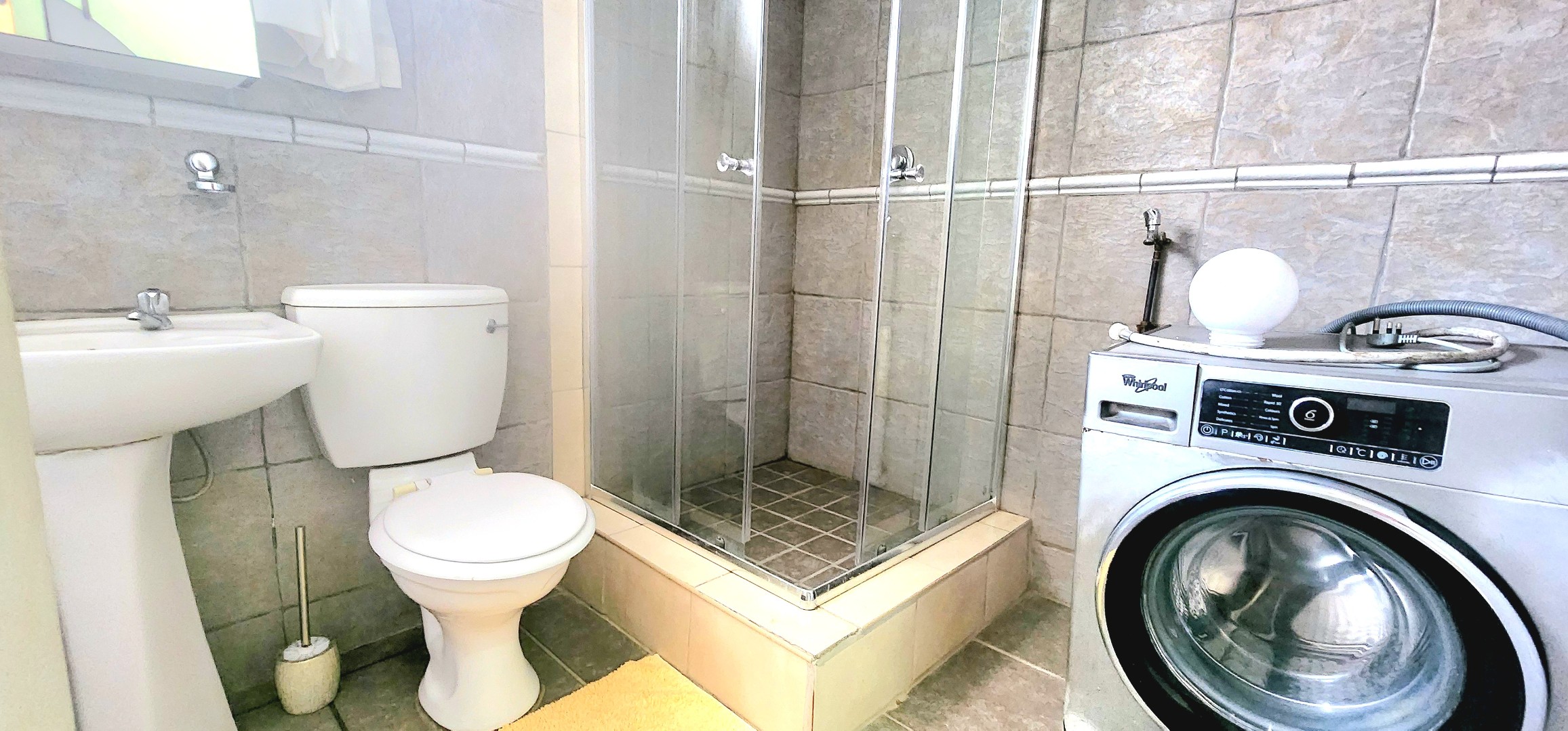 - ?Designer Bathroom: A modern bathroom featuring a bath, shower, basin and toilet, washing machine connection