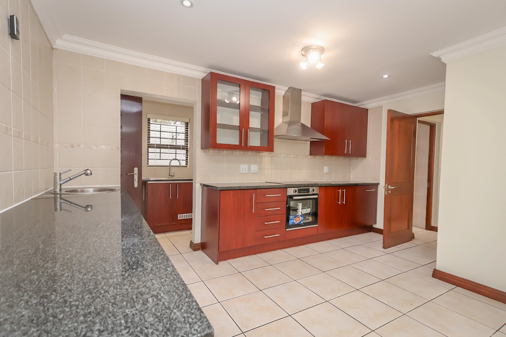 This modern home , offers generous living spaces including a lounge, dining room, family/TV room, and a dedicated study. The well-appointed kitchen features warm-toned wooden cabinetry, dark granite countertops, an integrated oven, hob, and extractor fan, complemented by tiled floors and backsplash. An elegant staircase with wrought iron railing adds a touch of sophistication, while practical amenities like a laundry room and additional storage enhance daily living. Two of the bathrooms are en-suite, alongside a convenient guest toilet.