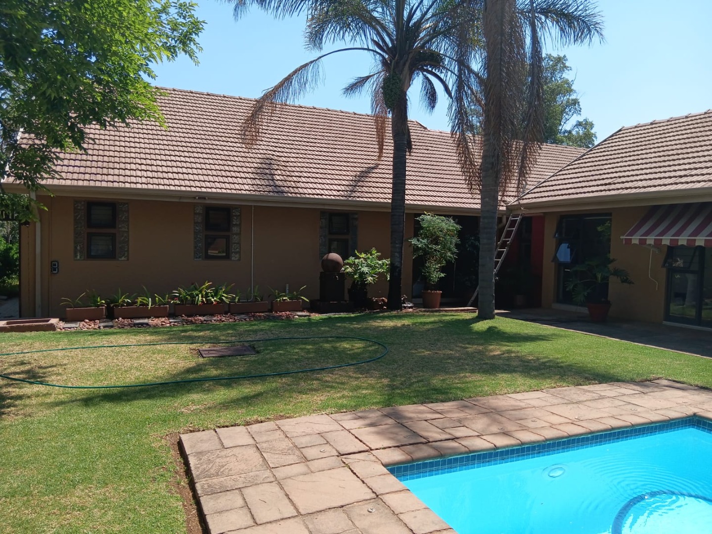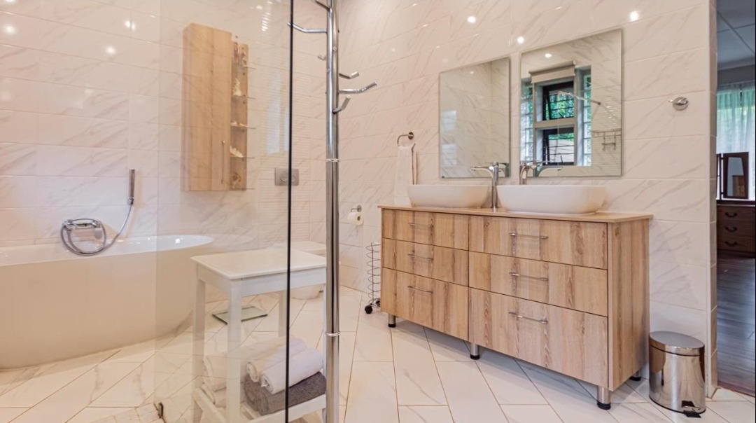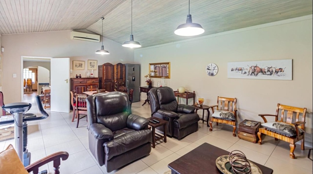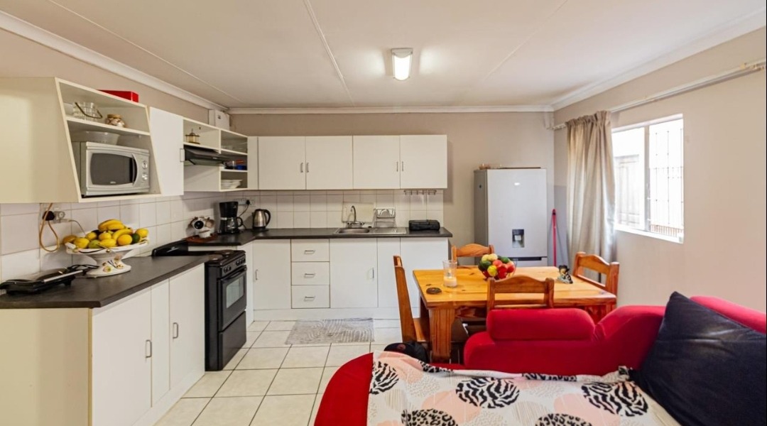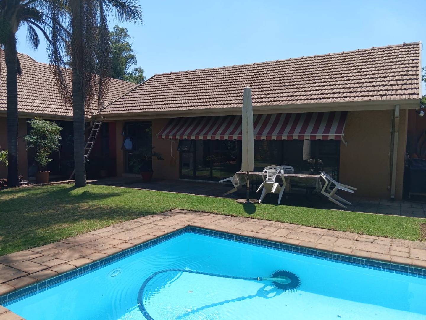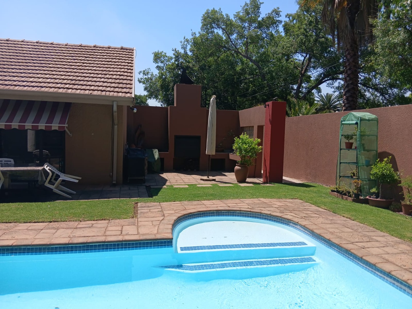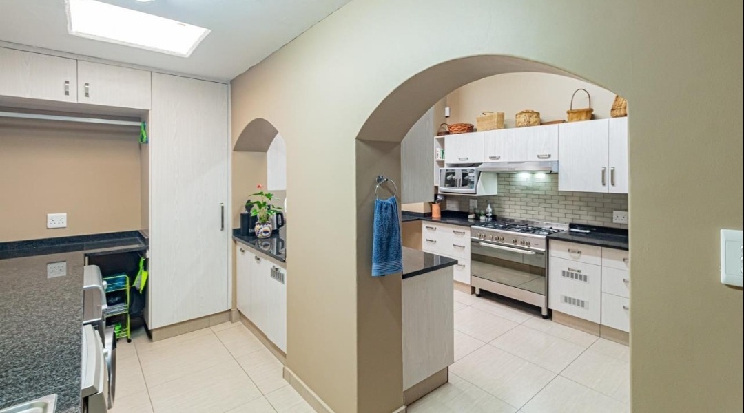 Sliding doors lead you out to the patio and manicured garden, featuring a sparkling swimming pool and built-in braai – the ultimate outdoor entertainment space.