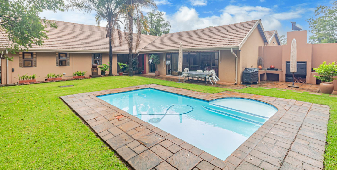 Step through the welcoming entrance hall into a bright, open-plan living area where natural light, clean lines, and warmth define the atmosphere. The elegant lounge flows into a family room with a fireplace and a refined dining area — a seamless space for relaxed evenings or stylish entertaining. Sliding doors open out to a private garden sanctuary complete with a sparkling pool, covered patio, and built-in braai — perfect for effortless outdoor living.