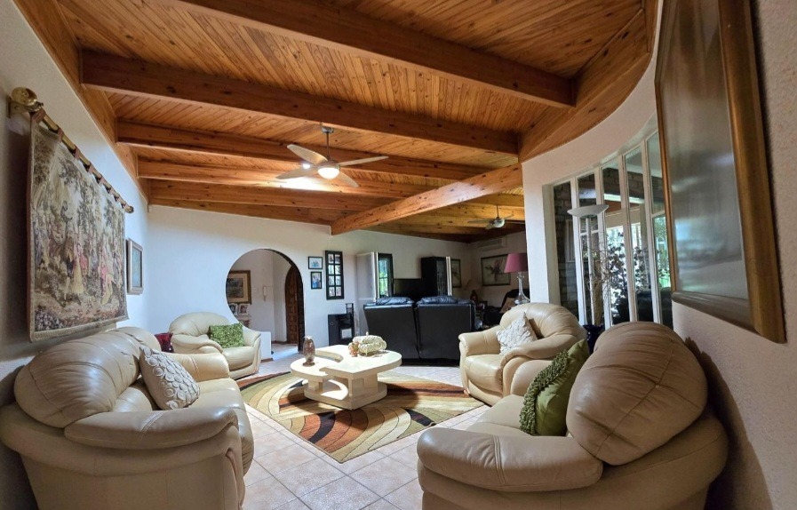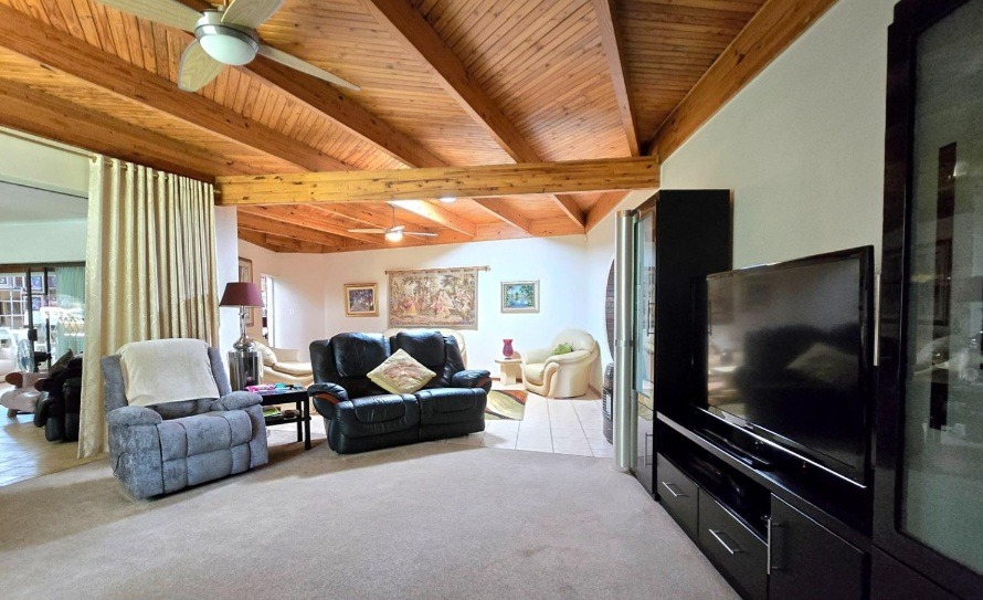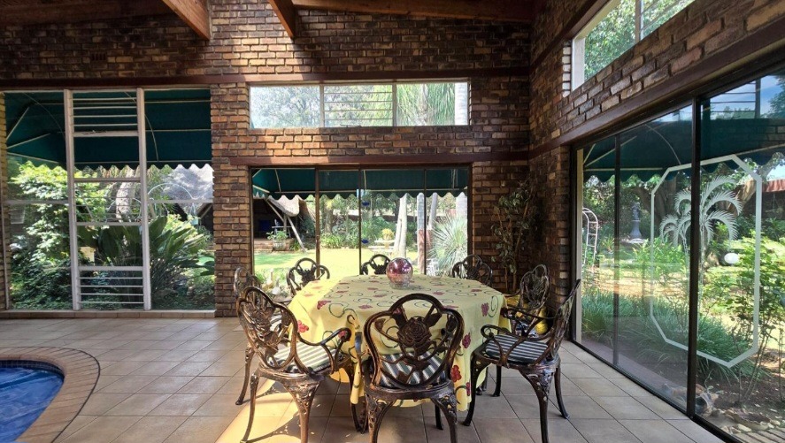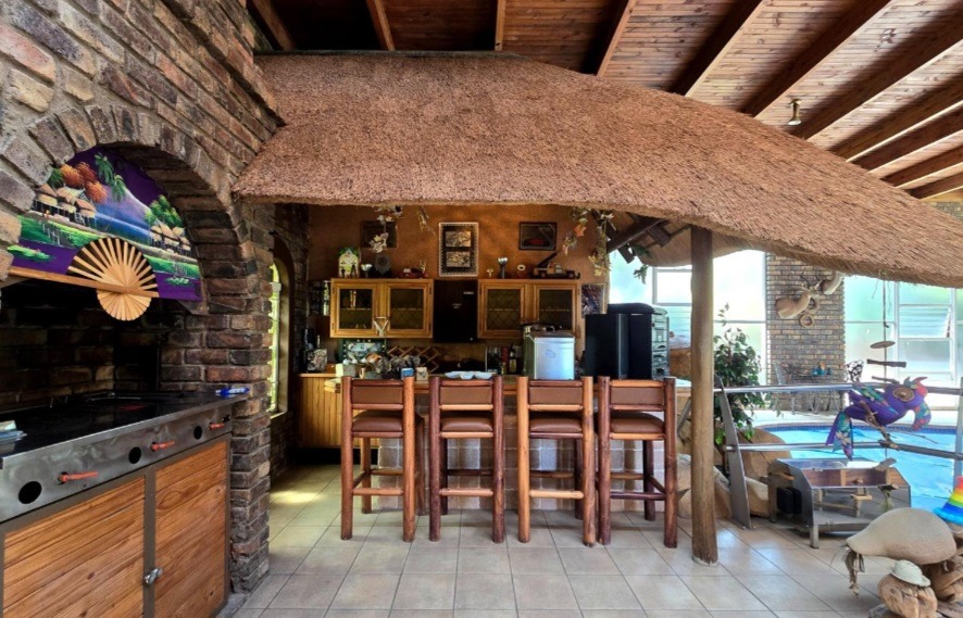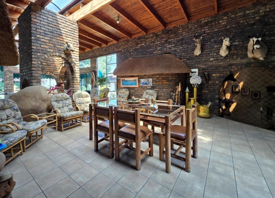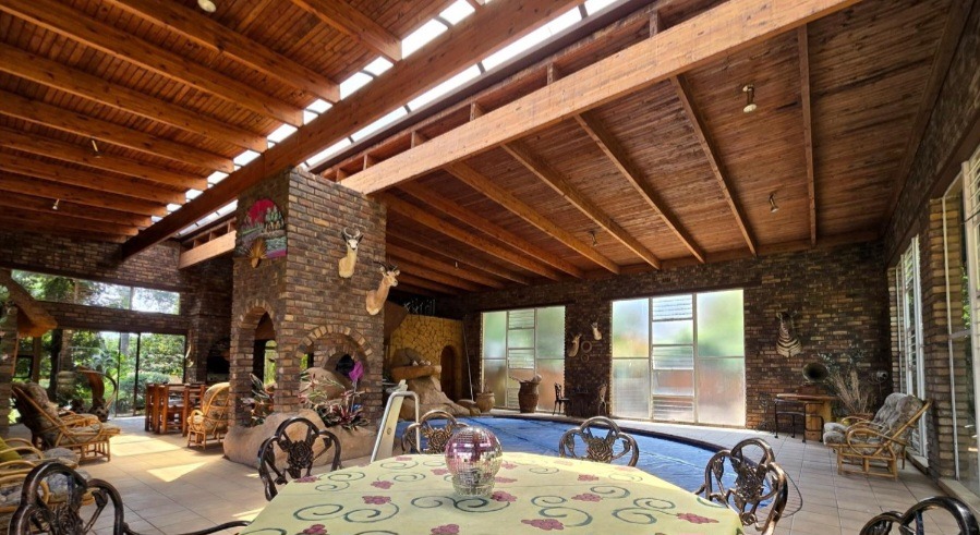 The interior unfolds into a realm of sophisticated entertainment, highlighted by a unique lodge-style area featuring an indoor swimming pool, a built-in bar, and an integrated braai. High beamed wooden ceilings, exposed brickwork, and abundant natural light create an inviting atmosphere for grand gatherings or tranquil relaxation. The residence boasts four generously proportioned bedrooms and four luxurious bathrooms, ensuring comfort and privacy for all occupants. The spacious kitchen, equipped with extensive cabinetry and an island, offers ample scope for culinary artistry.