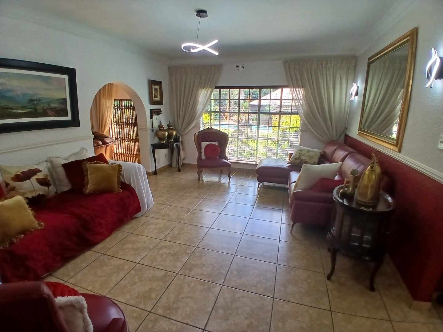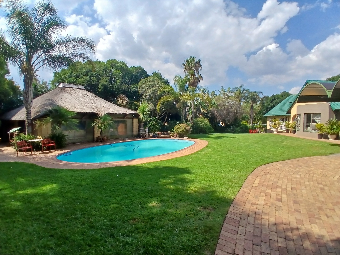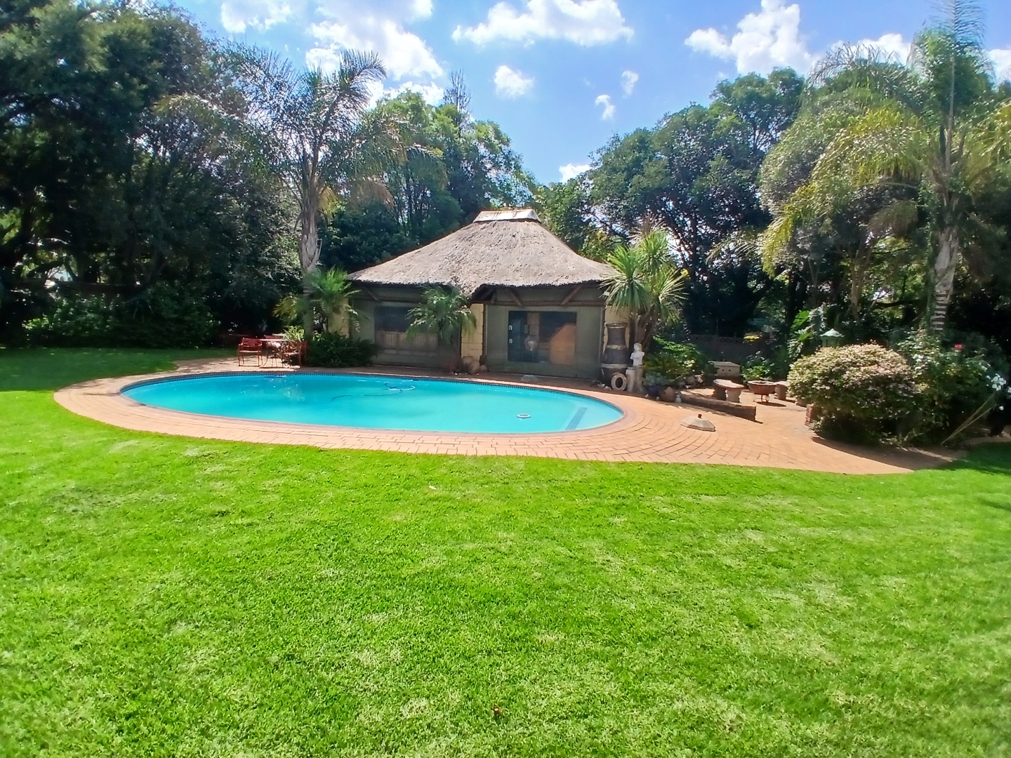 The beautifully landscaped garden creates a private oasis, featuring a sparkling swimming pool and a thatched, enclosed thatched lapa, perfect for entertaining or relaxing weekends.