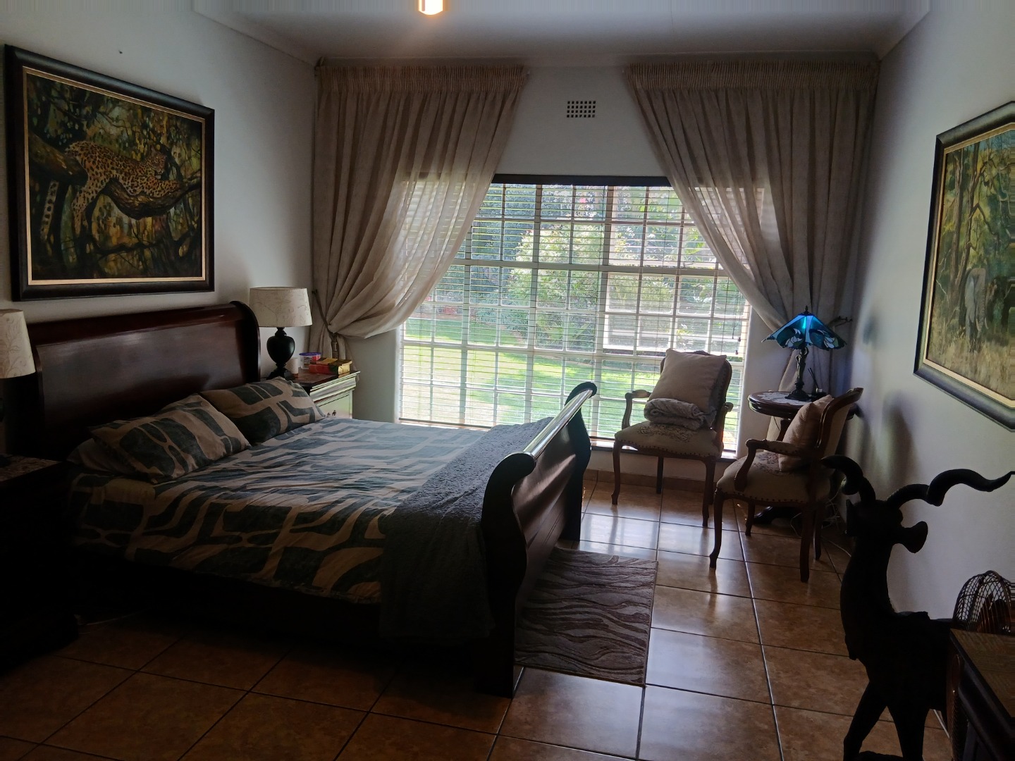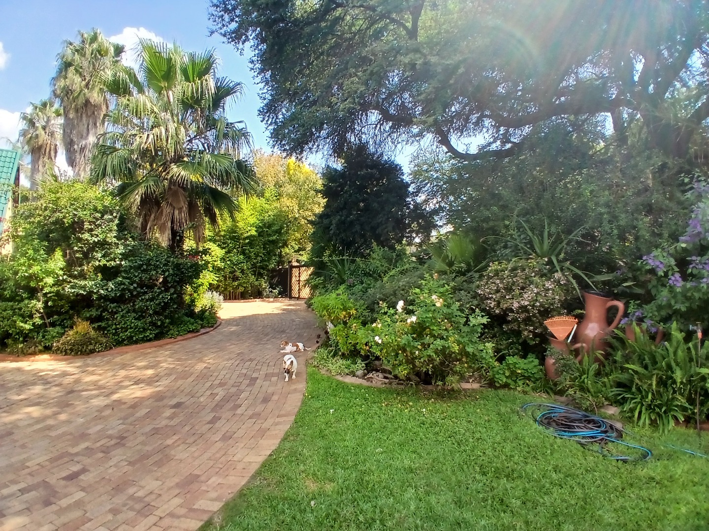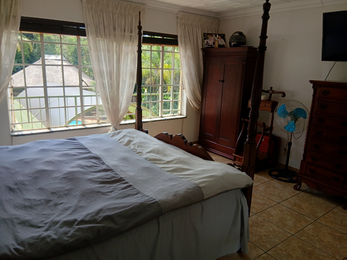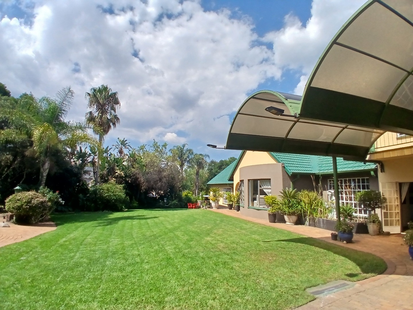 The beautifully landscaped garden creates a private oasis, featuring a sparkling swimming pool and a thatched, enclosed thatched lapa, perfect for entertaining or relaxing weekends.