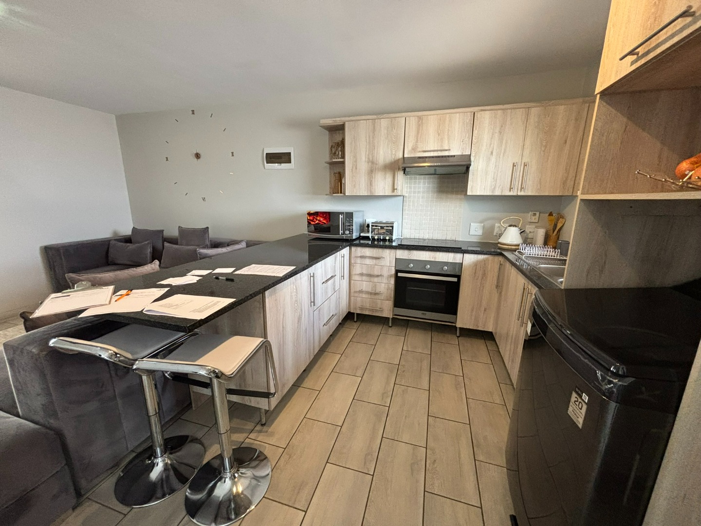 Situated within a secure complex, residents benefit from peace of mind with features such as an access gate and electric fencing. The complex is designed with families in mind, offering a mini park for children to enjoy. Connectivity is a key advantage, with full fibre access available throughout the complex. Practical considerations are well-addressed, including a dedicated covered parking space, and the levy conveniently covers insurance, while electricity operates on a pre-paid system.