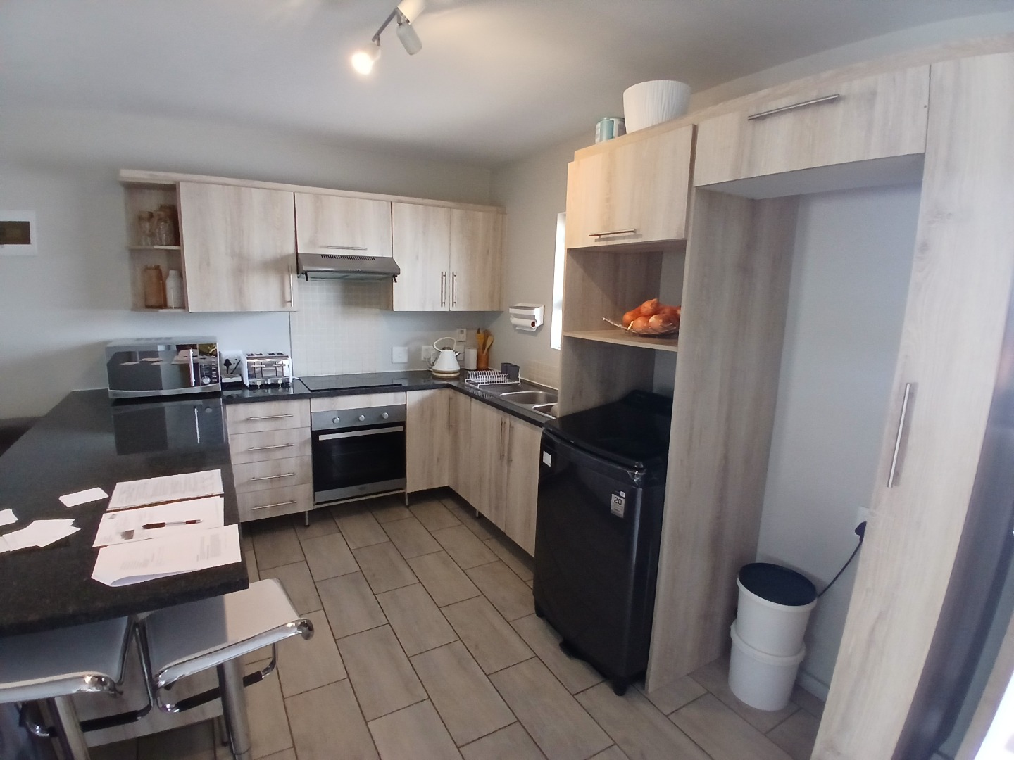 The modern kitchen is fitted with granite countertops, ample cupboard space, and room for both a fridge and washing machine, ensuring practicality and convenience.