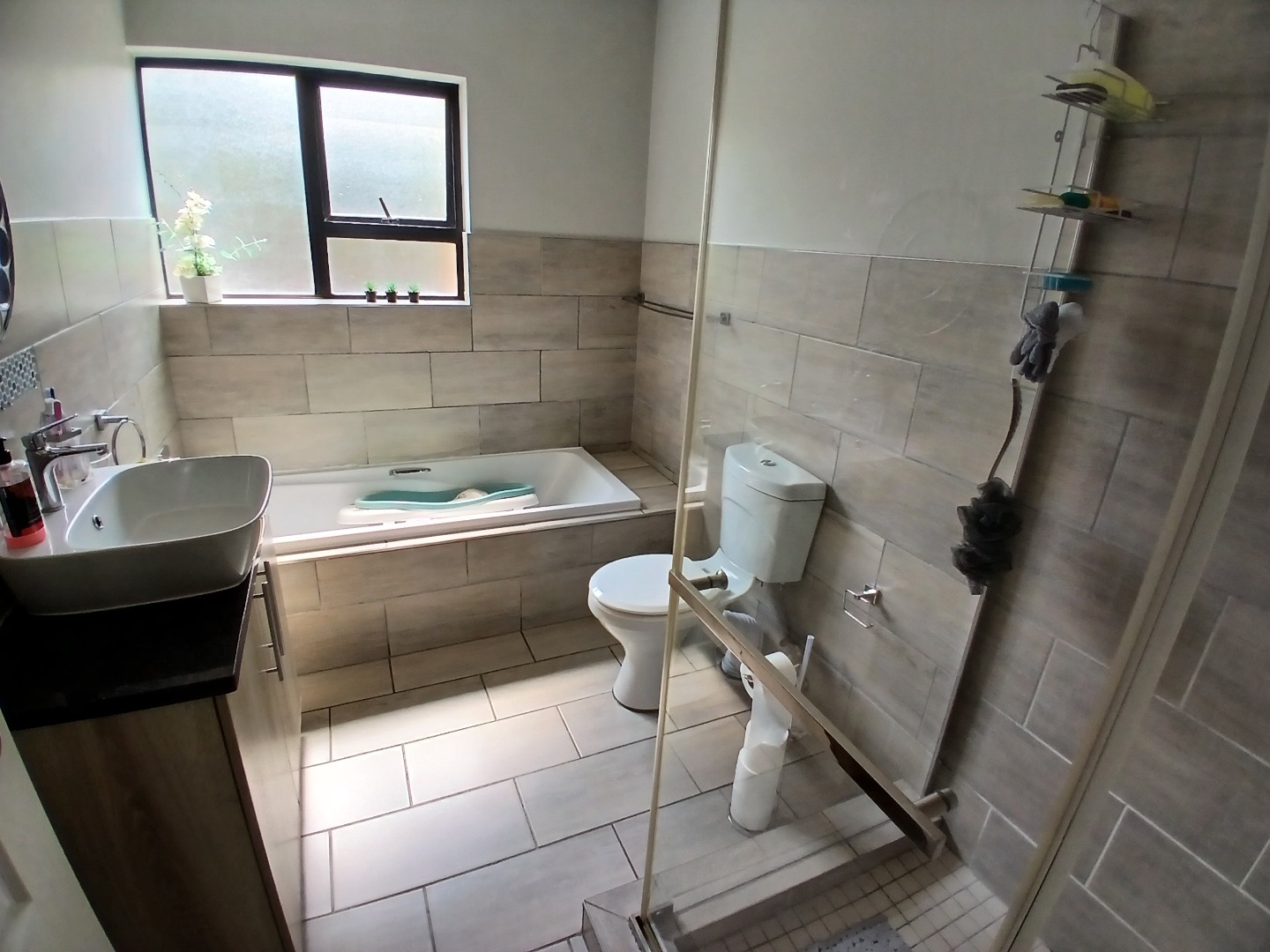 All three bedrooms are light and airy, each with built-in cupboards. The bathroom is fully tiled and well-equipped with a bath, shower, basin, and toilet.