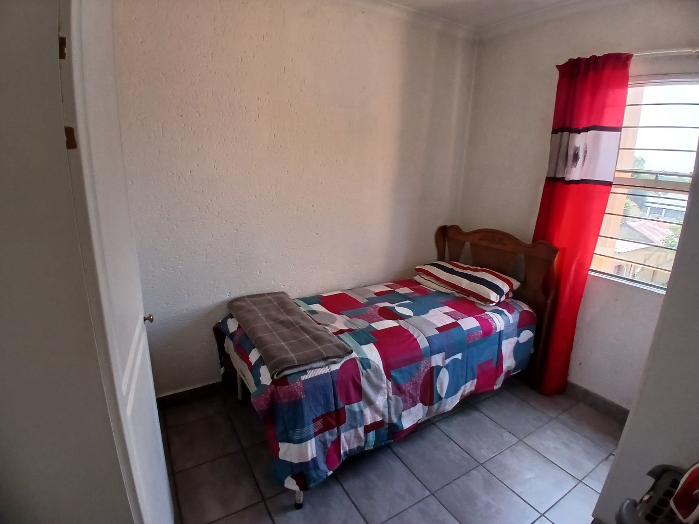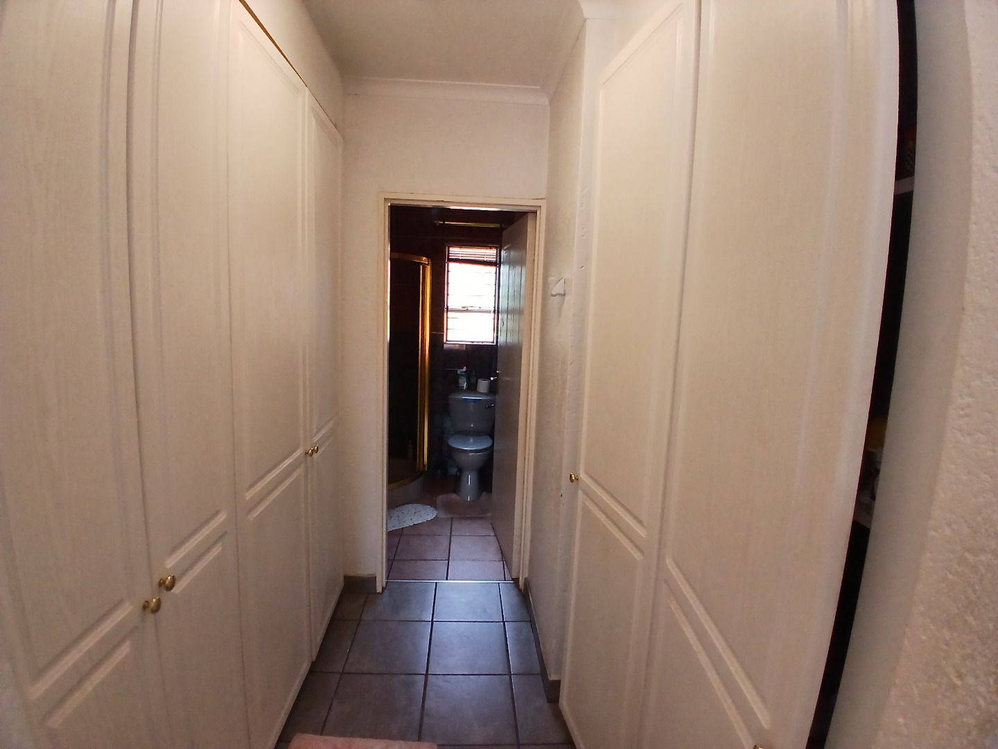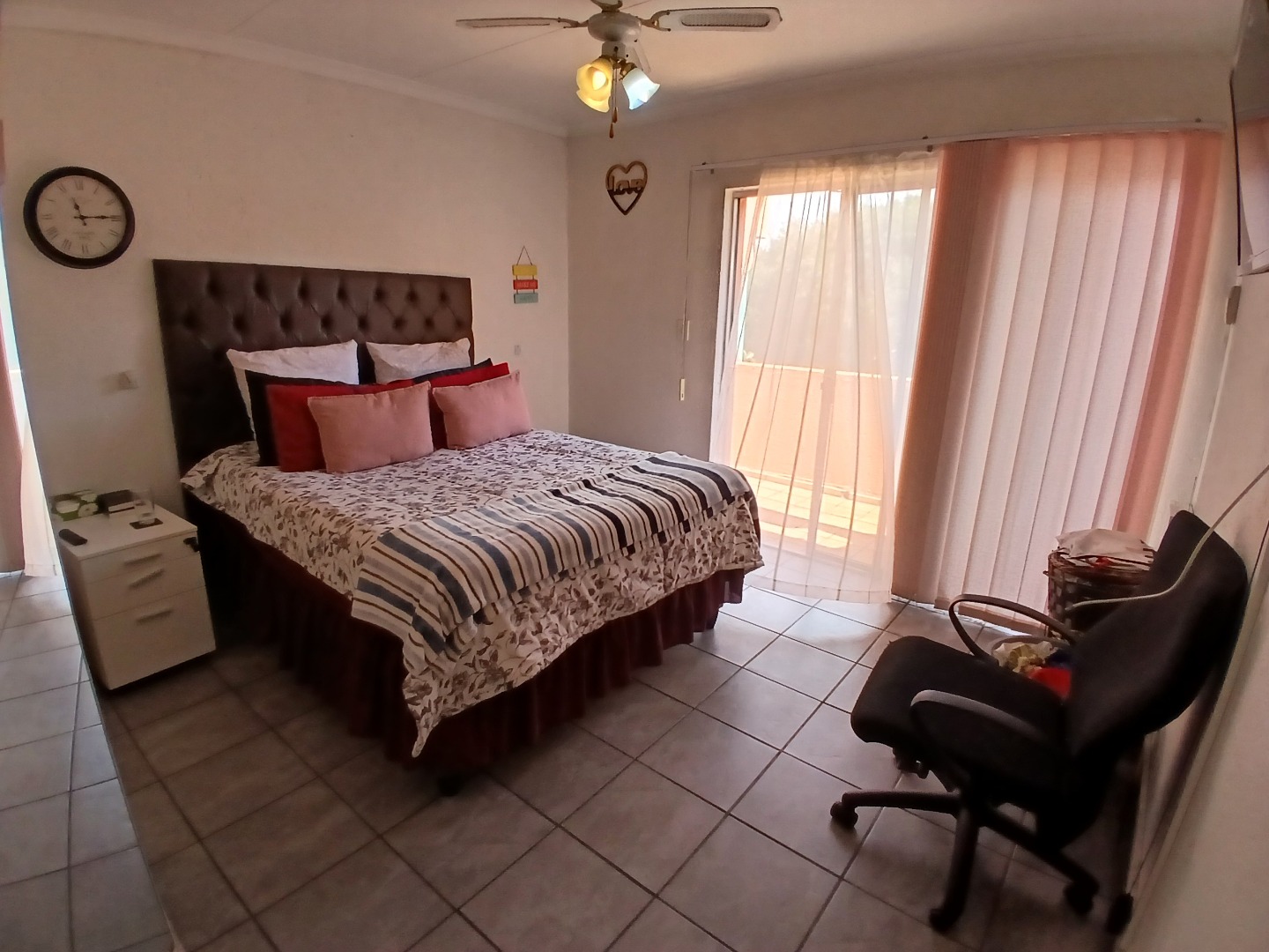All three bedrooms are tiled and fitted with built-in cupboards. The main bedroom is a standout feature, opening onto the patio and offering a walk-through closet leading to a private en-suite bathroom. A second bathroom, complete with a bath, basin, and toilet, services the remaining bedrooms.