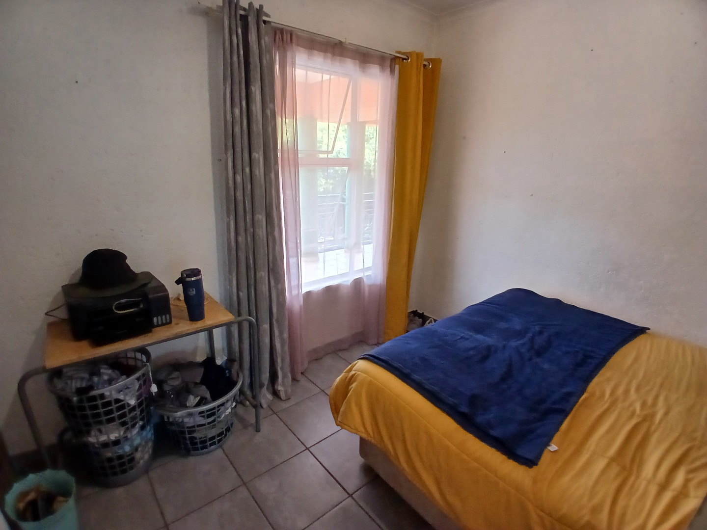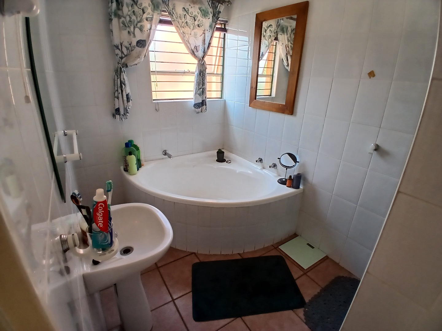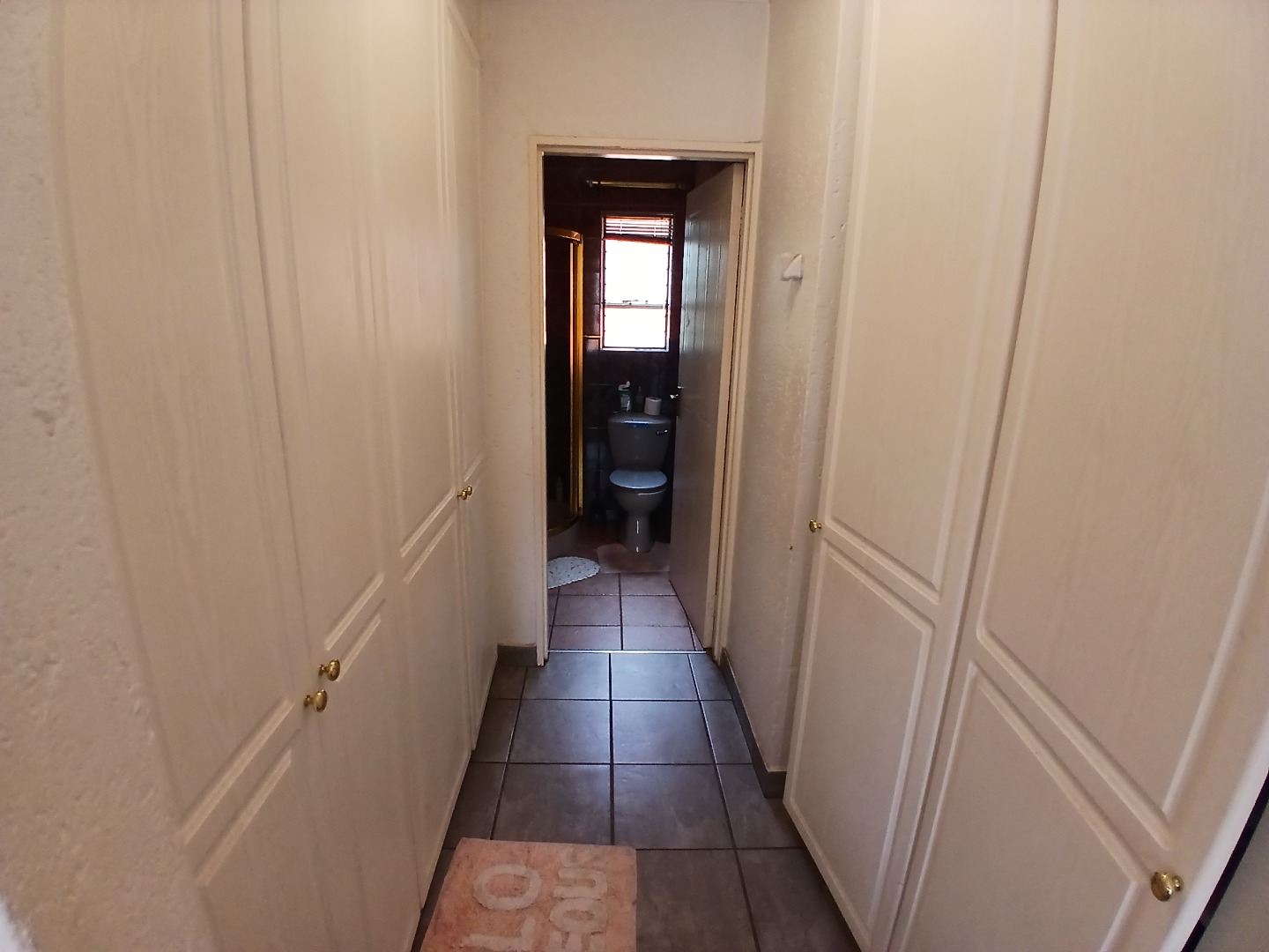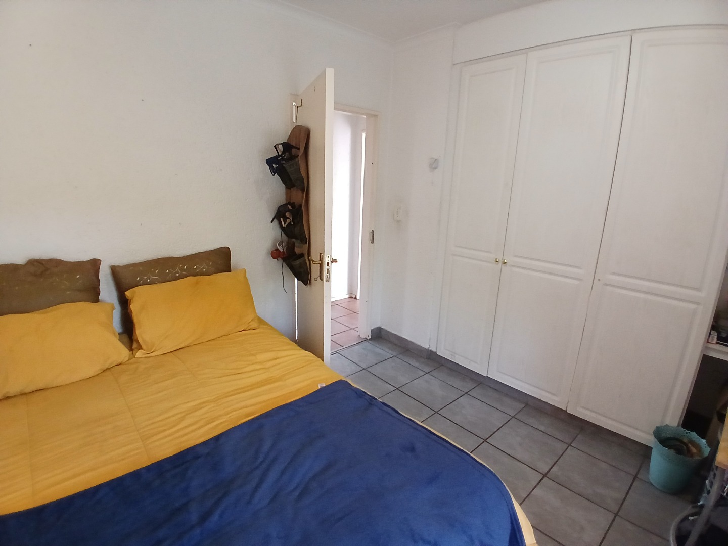 All three bedrooms are tiled and fitted with built-in cupboards. The main bedroom is a standout feature, opening onto the patio and offering a walk-through closet leading to a private en-suite bathroom. A second bathroom, complete with a bath, basin, and toilet, services the remaining bedrooms.