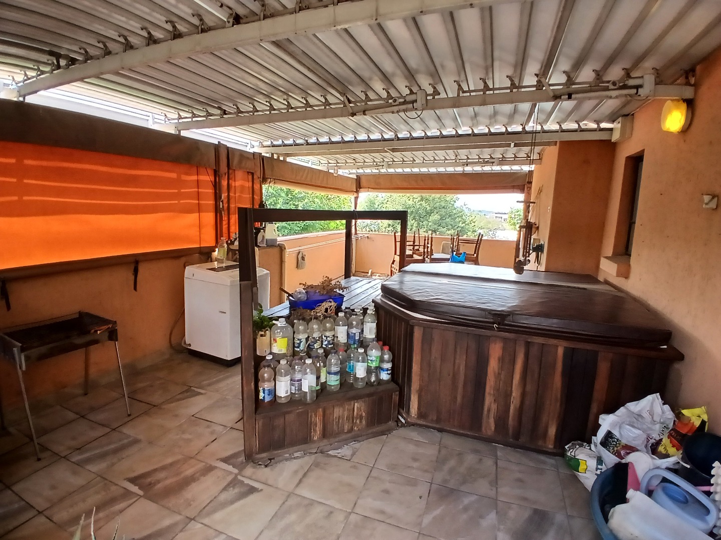 The patio area is partially enclosed and offers something truly special—featuring a sauna, a Wendy house, space for a washing machine, and plenty of room for entertaining guests.