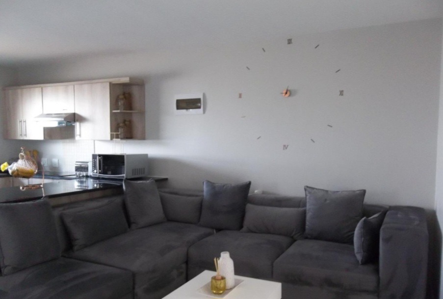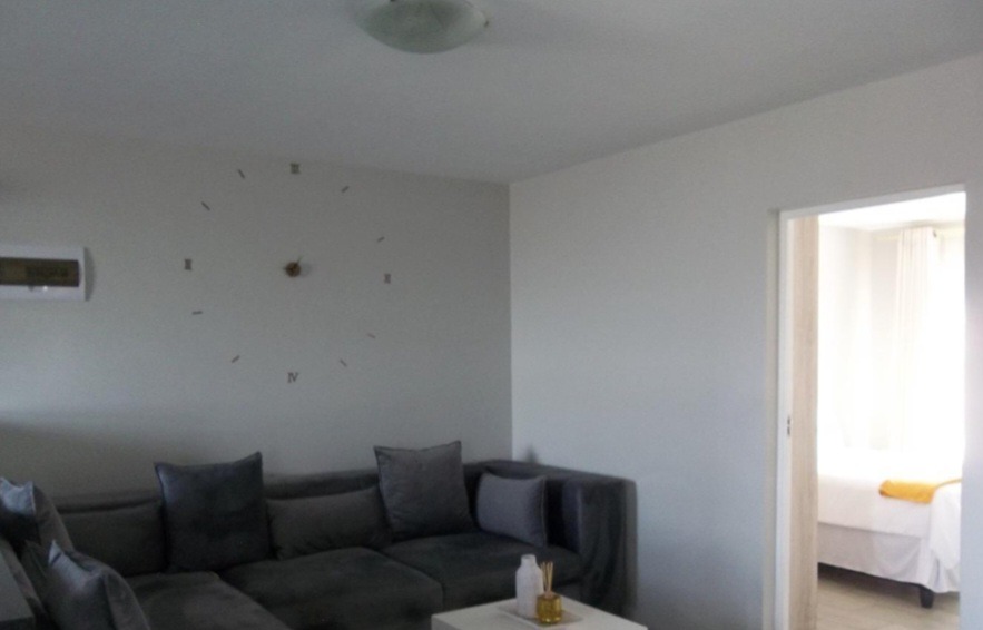 Step inside to an intelligently designed interior, where a spacious lounge provides an inviting atmosphere for entertaining or quiet contemplation. The contemporary kitchen is a culinary delight, boasting light wood-look cabinetry, sleek dark countertops, and integrated appliances including an oven, hob, and extractor fan. An open-concept flow seamlessly connects the living areas, enhanced by neutral wall tones and an air conditioning unit for year-round comfort. The three well-appointed bedrooms offer private havens, complemented by a stylishly finished bathroom.