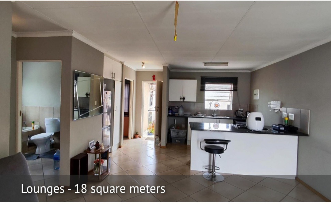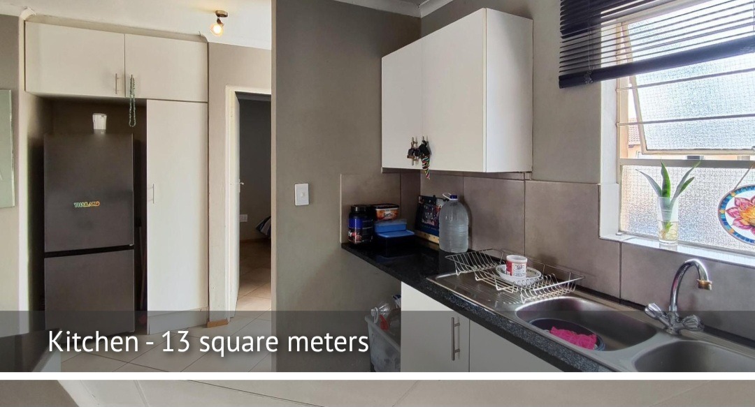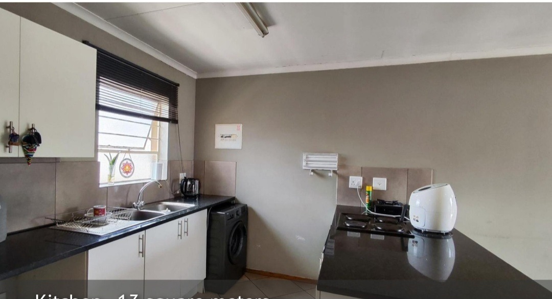 Step into this inviting 75 sqm apartment located in a cul-de-sac within the suburban Albertsdal complex. The open-plan design seamlessly connects the 18 sqm lounge and kitchen, creating a spacious and functional living area. The kitchen, spanning 13 sqm, features white overhead cabinets, dark countertops, a double stainless steel sink, and a tiled backsplash, complemented by a large window for natural light. Tiled flooring extends throughout the main living spaces.