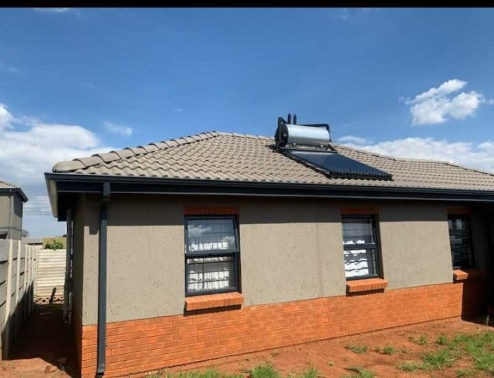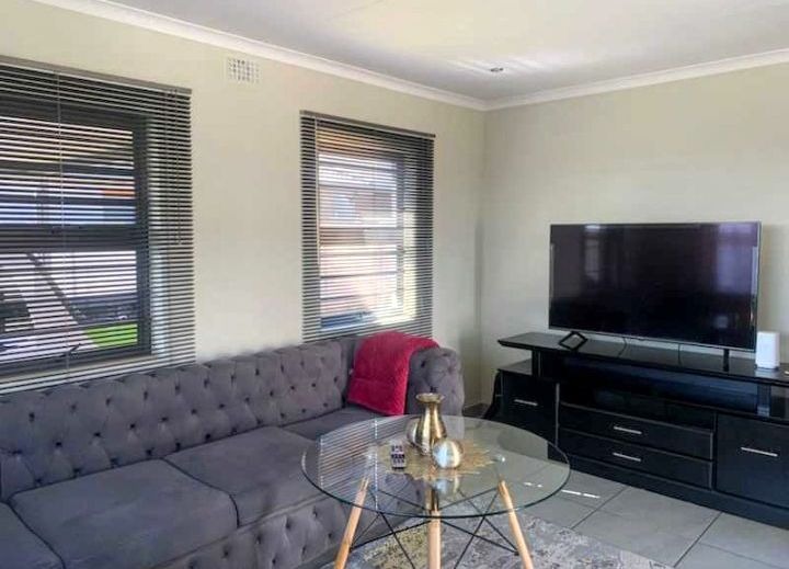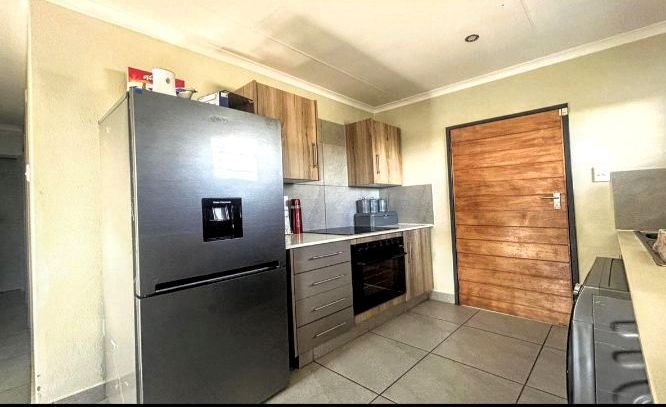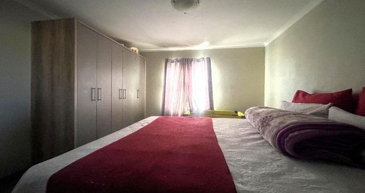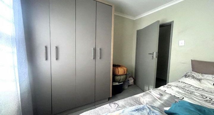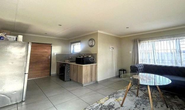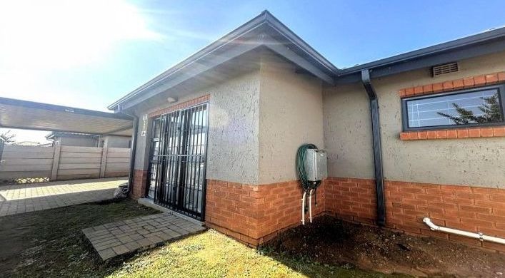 The open-plan lounge and fully fitted kitchen provide a practical, family-friendly layout, with sliding doors leading to a private, pet-friendly garden. The home also includes a solar geyser, prepaid electricity, and a carport that fits two vehicles.