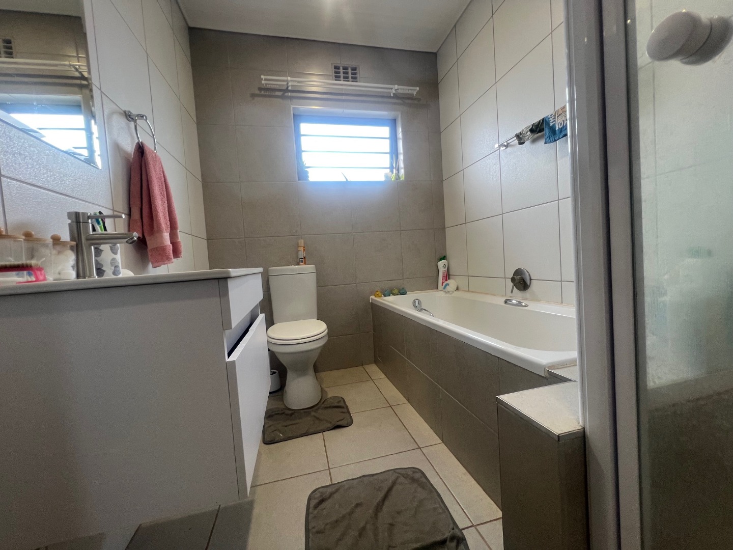 A second full bathroom services the remaining rooms and is fitted with a bath, shower, vanity, and toilet.