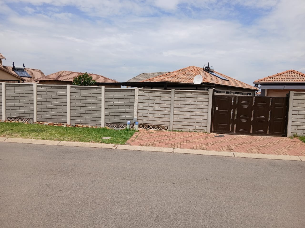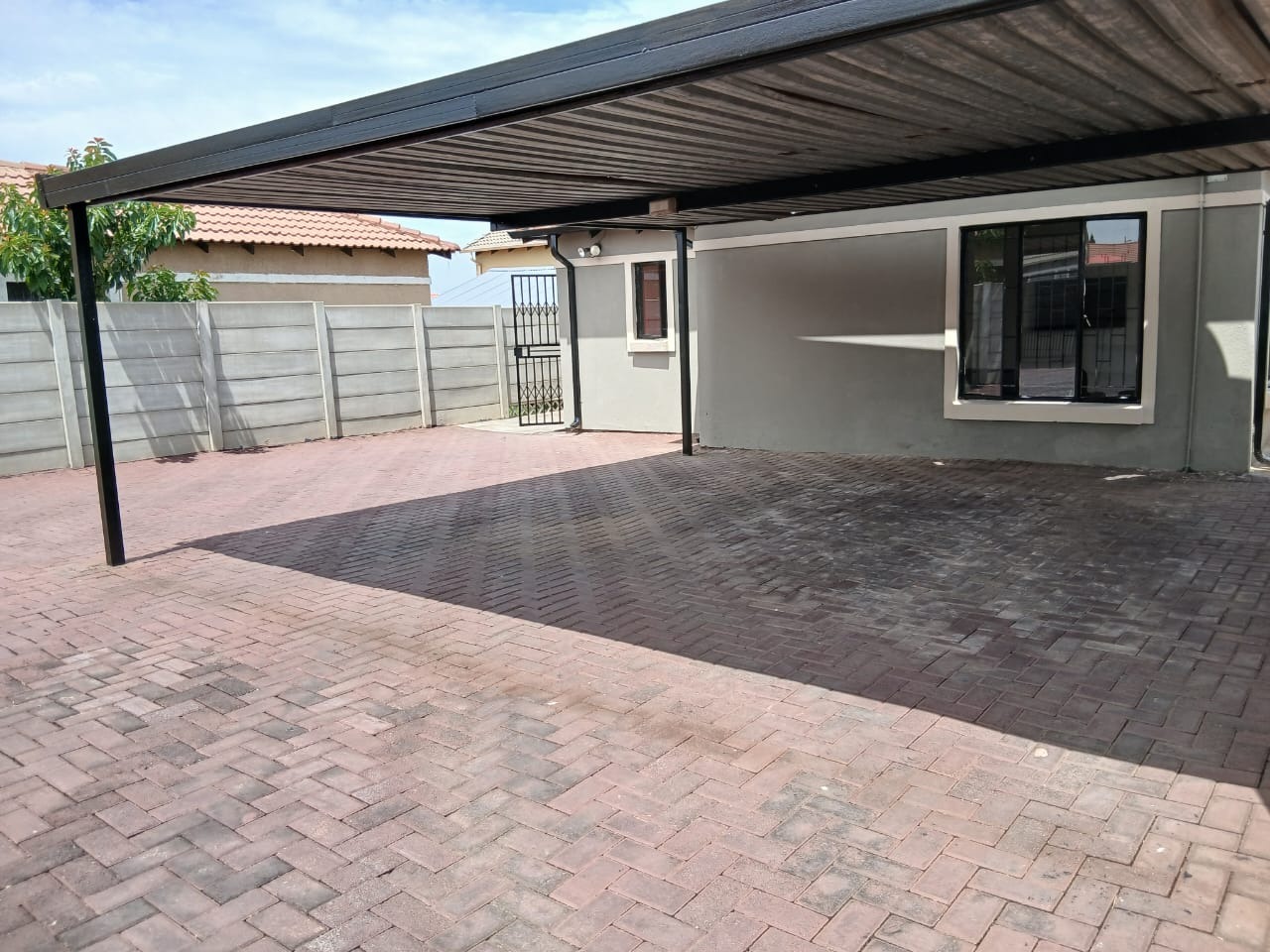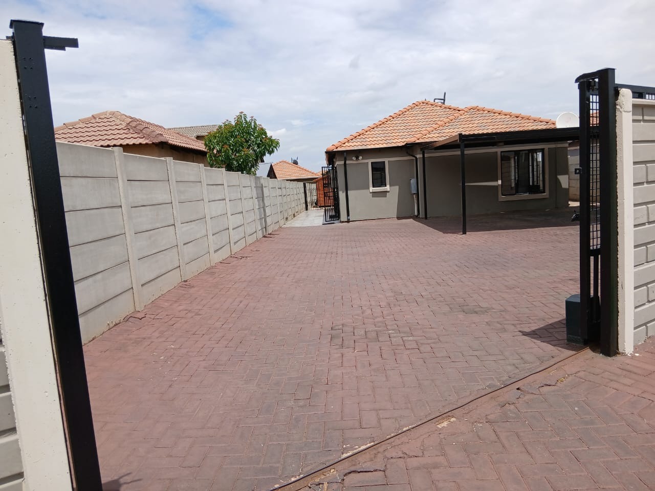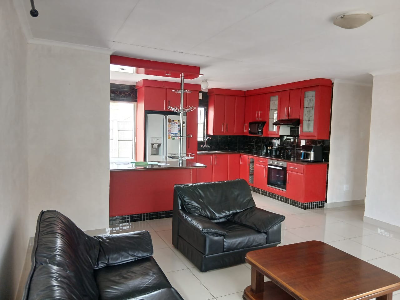 Discover this inviting 3-bedroom, 2-bathroom home situated in the suburban security estate of Albertsdal, Alberton. The property boasts excellent kerb appeal with an extensive paved driveway, secured by an automated sliding gate and tall concrete boundary walls, leading to a convenient covered carport. This ensures both privacy and ample parking. Step inside to an open-plan living and kitchen area, featuring modern, glossy tiled floors throughout for easy maintenance. The kitchen is a focal point with its bold red cabinetry, black countertops, integrated appliances, and a functional breakfast bar, creating a vibrant space for entertaining. The home is offered furnished, providing immediate comfort and convenience. Accommodation includes three comfortable bedrooms, with one offering the privacy of an en-suite bathroom. The second bathroom is fully tiled and includes a bathtub, toilet, and basin, along with space for a washing machine, catering to practical needs. Security is paramount, with features such as electric fencing, an alarm system, access gate, security post, burglar bars, and security gates, all contributing to a secure living environment within a 24-hour security estate. Sustainability is enhanced by a visible solar water heater. Albertsdal offers a desirable suburban lifestyle within Alberton, known for its community feel and convenient access to amenities. This property provides a secure and comfortable family home. Key Features: * 3 Bedrooms, 2 Bathrooms (1 en-suite) * Open-plan living and kitchen area * Modern red kitchen cabinetry with black countertops * Glossy tiled flooring throughout * Extensive paved driveway with covered carport * Automated sliding gate and concrete boundary walls * Enhanced security: electric fencing, alarm, burglar bars, security gates * 24-hour security estate * Solar water heater * Furnished property