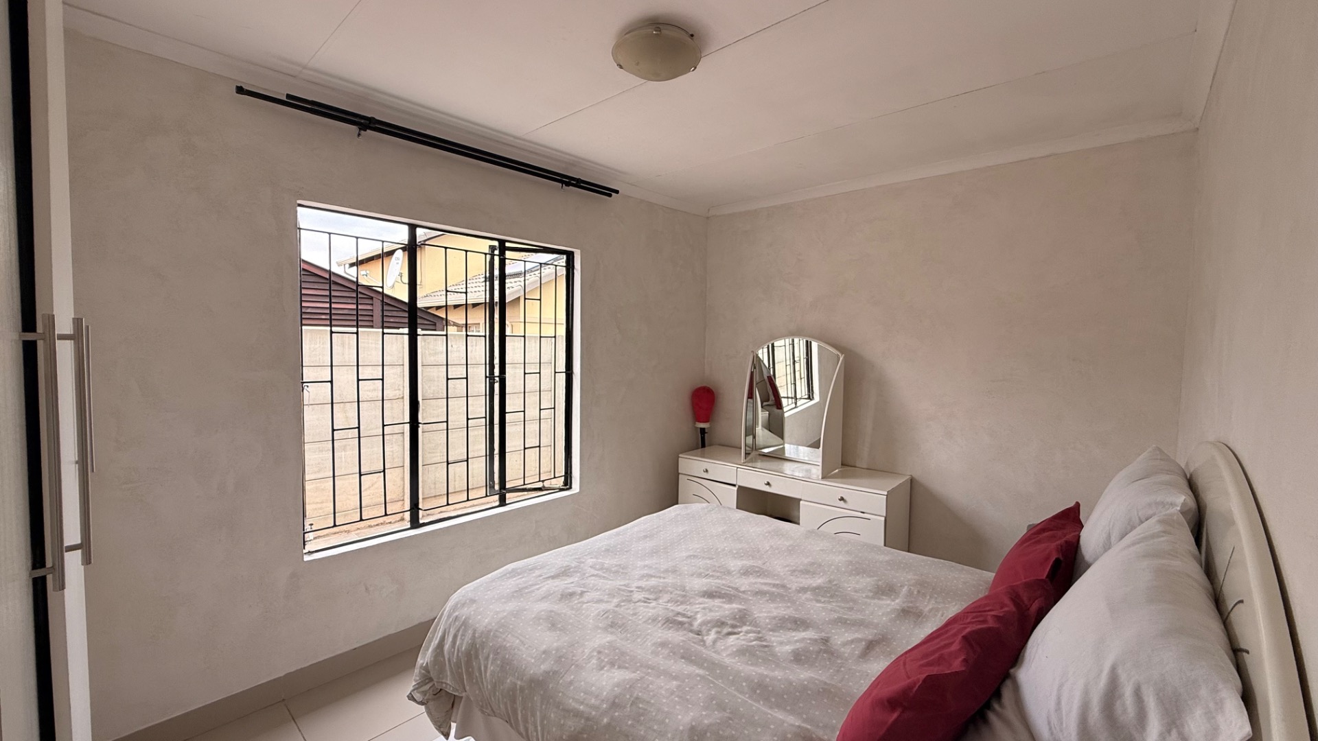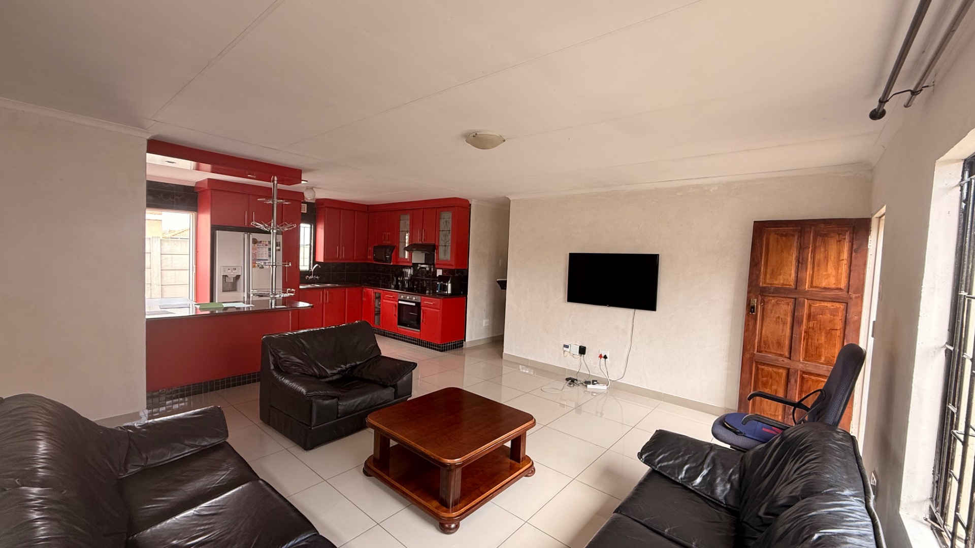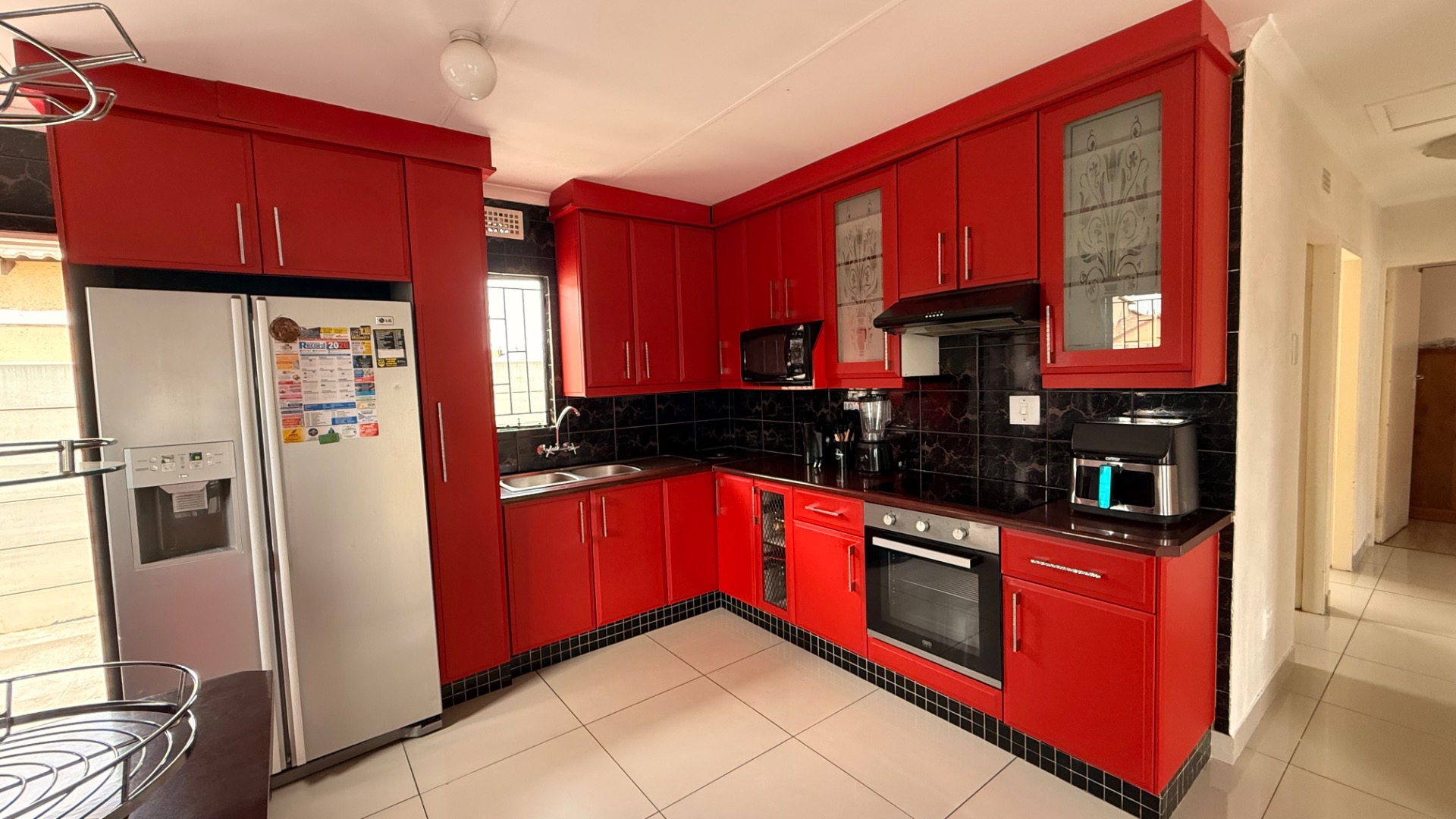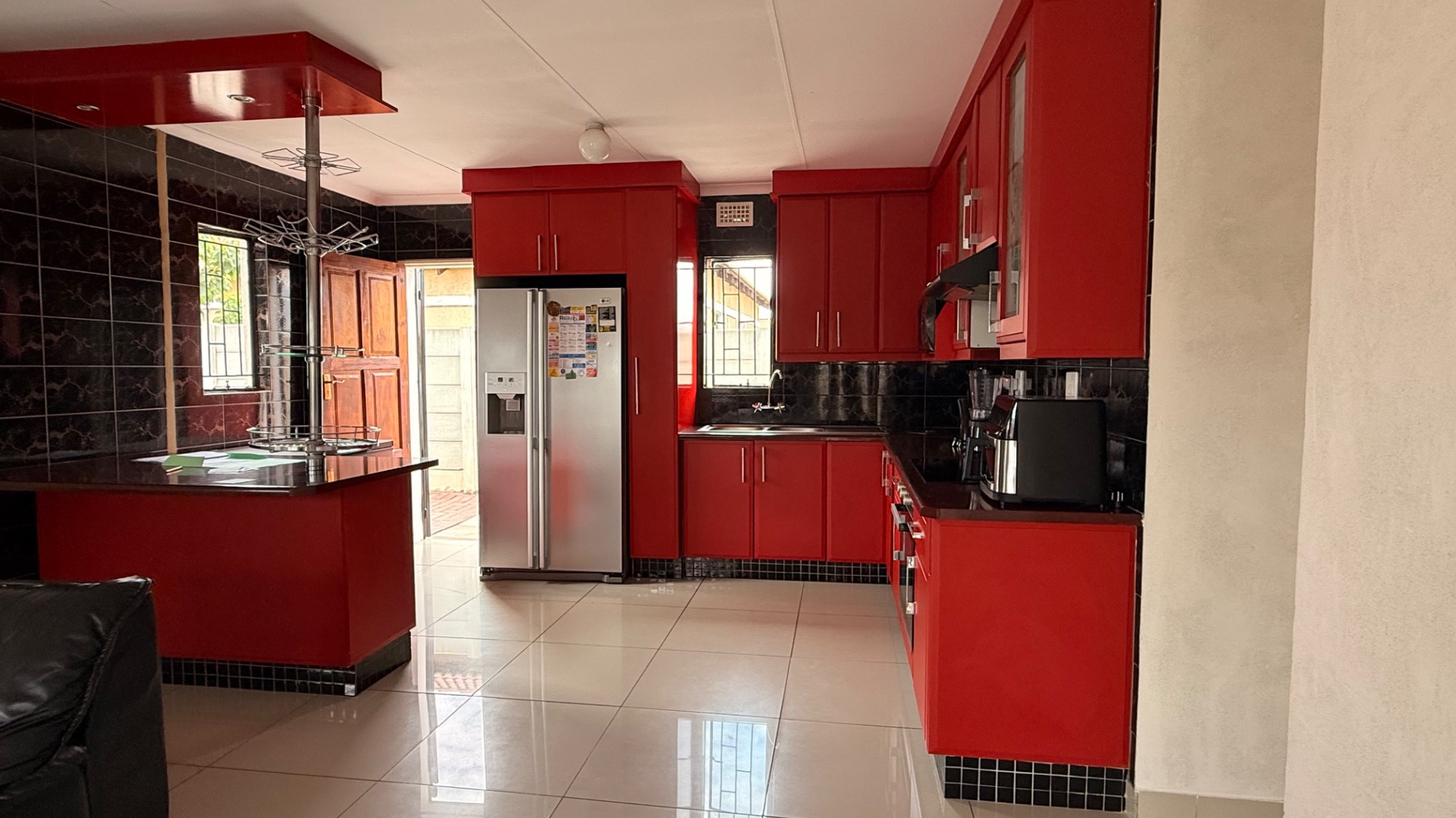 Discover secure estate living in this inviting 3-bedroom, 2-bathroom home located in Albertsdal, Alberton. The property boasts excellent kerb appeal with a compact, well-maintained exterior, a tiled roof, and a large paved front yard offering ample parking, complemented by a multi-car carport. Enhanced security features include concrete boundary walls, a gated entrance, burglar bars, and a security gate, all within an estate offering 24-hour security. Step inside to an open-plan living area seamlessly flowing into a modern kitchen. The kitchen is a highlight, featuring bold red cabinetry, sleek black countertops, a black tiled backsplash, and integrated appliances including an oven, microwave, and range hood. A convenient island/bar area provides additional counter space and seating, perfect for entertaining. The entire living space benefits from modern tiled flooring and good natural light. This home offers three comfortable bedrooms, each with tiled flooring and natural light from windows fitted with security bars. There are two bathrooms, with one being an en-suite, providing practical amenities. The main bathroom includes a bathtub and dedicated space for a washing machine. Ideal for those seeking a secure and functional family home, this property allows pets and combines modern living with peace of mind in the Albertsdal area.