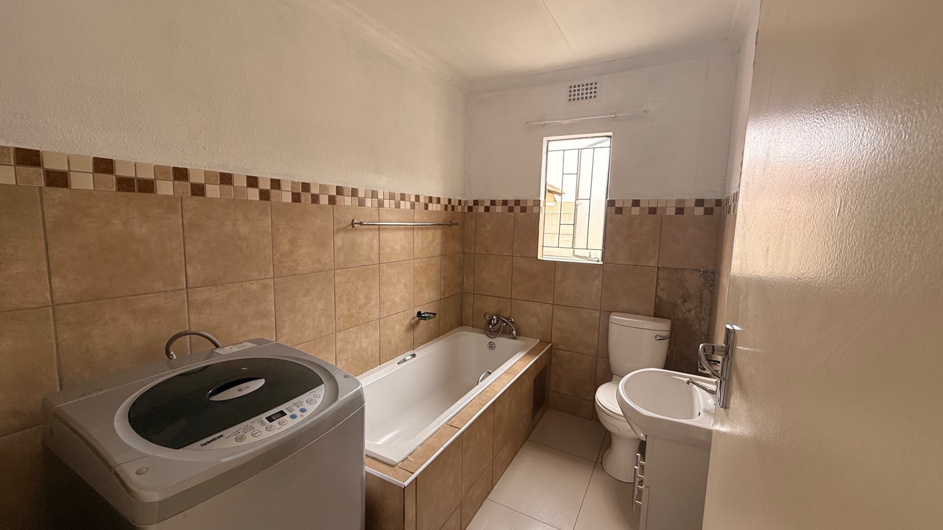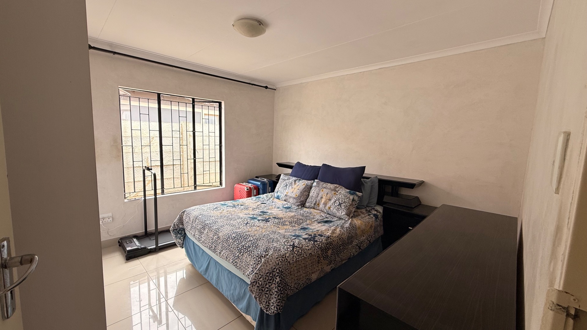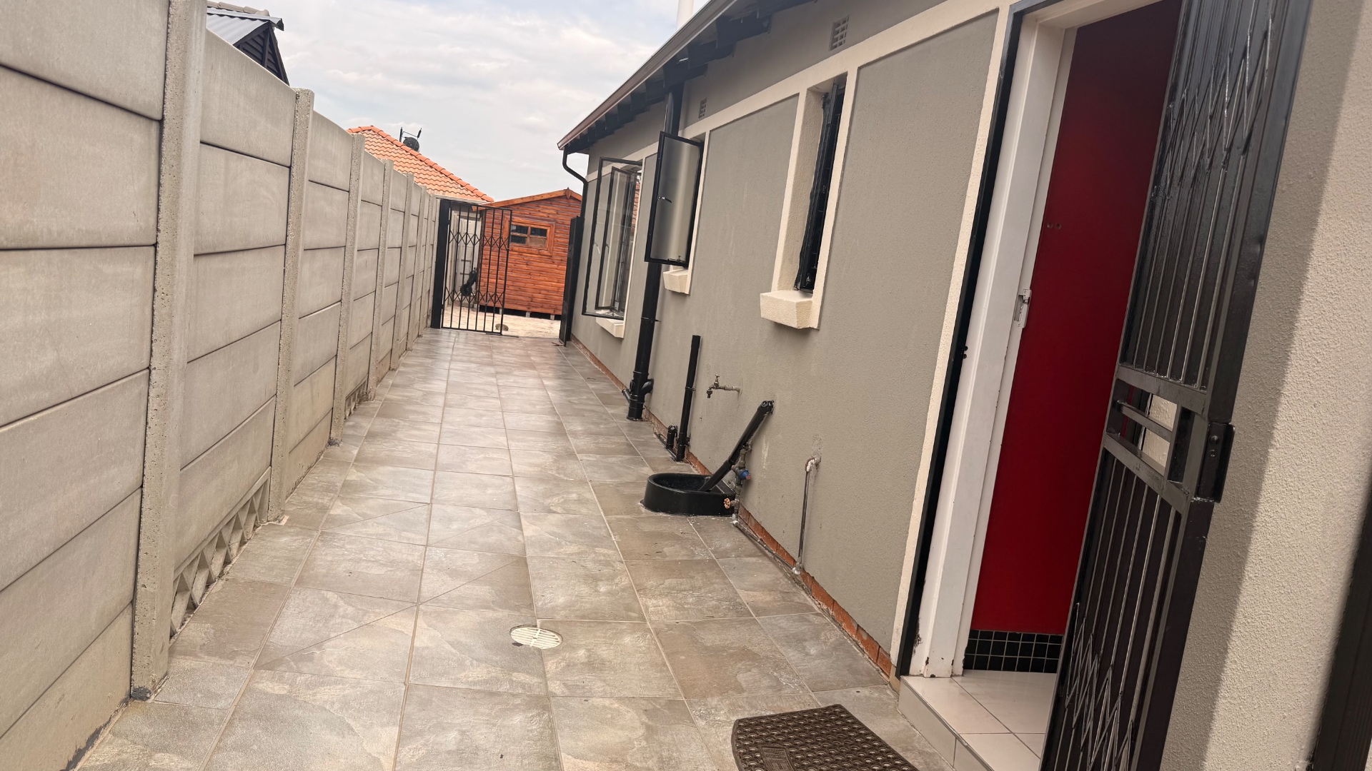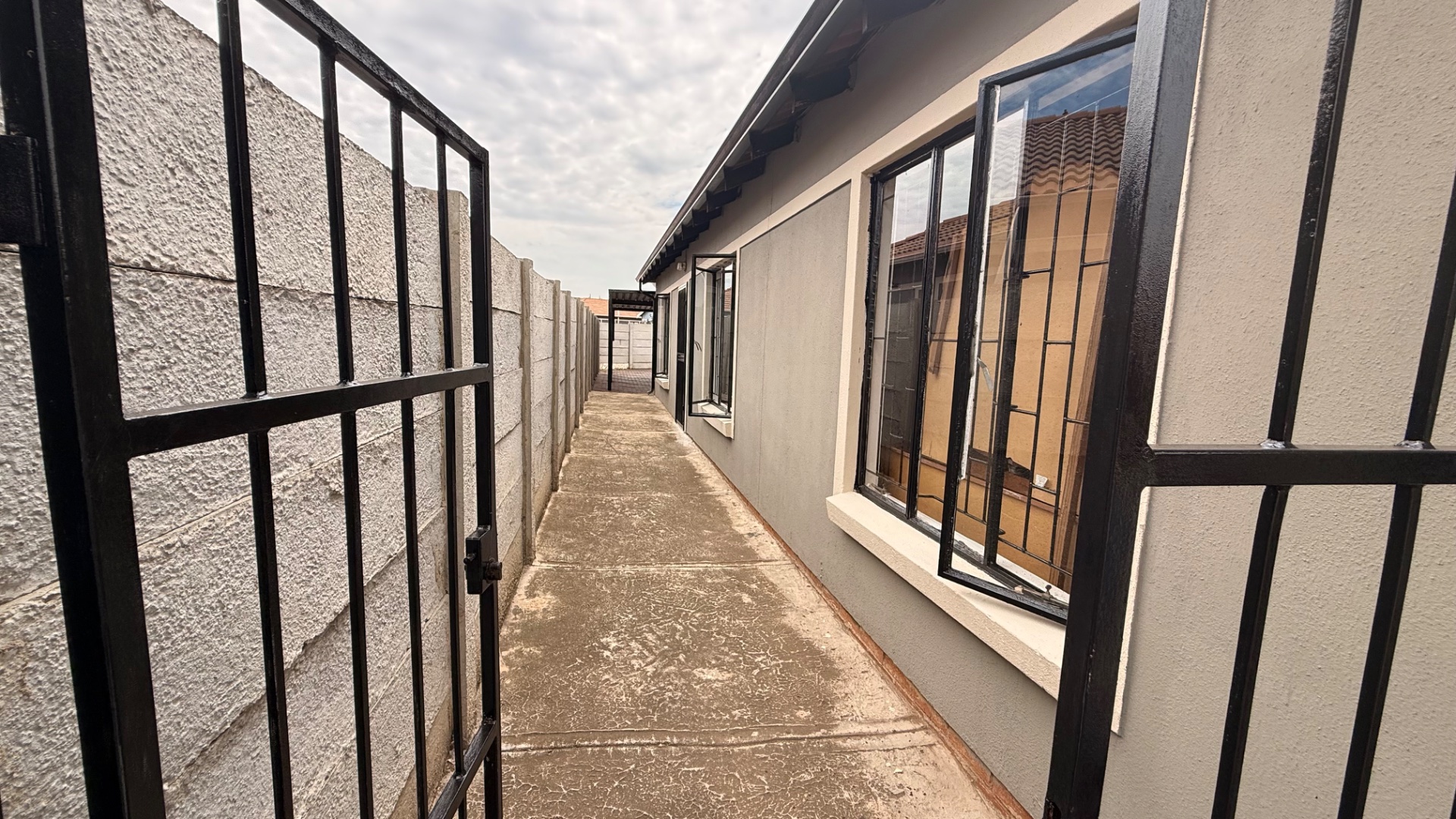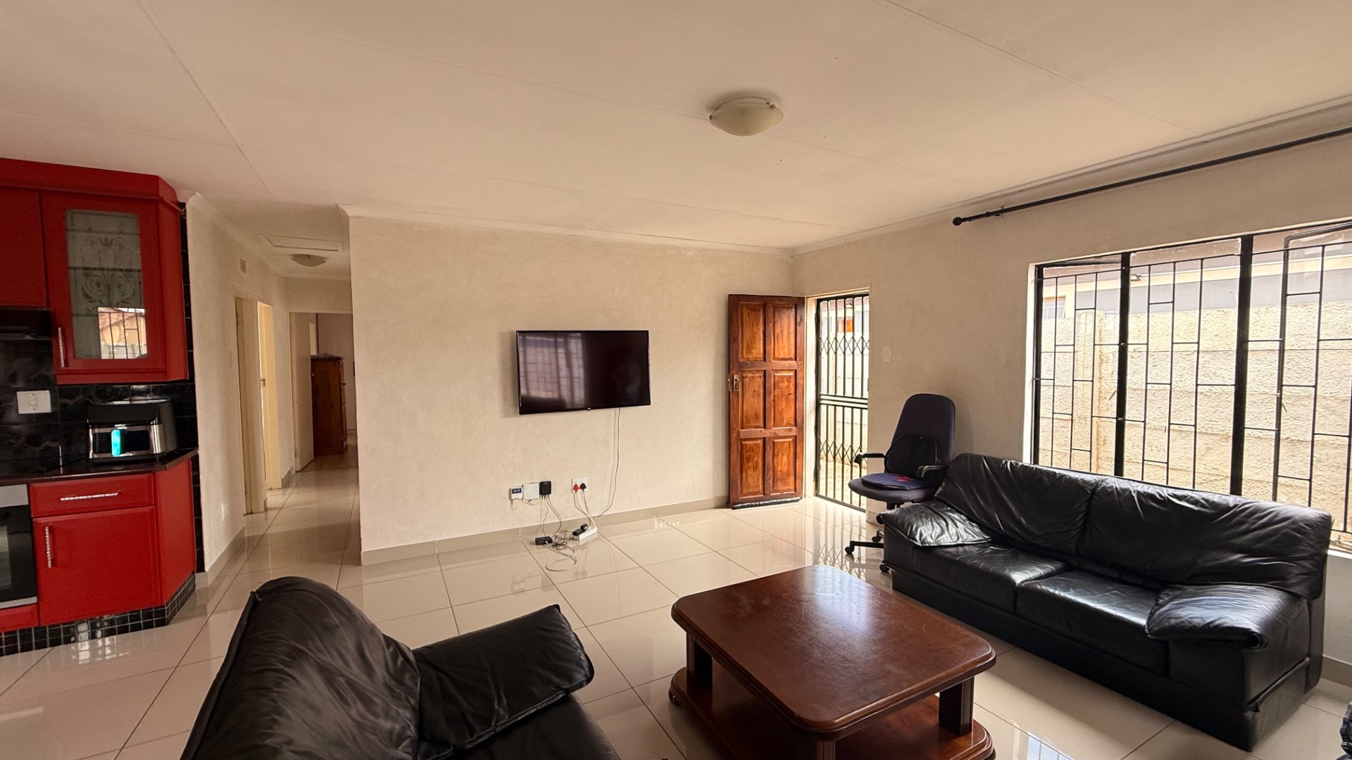 Discover secure estate living in this inviting 3-bedroom, 2-bathroom home located in Albertsdal, Alberton. The property boasts excellent kerb appeal with a compact, well-maintained exterior, a tiled roof, and a large paved front yard offering ample parking, complemented by a multi-car carport. Enhanced security features include concrete boundary walls, a gated entrance, burglar bars, and a security gate, all within an estate offering 24-hour security. Step inside to an open-plan living area seamlessly flowing into a modern kitchen. The kitchen is a highlight, featuring bold red cabinetry, sleek black countertops, a black tiled backsplash, and integrated appliances including an oven, microwave, and range hood. A convenient island/bar area provides additional counter space and seating, perfect for entertaining. The entire living space benefits from modern tiled flooring and good natural light. This home offers three comfortable bedrooms, each with tiled flooring and natural light from windows fitted with security bars. There are two bathrooms, with one being an en-suite, providing practical amenities. The main bathroom includes a bathtub and dedicated space for a washing machine. Ideal for those seeking a secure and functional family home, this property allows pets and combines modern living with peace of mind in the Albertsdal area.