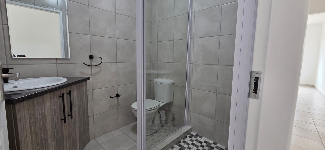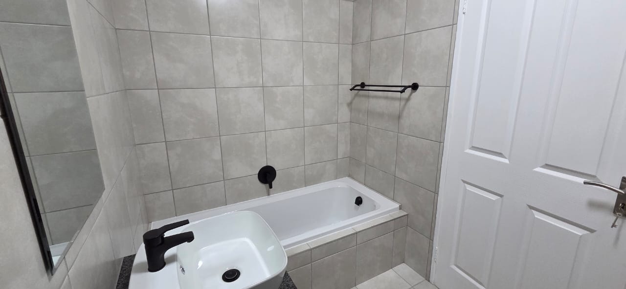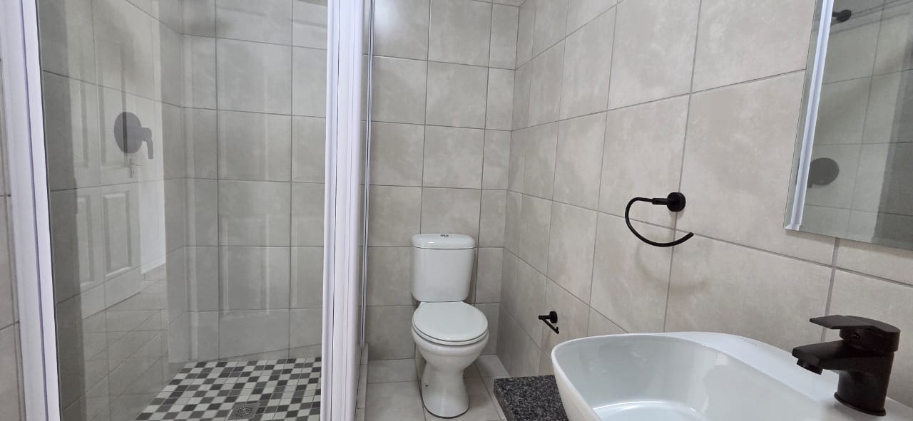 The home offers two well-proportioned bedrooms, each complete with built-in cupboards for optimal storage. The main bedroom includes a stylish en-suite bathroom with a shower, basin, and toilet, while the second bathroom is a full, beautifully finished family bathroom.