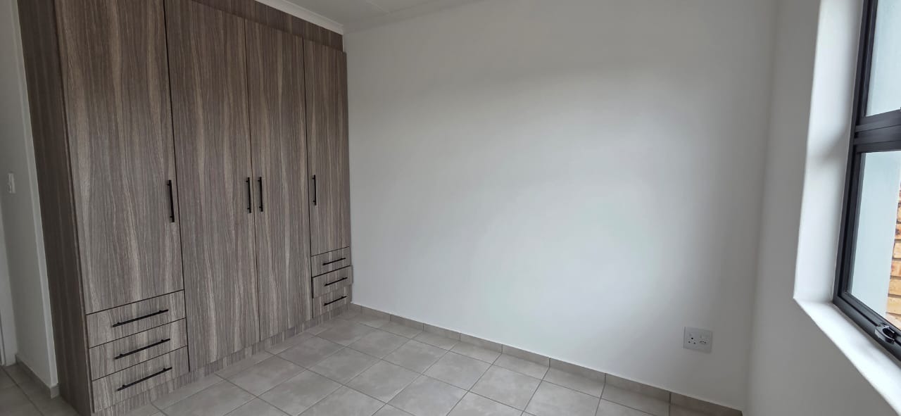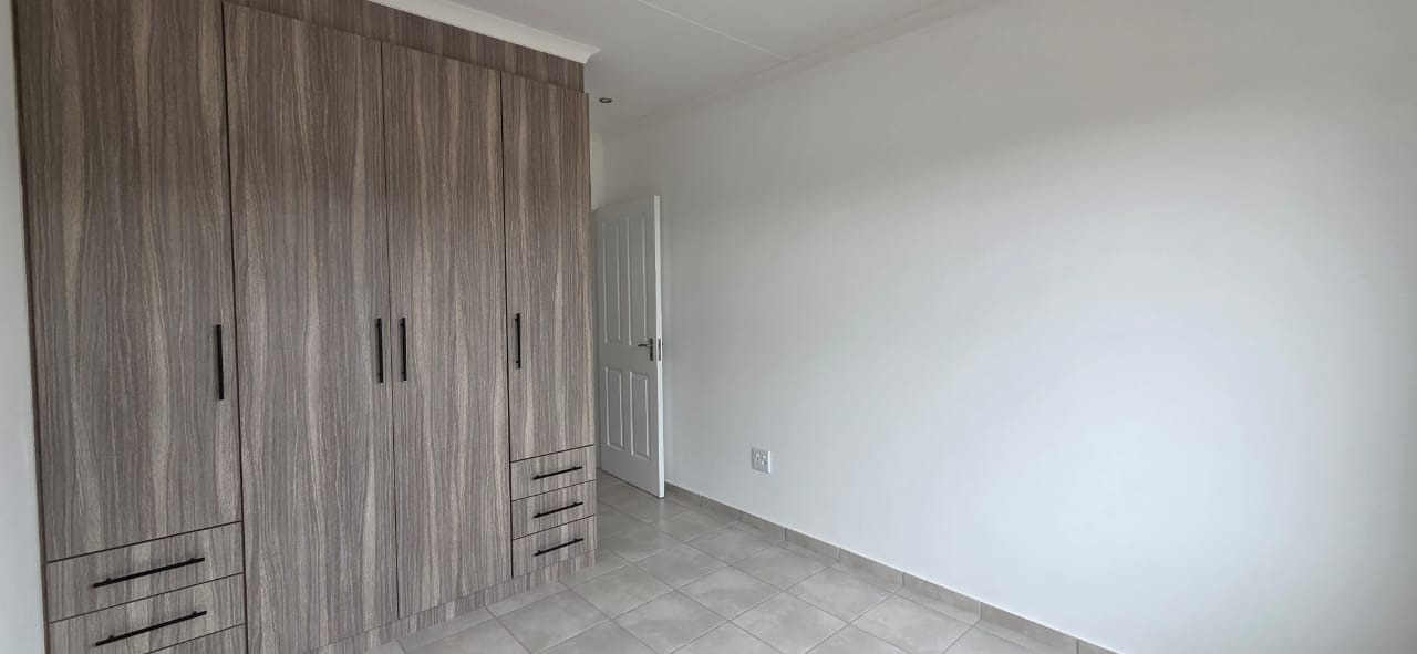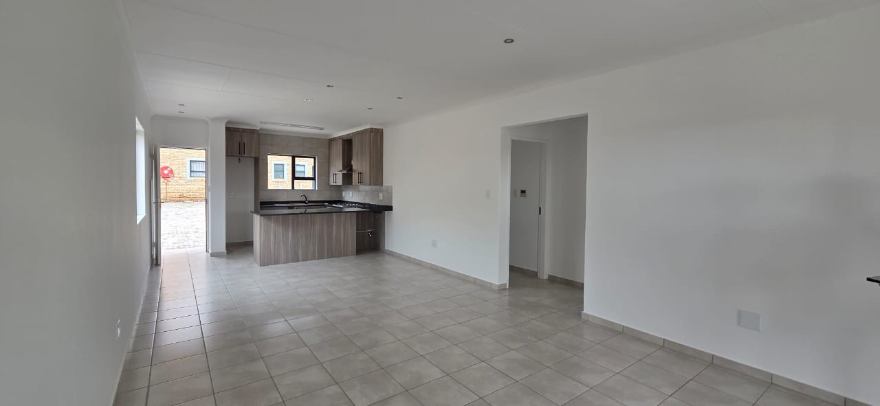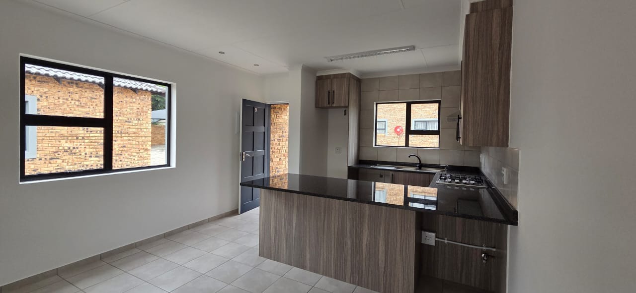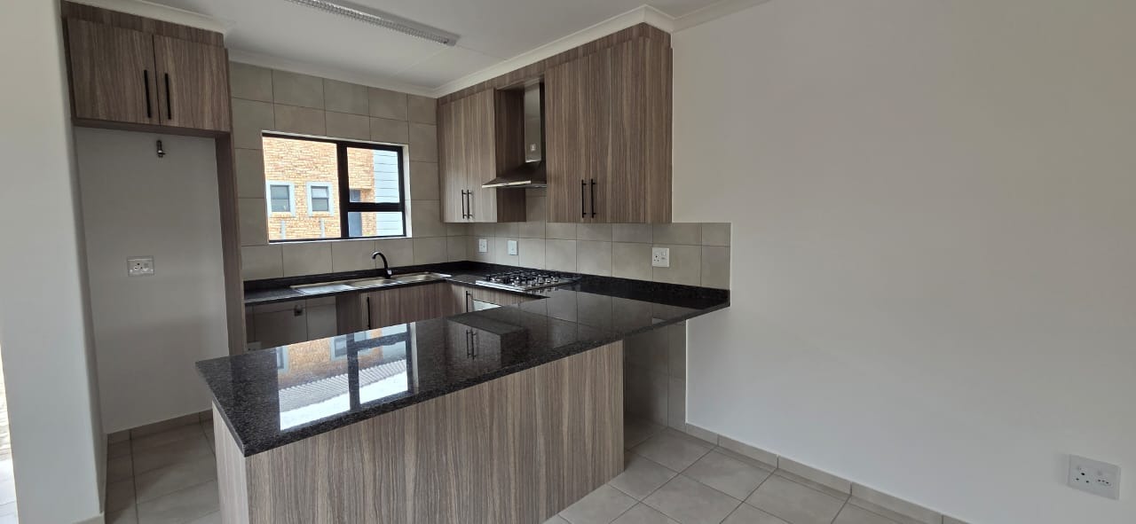 As you enter, you’re welcomed by a bright and spacious open-plan living area that exudes warmth and flow. The modern kitchen is a standout feature — fitted with granite countertops, ample cabinetry, and a gas hob to bring both elegance and efficiency to your cooking experience. The dining and lounge area opens seamlessly onto a covered patio with a built-in braai, overlooking a private L-shaped garden — the perfect space for entertaining or simply unwinding at the end of the day.