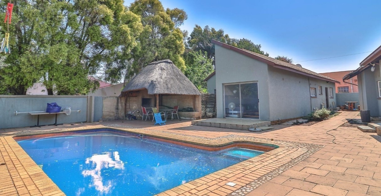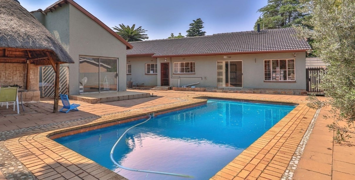 Outdoor living is elevated by a sparkling private swimming pool, offering a serene escape for leisure and recreation within your own grounds. The expansive erf provides ample space for outdoor pursuits, while the property benefits from two secure garages, ensuring convenient and protected parking for vehicles. Pets are warmly welcomed, making this an ideal family residence.