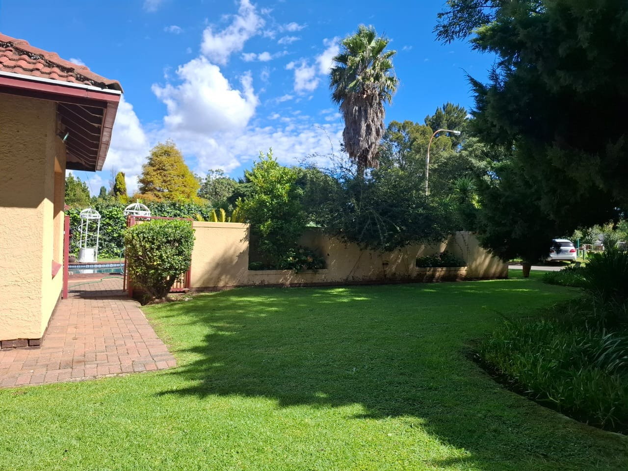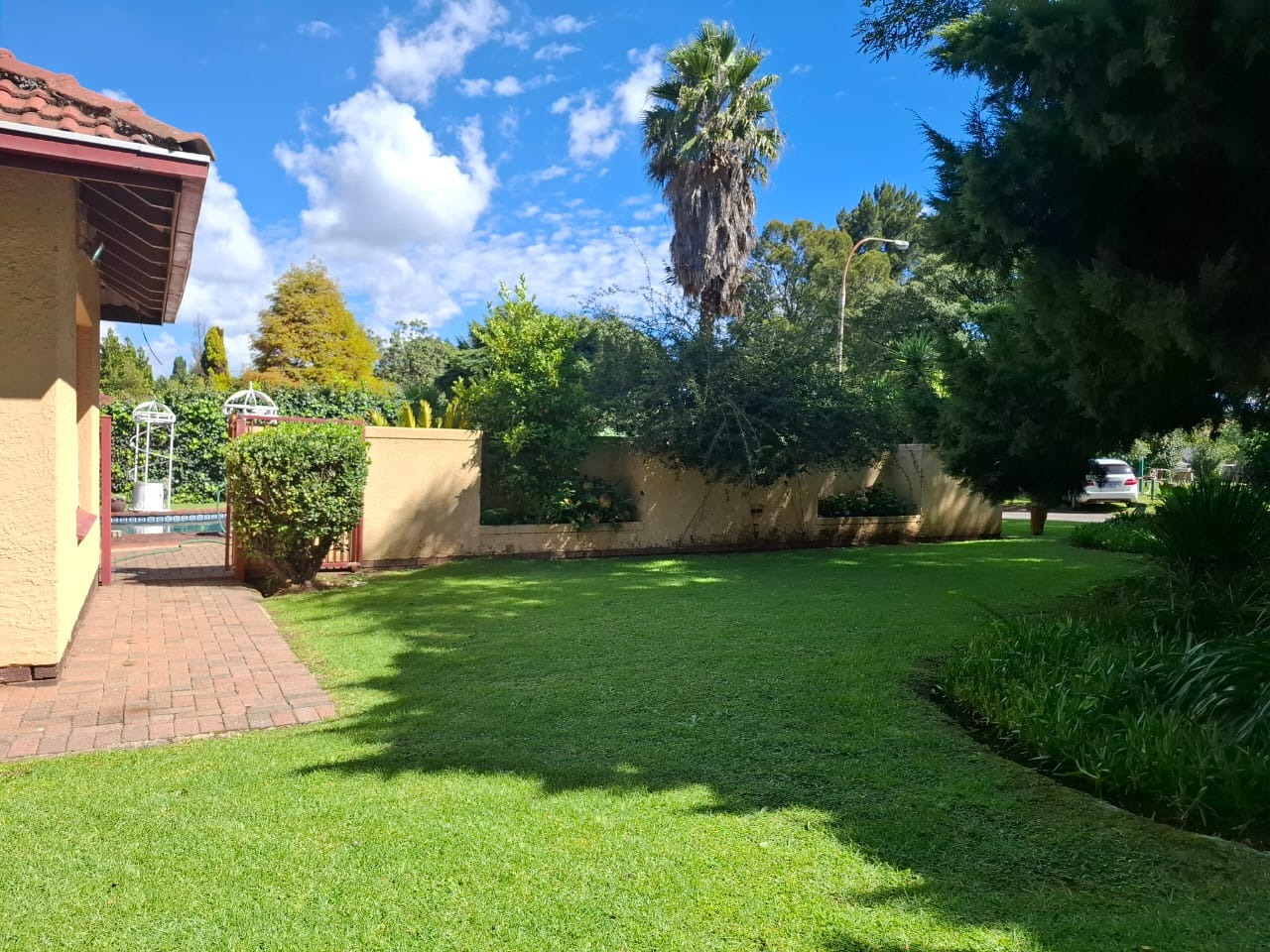 Accommodation includes three comfortable bedrooms and two bathrooms, with the main bedroom benefiting from a private en-suite for added convenience. Outside, residents can enjoy a refreshing swimming pool and a charming thatch area with a built-in braai, ideal for entertaining guests. A double garage and ample secure parking, including additional gated space, ensure convenience for residents and visitors alike.